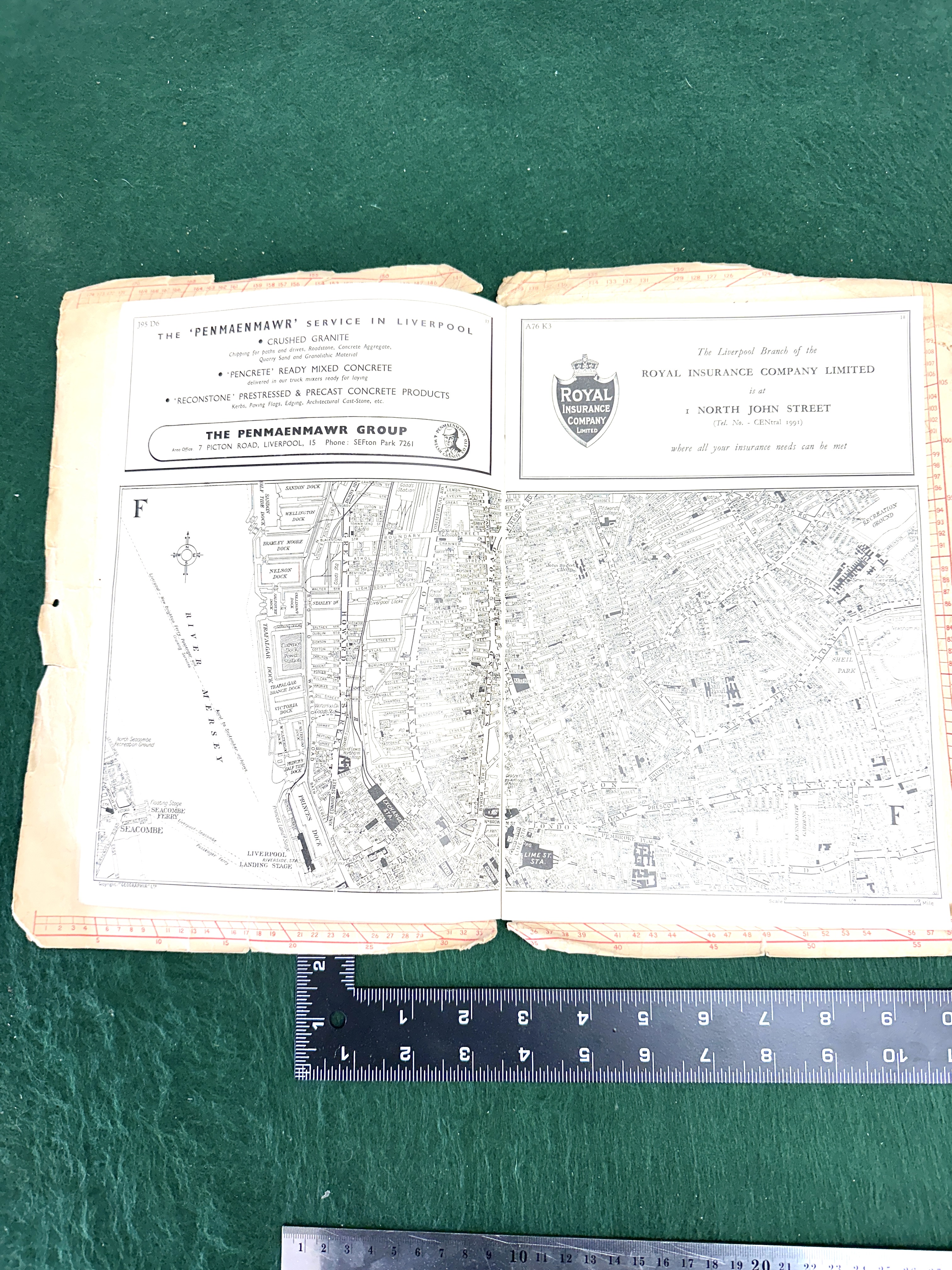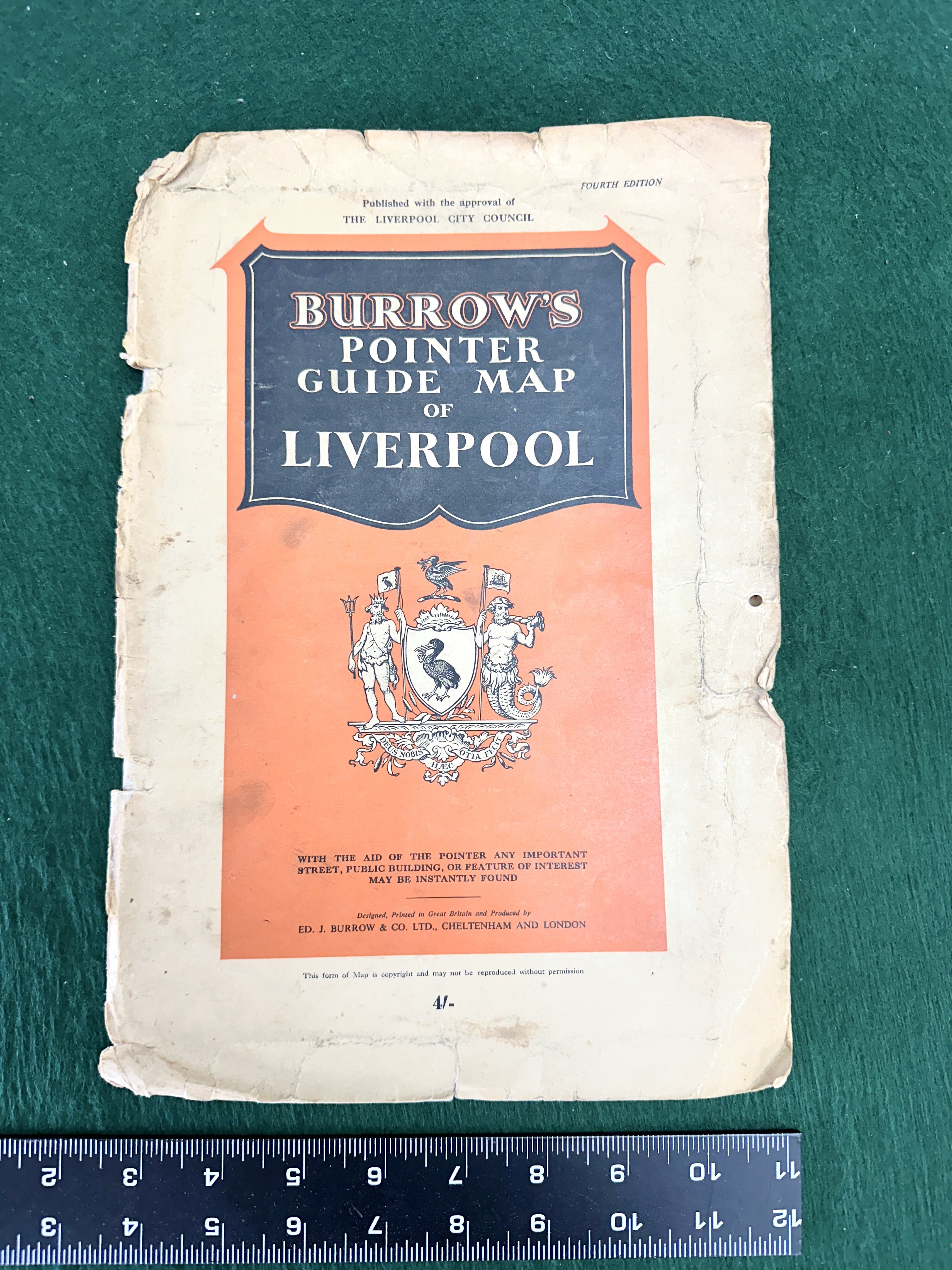 A mid-20th century street and dock guide map titled Burrow’s Pointer Guide Map of Liverpool, Fourth Edition. The publication was produced by Ed. J. Burrow and Co. Ltd. of Cheltenham and London with the official approval of the Liverpool City Council. The front cover is printed in an orange, black, and white colour scheme and features the Liverpool city coat of arms. The interior contains a folding black and white street map showing the city centre and the River Mersey docks, including landmarks such as Lime Street Station and various named docks including Sandon, Wellington, and Bramley Moore. The guide includes period advertisements for the Penmaenmawr Group and the Royal Insurance Company Limited. The front cover bears a printed price of 4/-.