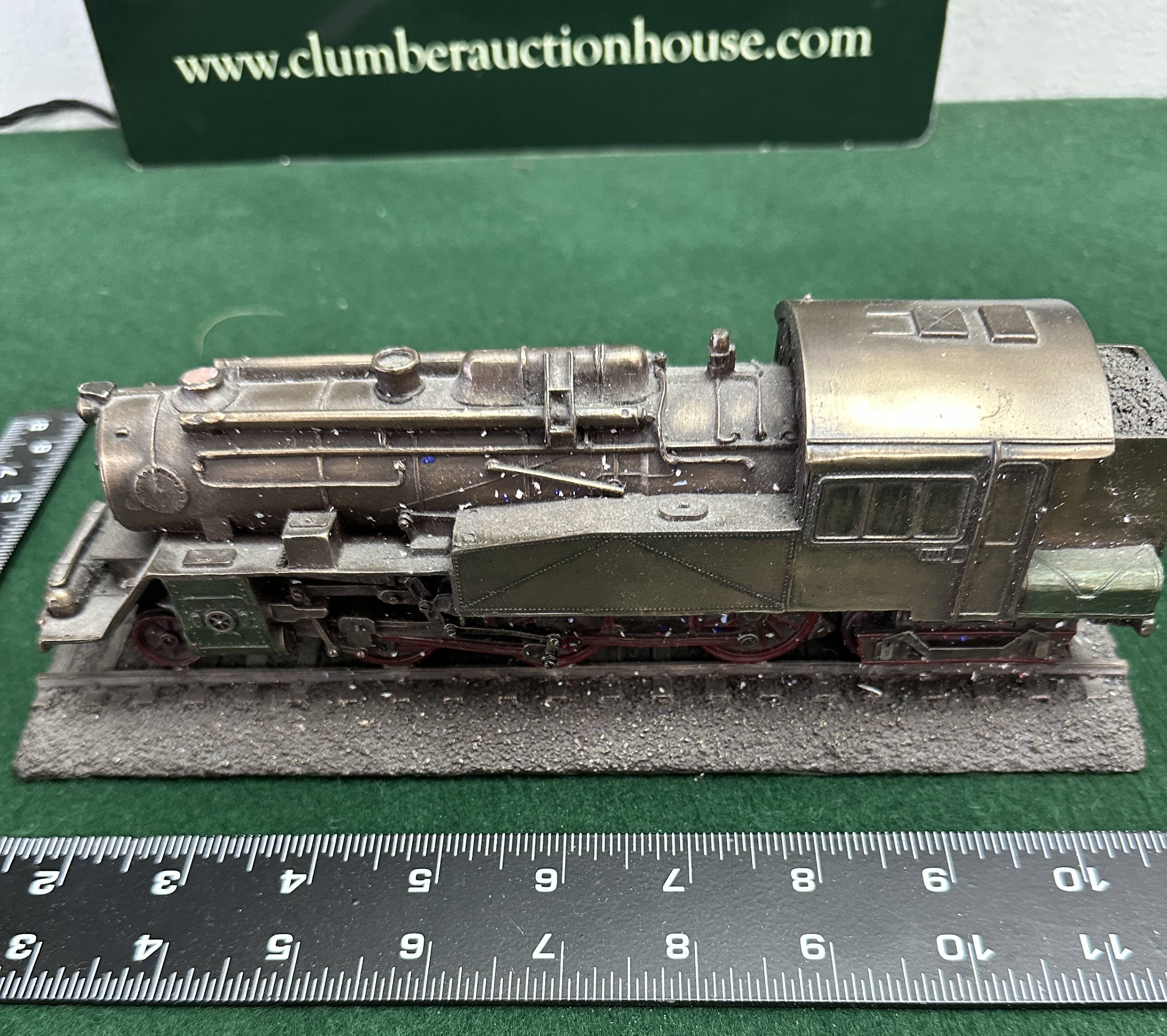 A static display model of a steam locomotive, presented as a decorative desk ornament. The model depicts a tank engine, resembling a German BR 77 or similar 2-10-2 configuration, mounted on an integrated textured base representing a section of railway track and ballast. The item is constructed from a cast material, likely cold-cast resin or metal, featuring a burnished bronze-effect finish. Subtle painted accents are present, including green on the cylinders and red on the wheels and chassis. No manufacturer marks or inscriptions are visible.