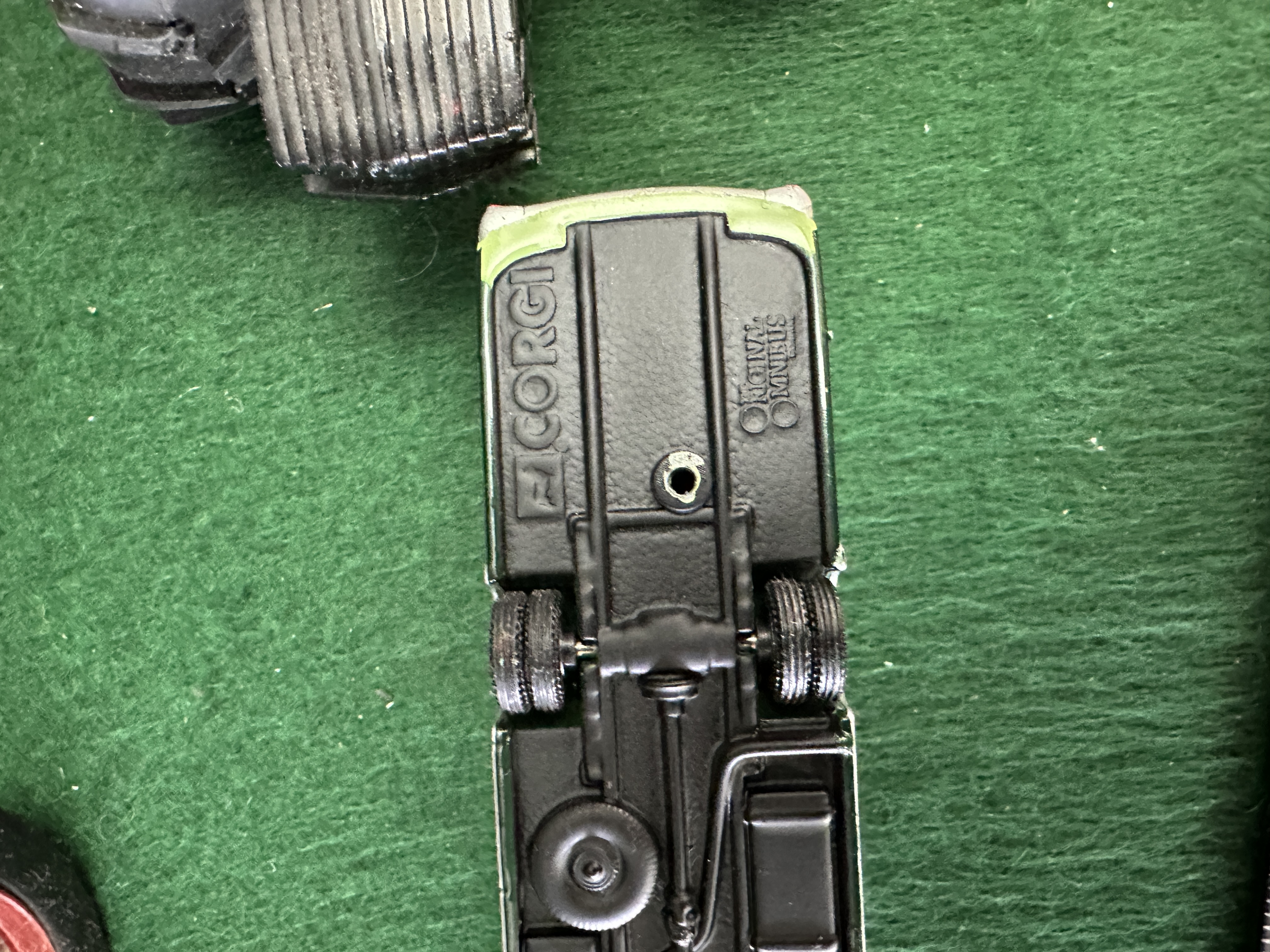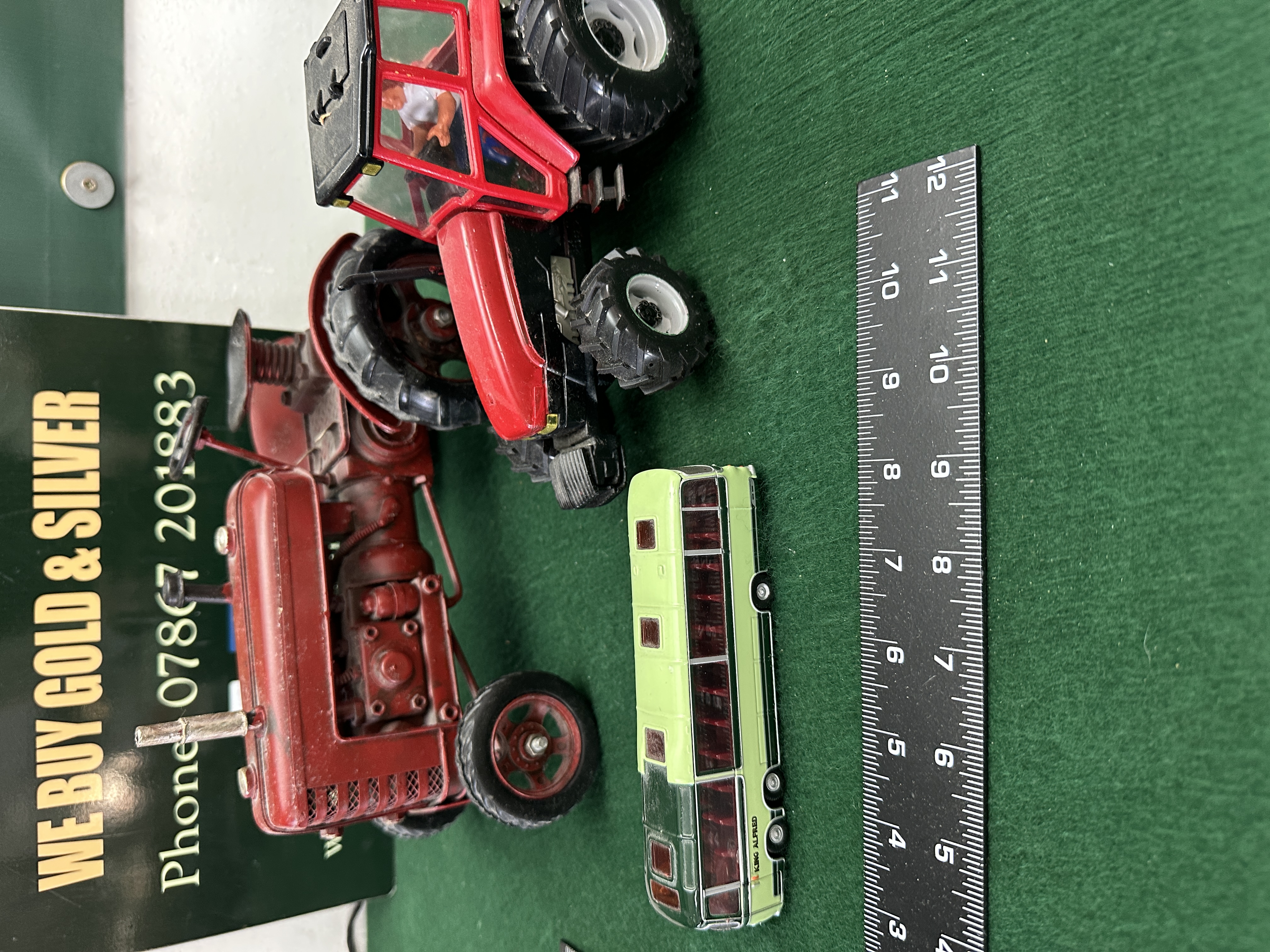 The Corgi bus is in good overall condition with minor paint loss to some raised edges. The vintage International Harvester Farmall tractor shows significant paint wear and chipping across the body, resulting in a distressed appearance. The modern tractor is in generally good condition with light surface dust and wear consistent with age.