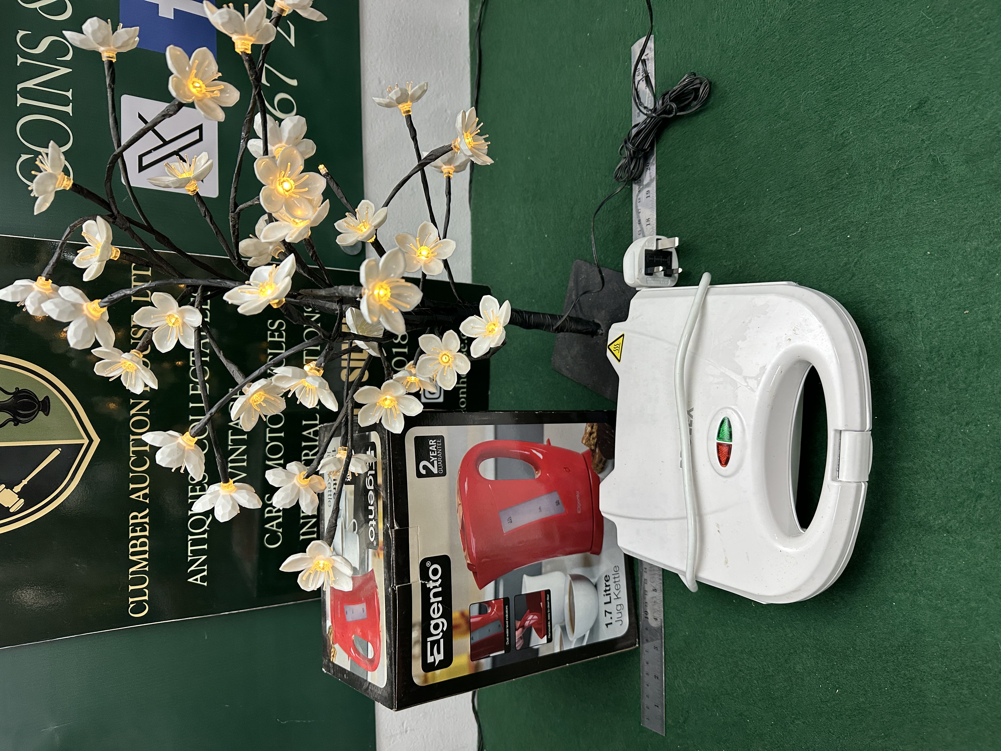 The kettle is in new or near-new condition in a box showing light shelf wear. The sandwich toaster is in used condition with clean internal plates and minor surface marks to the exterior. The blossom tree is in good cosmetic and functional condition.