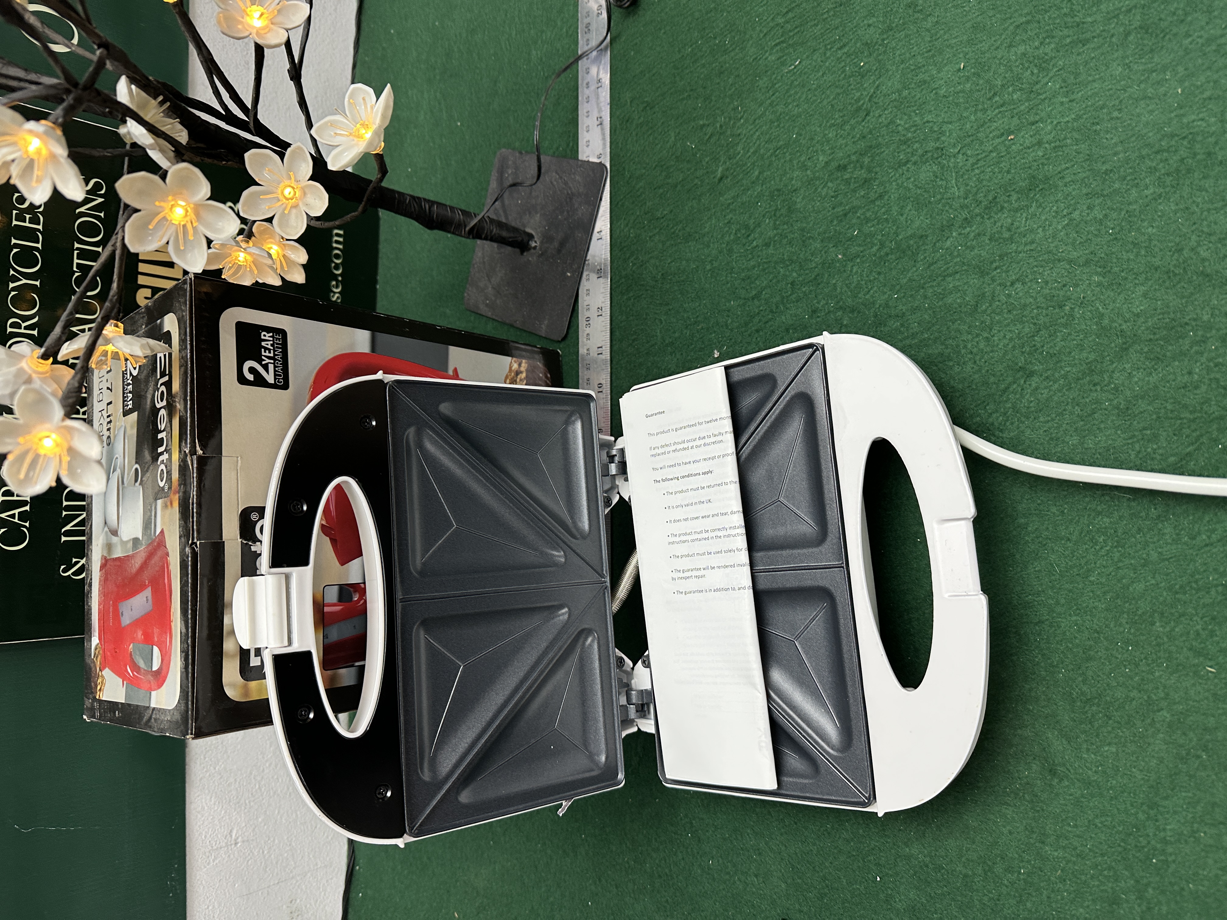 This lot consists of three domestic items including a kettle, a sandwich toaster, and a decorative light. The Elgento jug kettle is finished in red with a 1.7-litre capacity and dual water level indicator windows, housed in its original retail box. The Beldray sandwich toaster is a two-slice capacity model with a white plastic exterior and non-stick internal plates for triangular-cut sandwiches. It features red and green power and ready indicator lights and a locking handle. The decorative LED blossom tree features a black-wrapped trunk and flexible branches with white blossoms containing warm white LEDs, mounted on a square black base. All items are fitted with standard UK 3-pin plugs.
