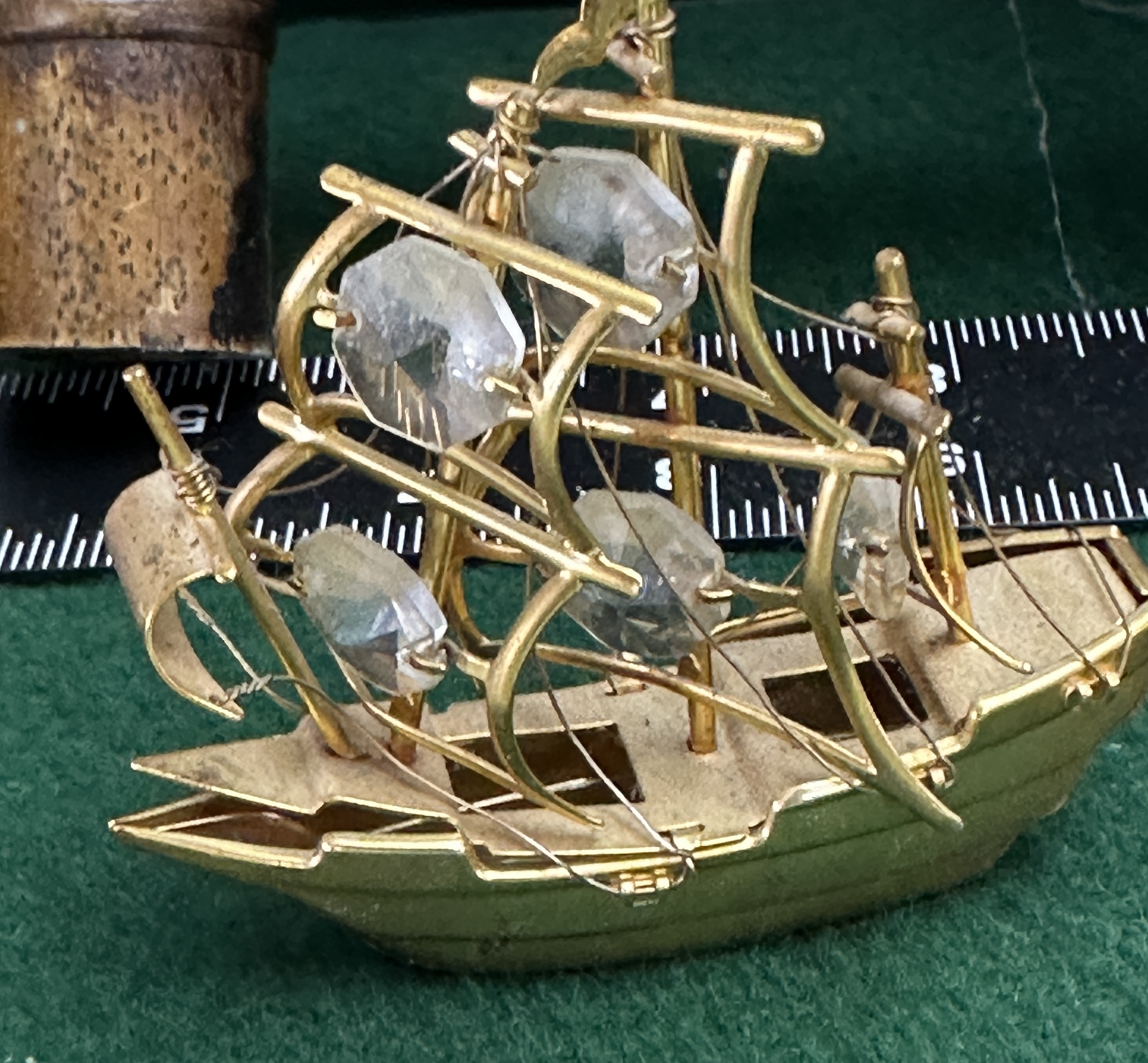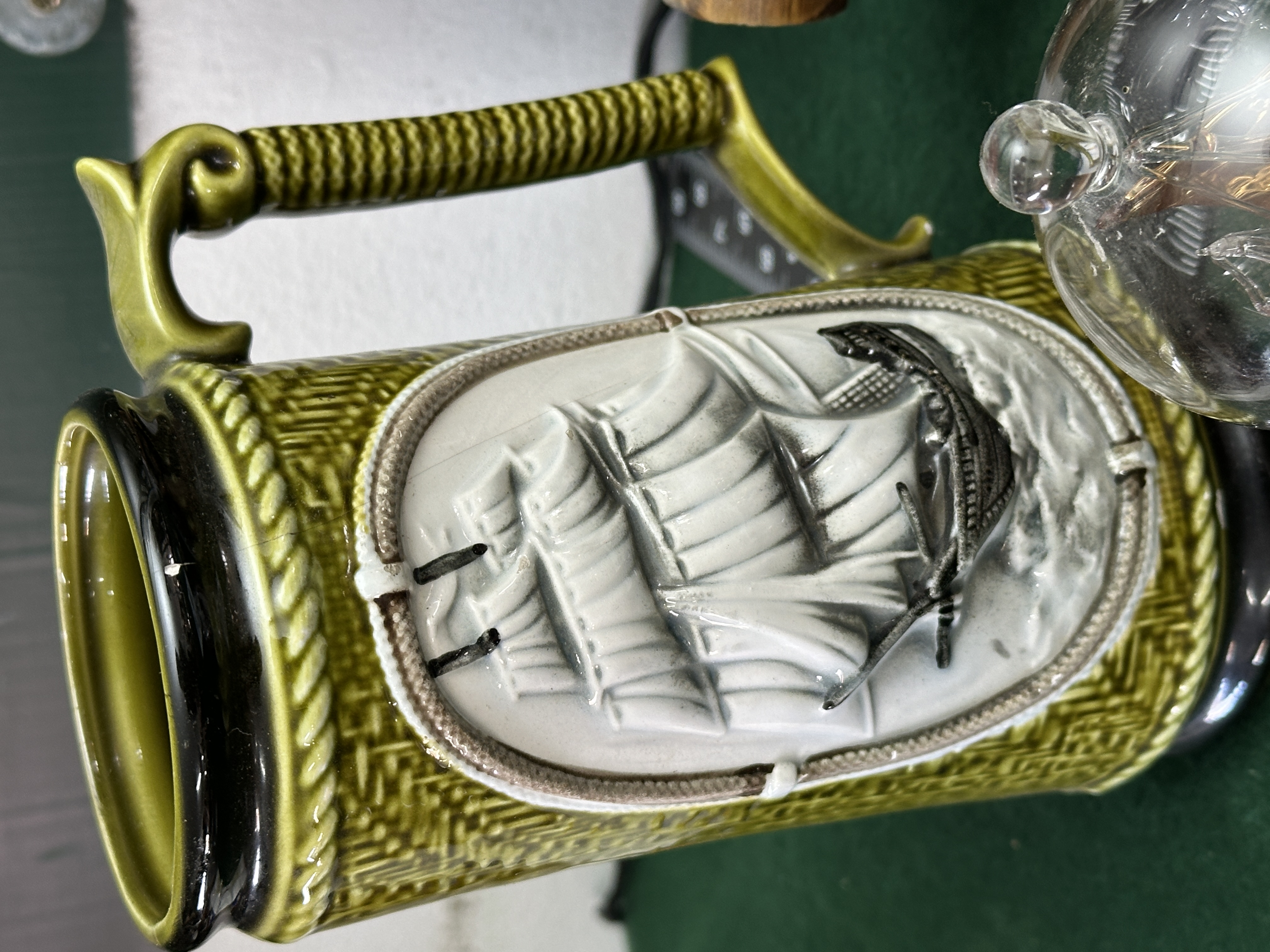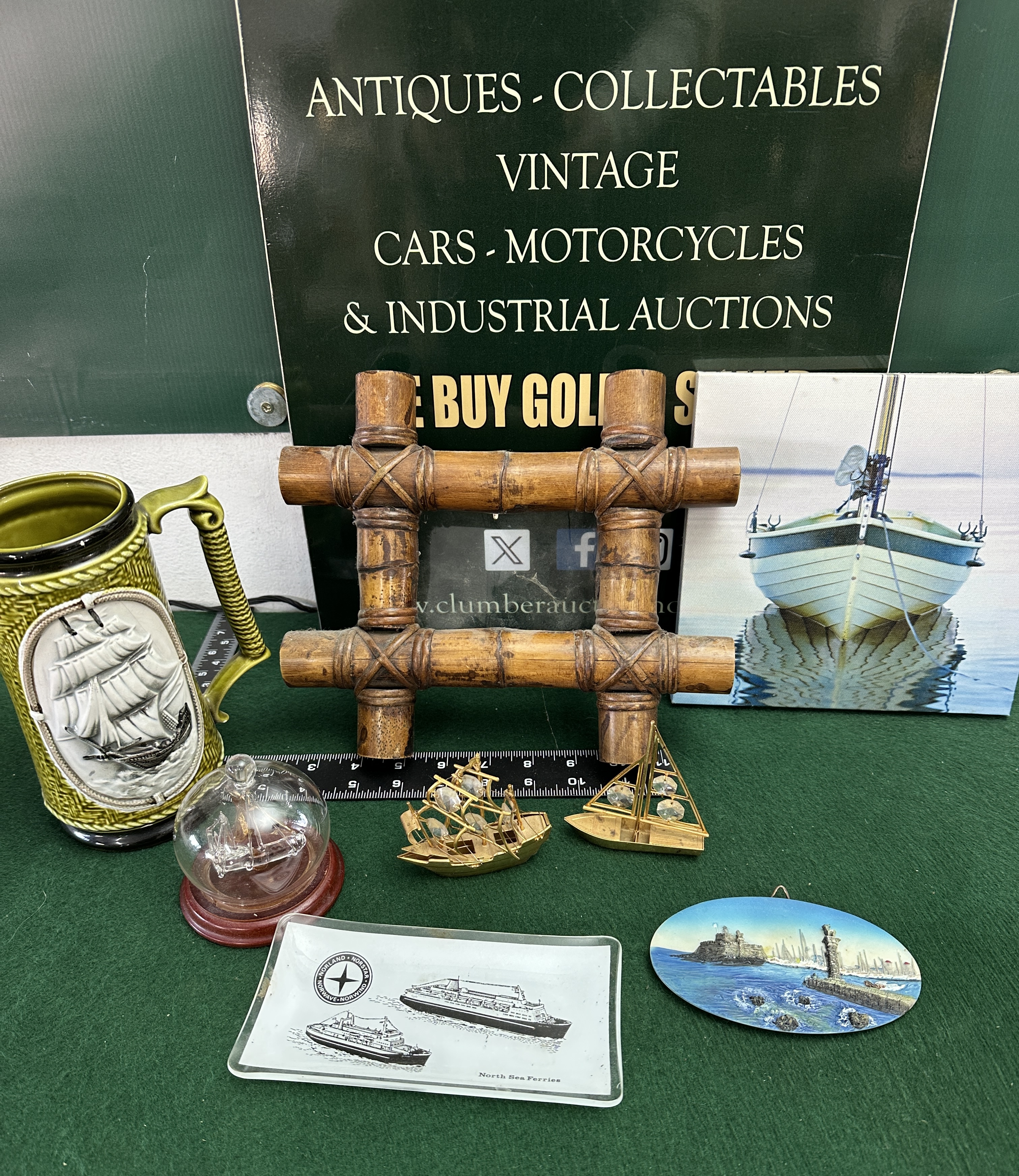A collection of nautical-themed decorative items and maritime memorabilia. The group includes a green-glazed ceramic tankard featuring a relief depiction of a sailing ship and a rope-twist handle. Also included is a burnt bamboo lattice frame or stand with tied joints. Maritime interest is represented by a rectangular glass dish bearing the marks of North Sea Ferries, depicting the vessels Norland and Norstar, and listing the names Norwave and Norwind. The lot further comprises a miniature glass ship housed within a glass dome on a wooden base, and two gold-toned metal ship models, one featuring multifaceted clear crystal sails. Additional items include a square canvas print of a boat and an oval plaque with a coastal lighthouse scene.