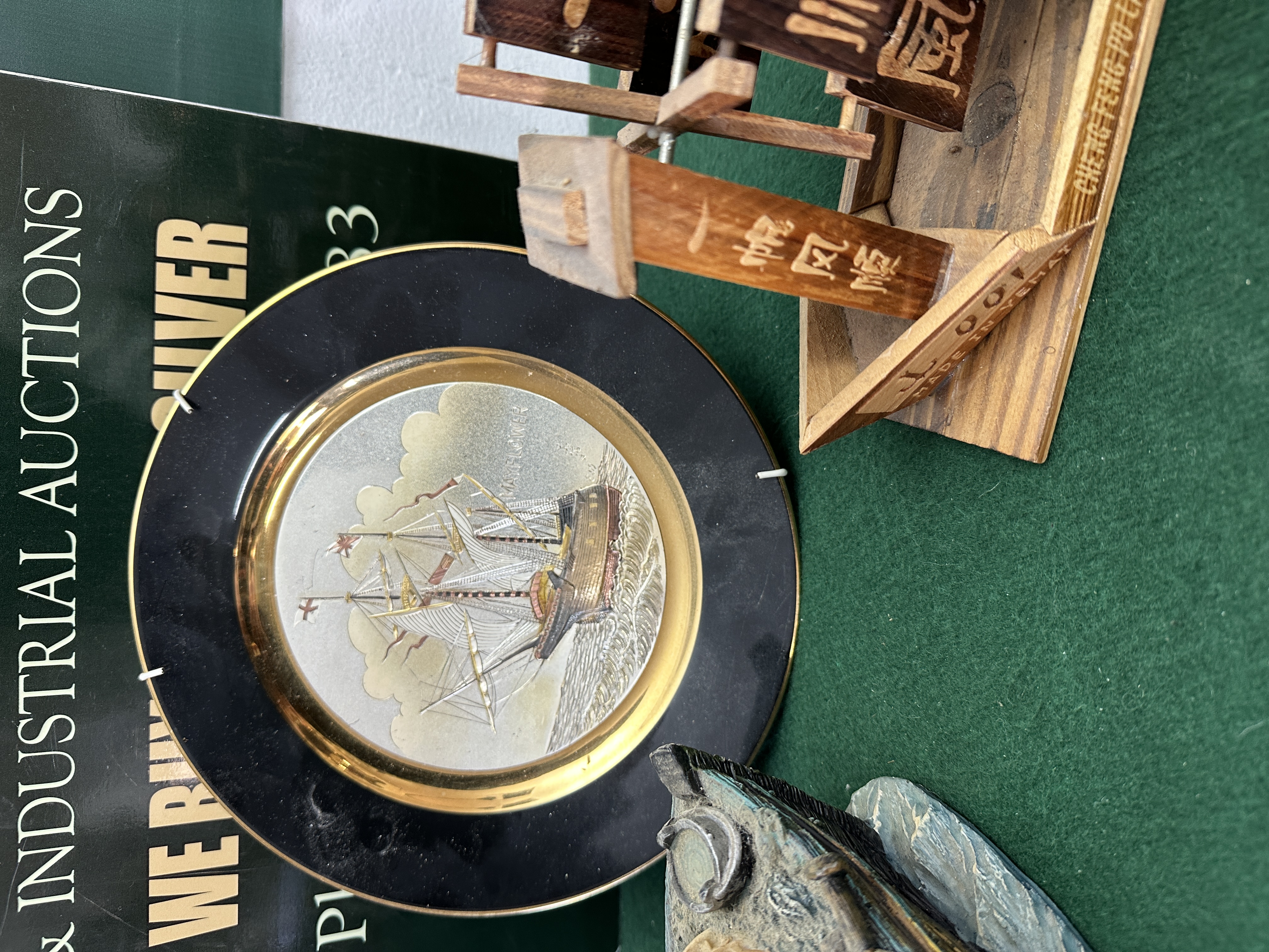 The items are in fair condition overall. All pieces show a significant accumulation of surface dust and would benefit from cleaning. There is minor surface wear, small scuffs, and light paint losses to the figurine consistent with age and display. The wooden model and plate show light surface marks.