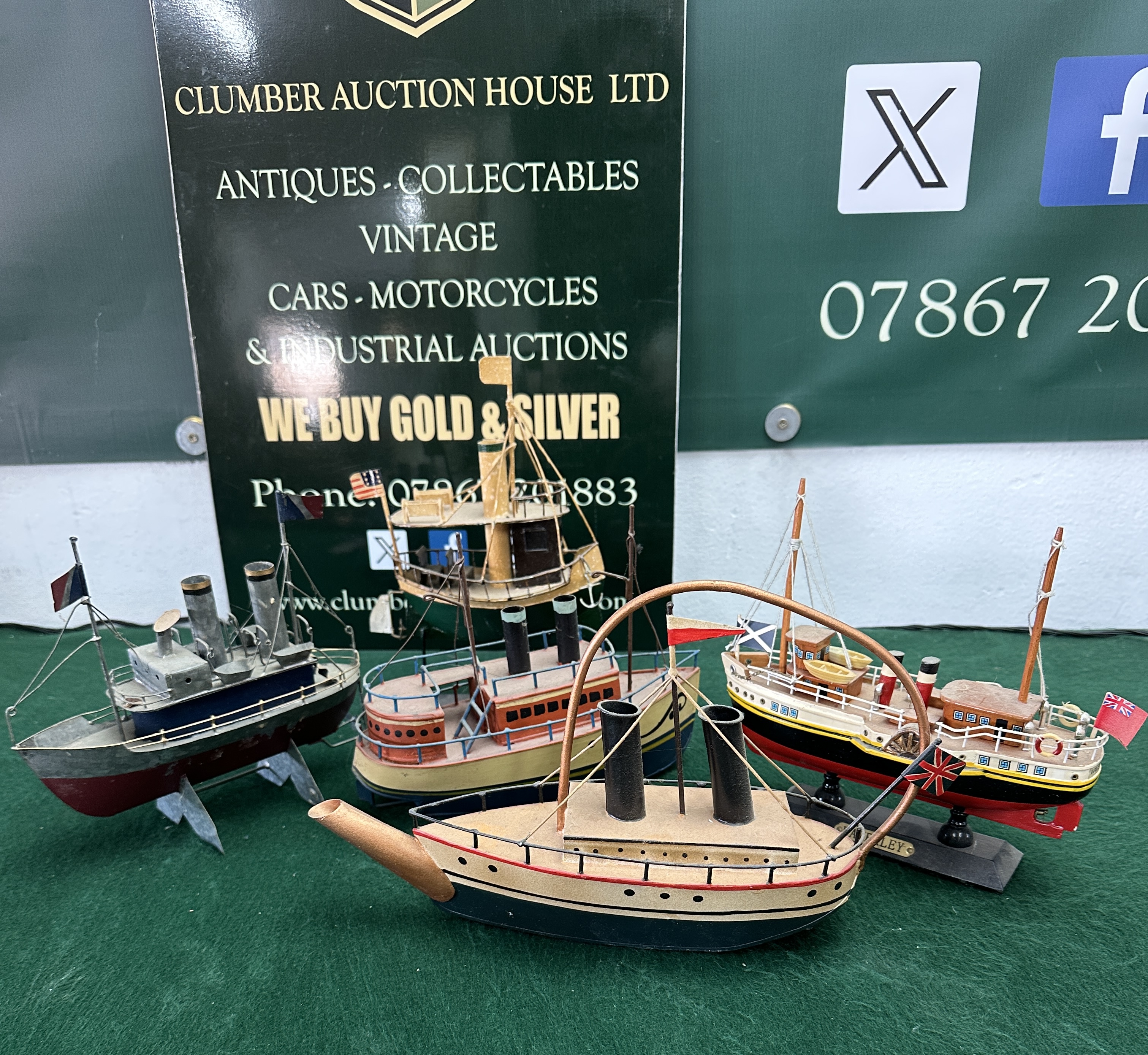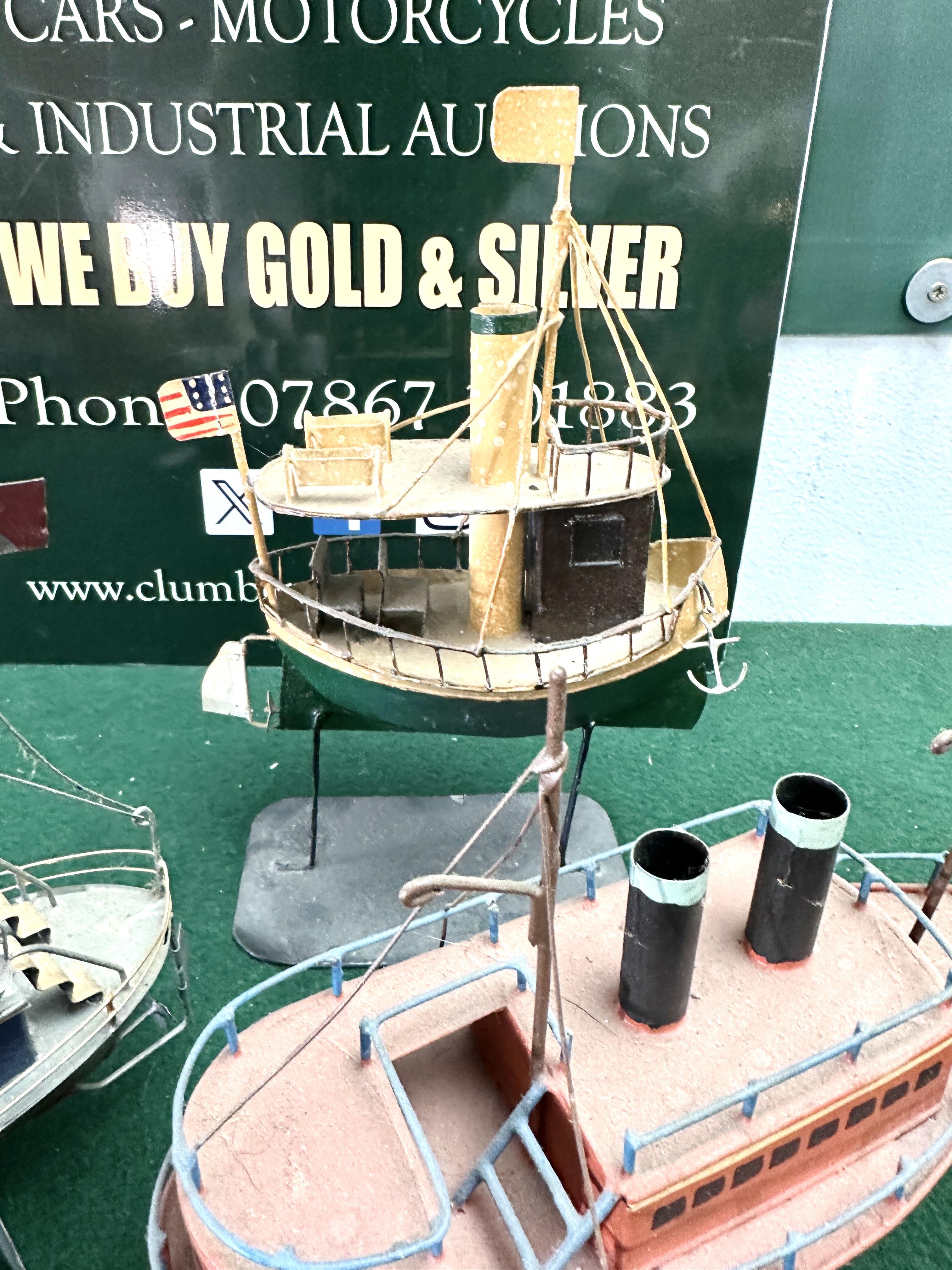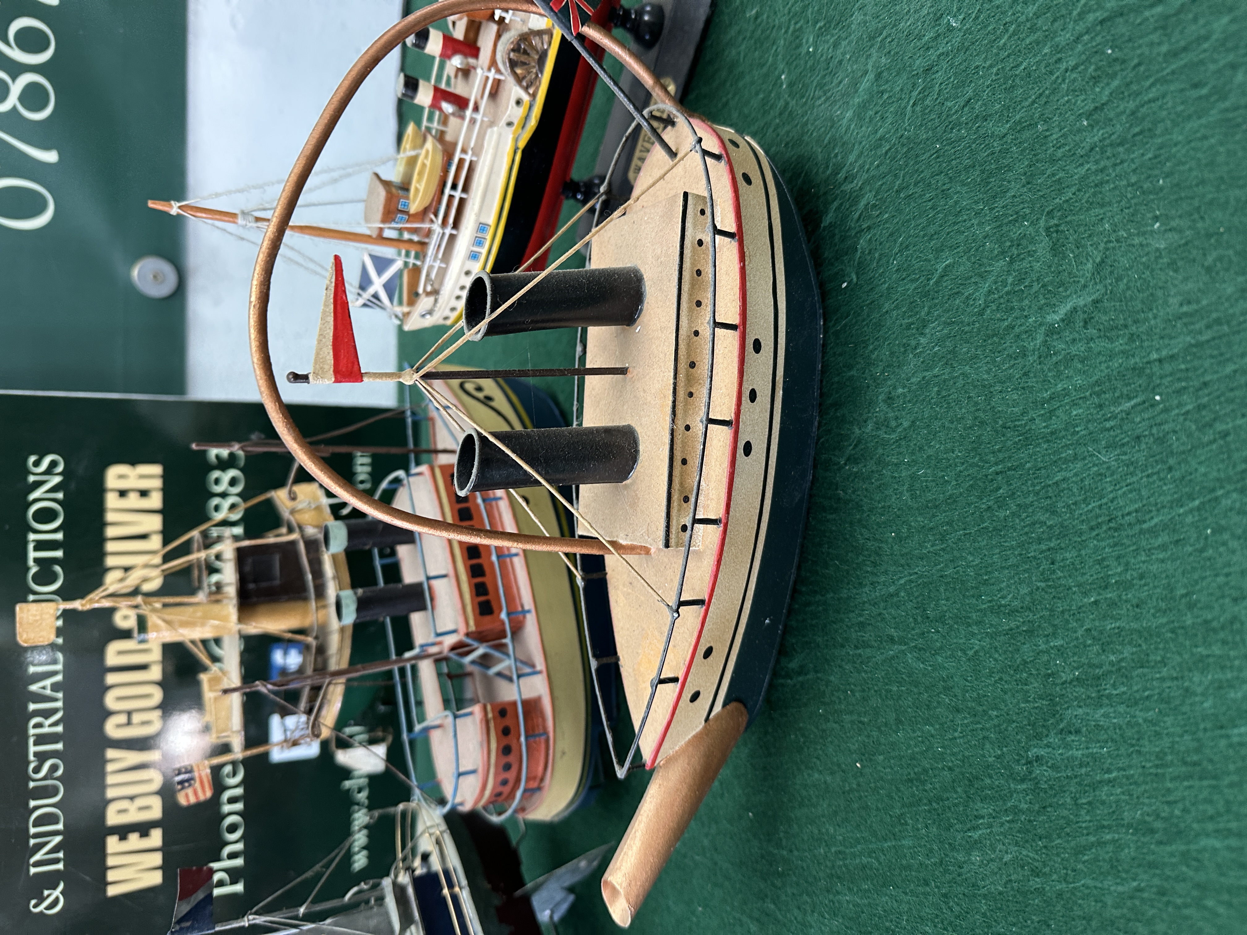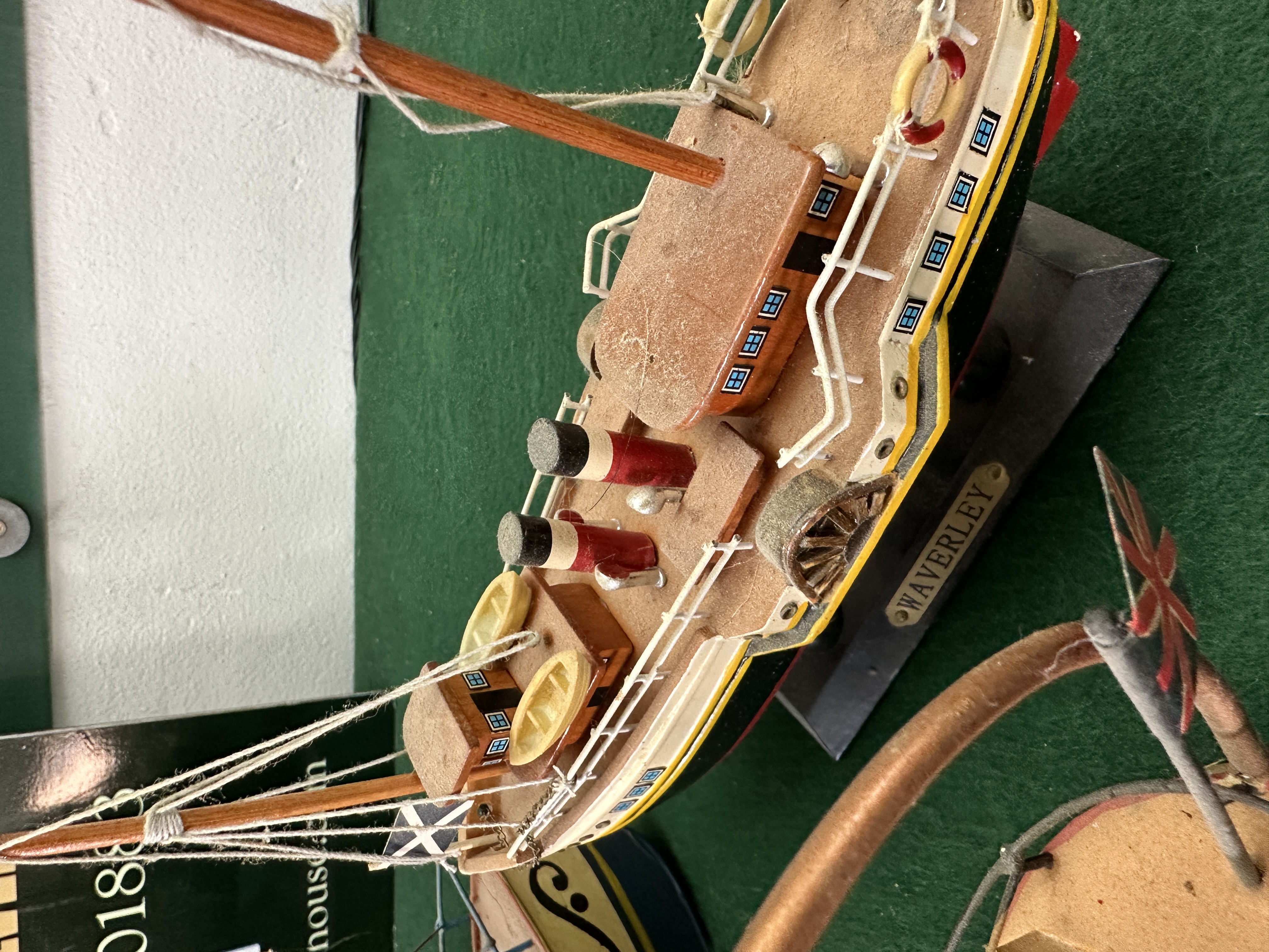This collection comprises several model vessels and a decorative nautical item, featuring a variety of construction materials including painted wood, tinplate, and composite. The primary piece is a detailed scale model of the PS Waverley, the world’s last seagoing paddle steamer, constructed from painted wood with metal and plastic detailing. This model features a black and red hull, white superstructure with yellow accents, and twin red and black funnels, complete with lifeboats, paddle wheels, and rigging. It displays a Scottish Saltire and a Red Ensign, with a brass-coloured nameplate on the black display stand reading WAVERLEY. Also included is a novelty steamship teapot crafted from painted metal, possibly tinplate, with a blue and cream hull, red accents, and a copper-toned arched handle spanning the deck. The collection further contains a tinplate model steamship with a red and grey hull, blue superstructure, and two grey funnels with black and gold bands, flying a French tricolour. A brightly coloured decorative model ship features a yellow wood or composite hull with orange upper decks, black funnels with light blue bands, and wire railings. Completing the group is a small green-hulled tinplate steamship with a single yellow funnel, brown cabin, and an American flag, mounted on a wire and metal display stand.