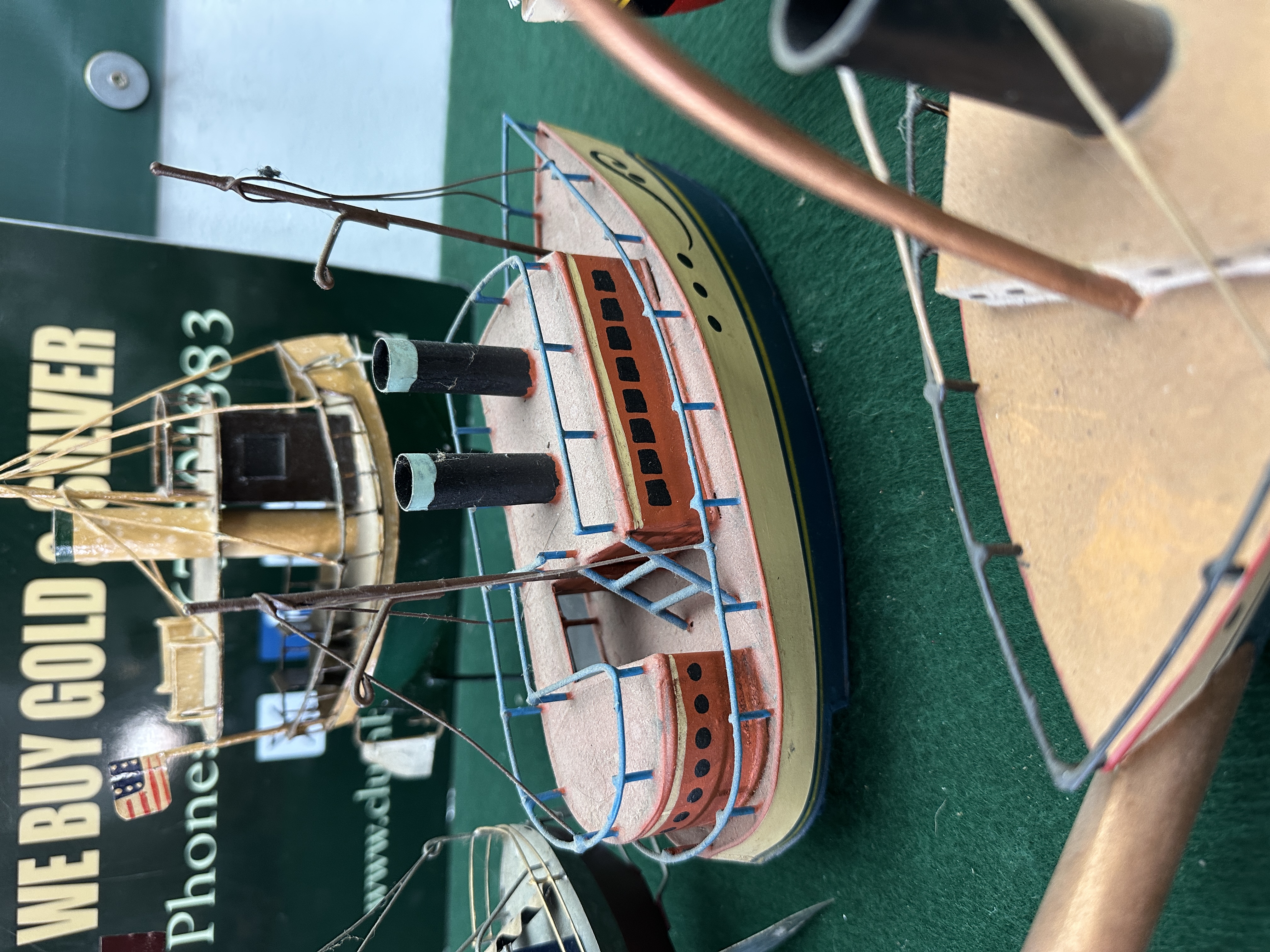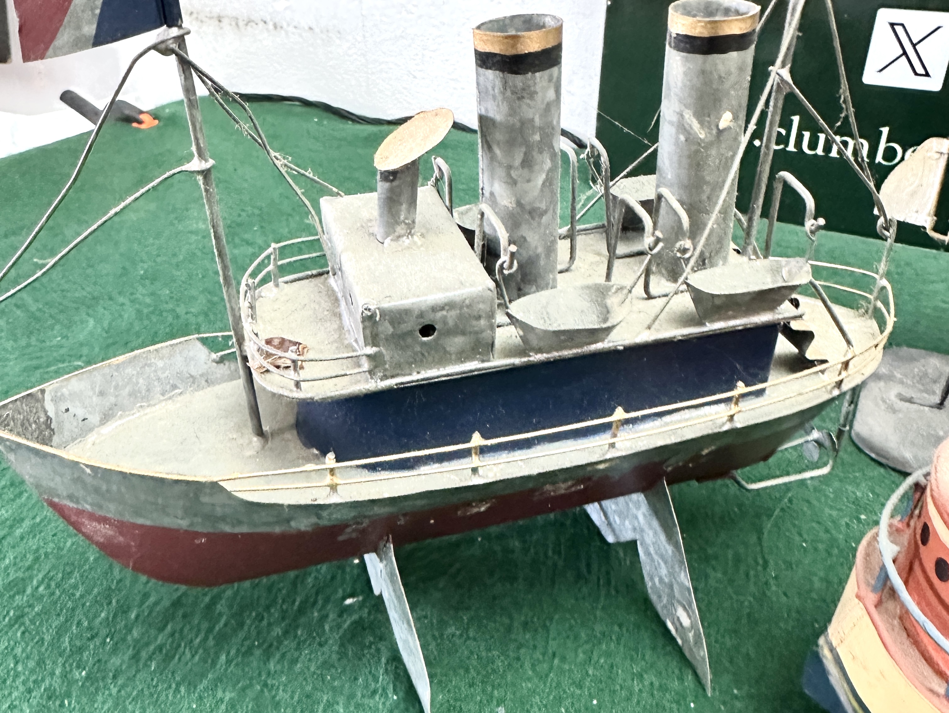 The collection is in generally good display condition but exhibits significant surface dust across all items, requiring professional cleaning. The tinplate elements show signs of light wear and minor oxidation or pitting consistent with age. The rigging and wire railings on several models, particularly the yellow and orange vessel, show some bends and loose or broken components. The functionality of the novelty teapot has not been tested; it is intended for decorative use.