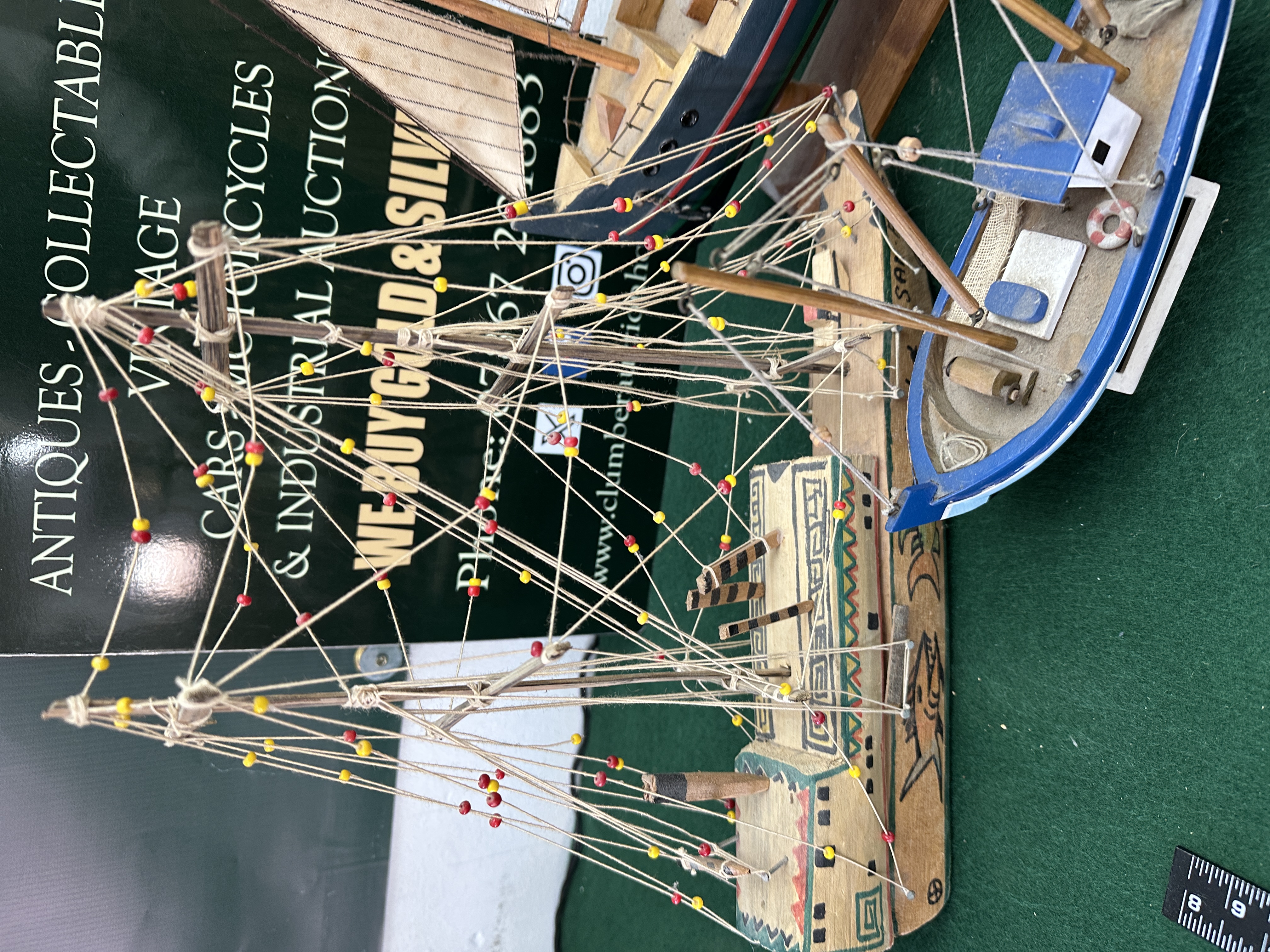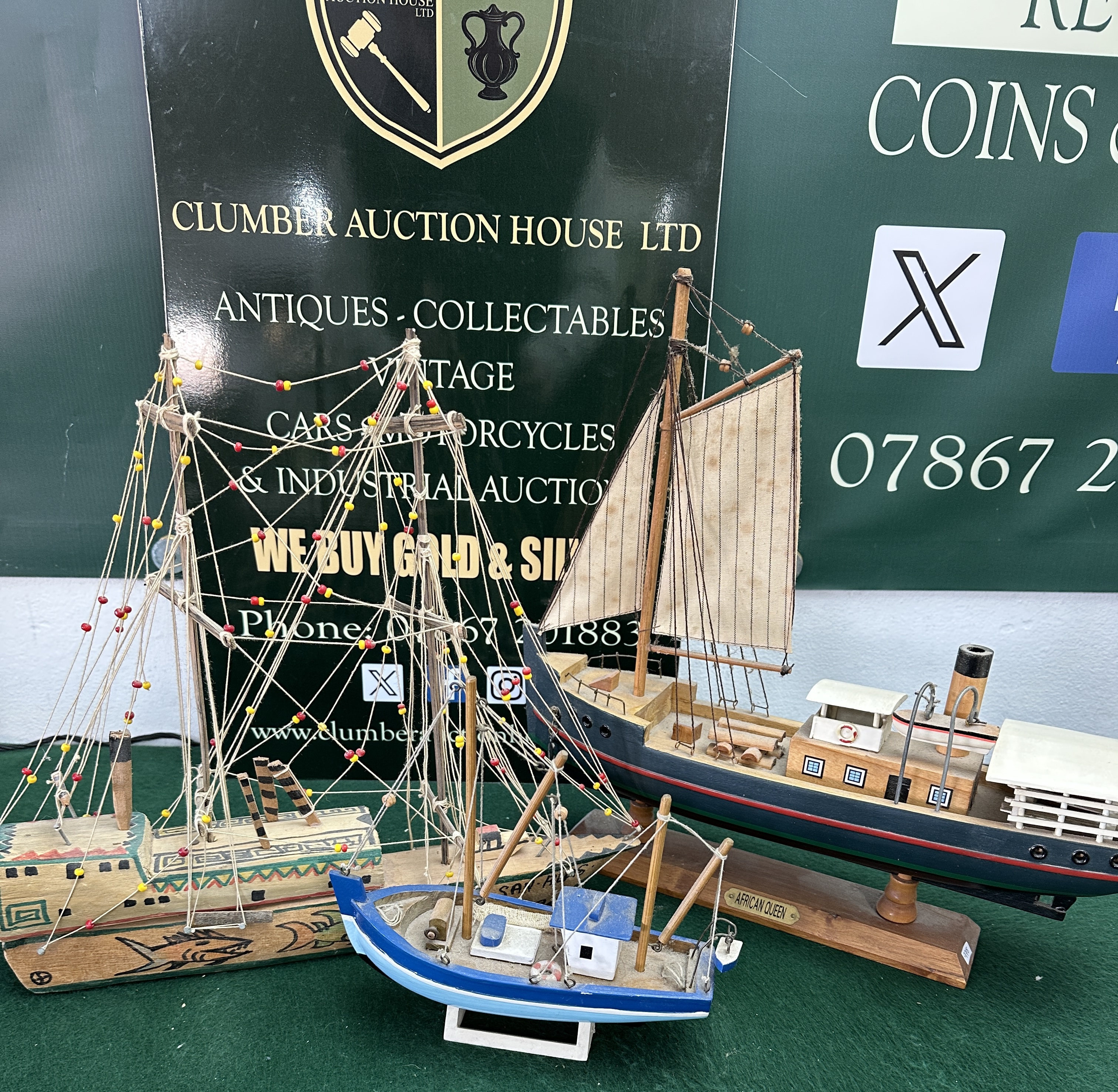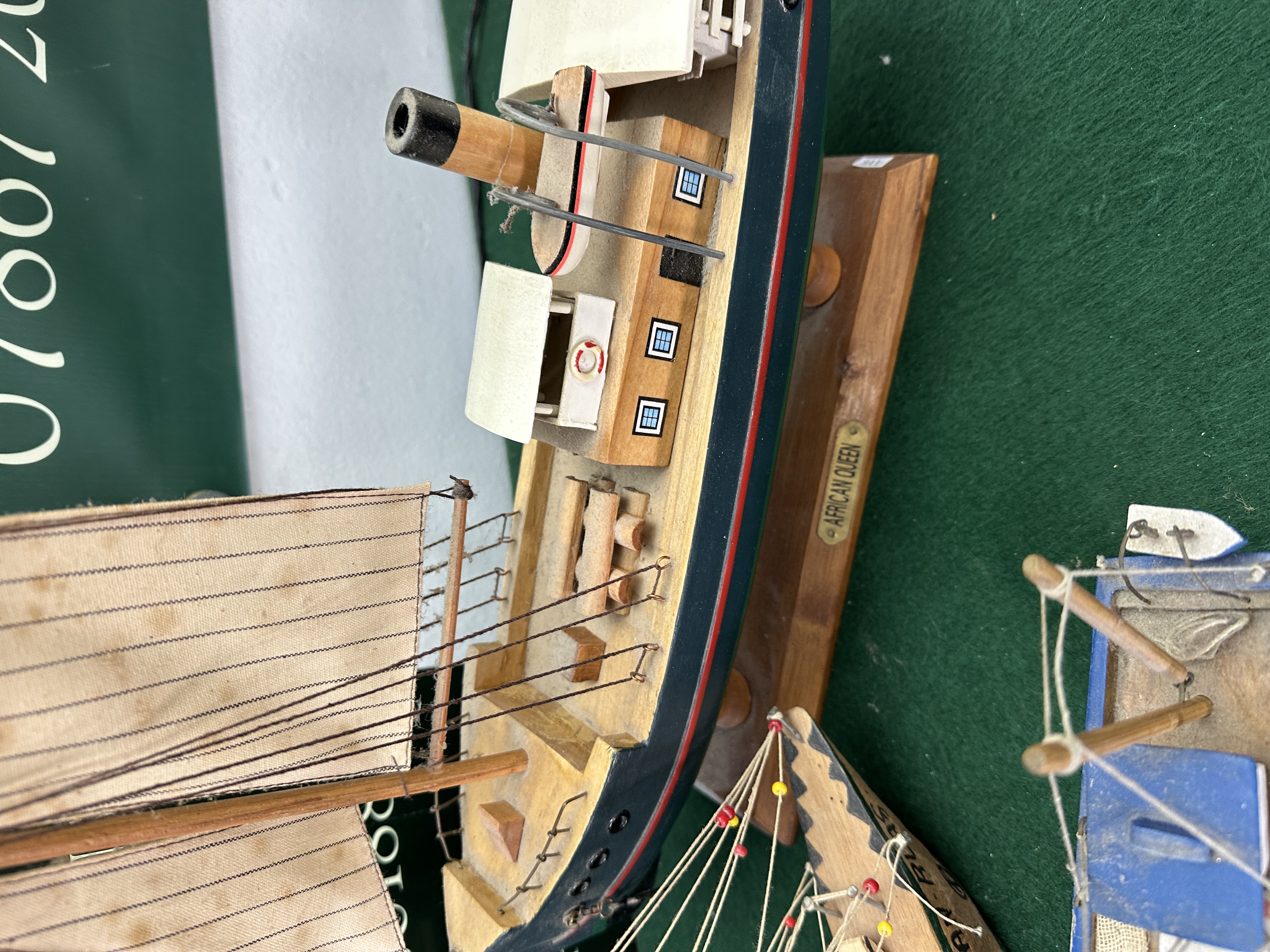 The items are in good overall condition. There is light surface dust across all models and minor staining to the fabric sails of the African Queen. The rigging on the folk-art boat appears intact.