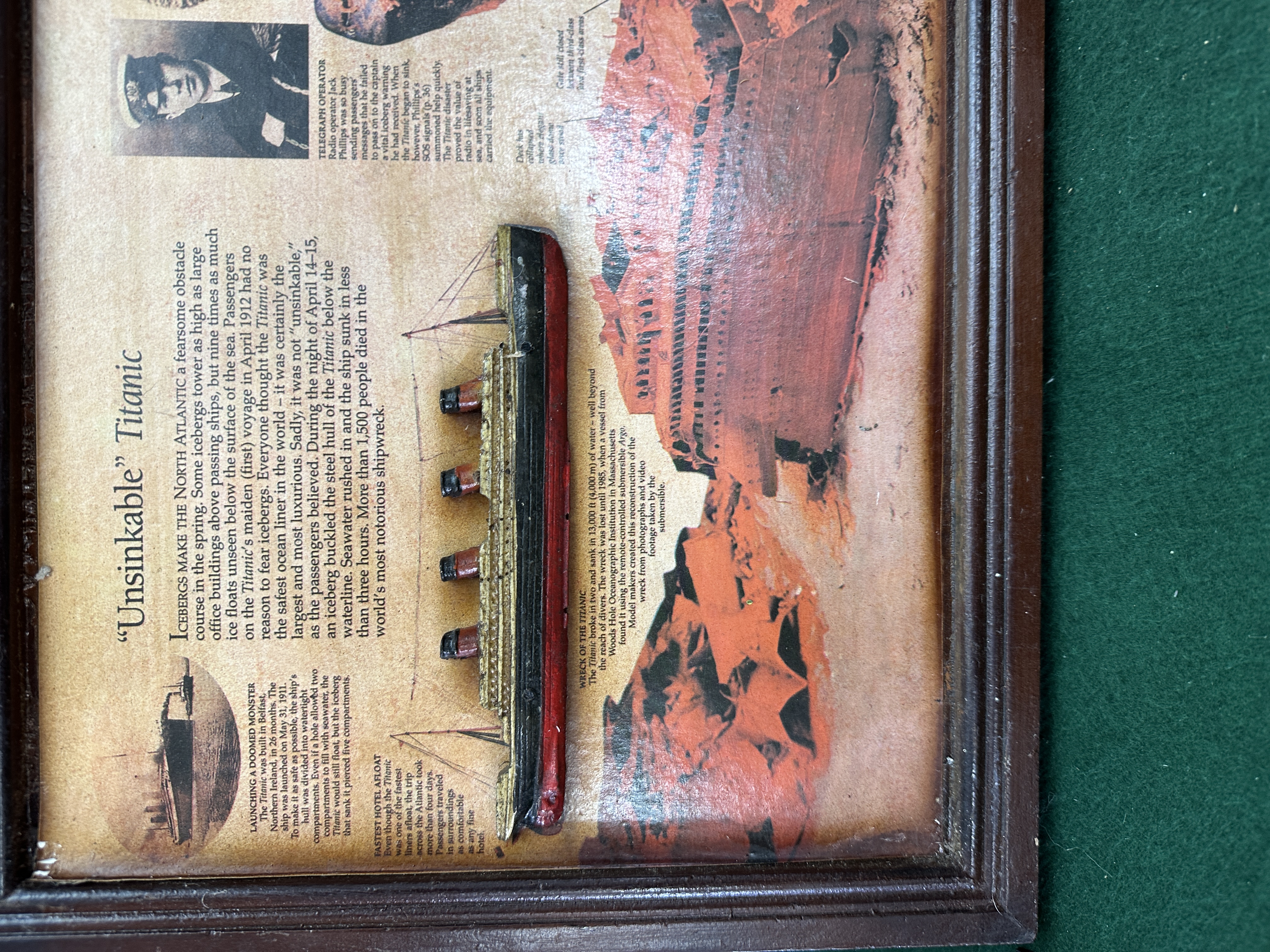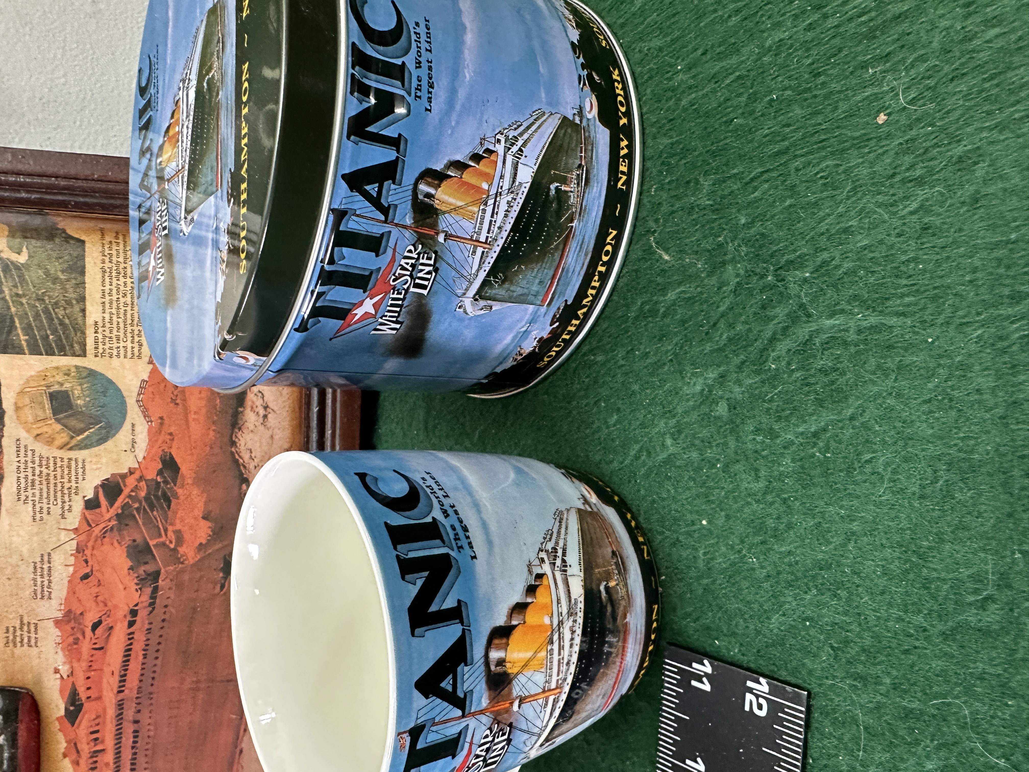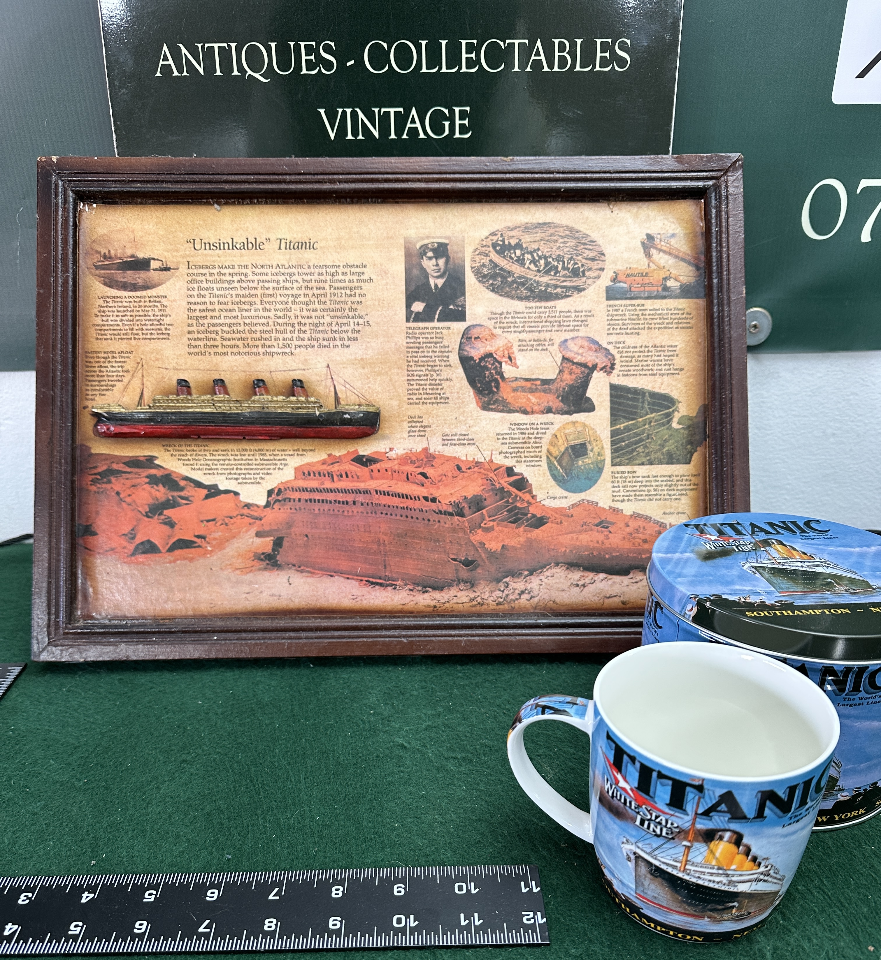 A trio of modern Titanic commemorative items, comprising a framed three-dimensional plaque, a ceramic mug, and a circular metal storage tin. The framed plaque, titled Unsinkable Titanic, features a small relief model of the ship set against an informative printed background documenting the vessel’s history and wreckage. The background includes various historical vignettes and images of the wreck site. The ceramic mug and the metal tin are decorated with a matching graphic design that includes the text TITANIC, WHITE STAR LINE, The World’s Largest Liner, and SOUTHAMPTON ~ NEW YORK alongside an illustration of the ocean liner. The items are produced as commemorative giftware.