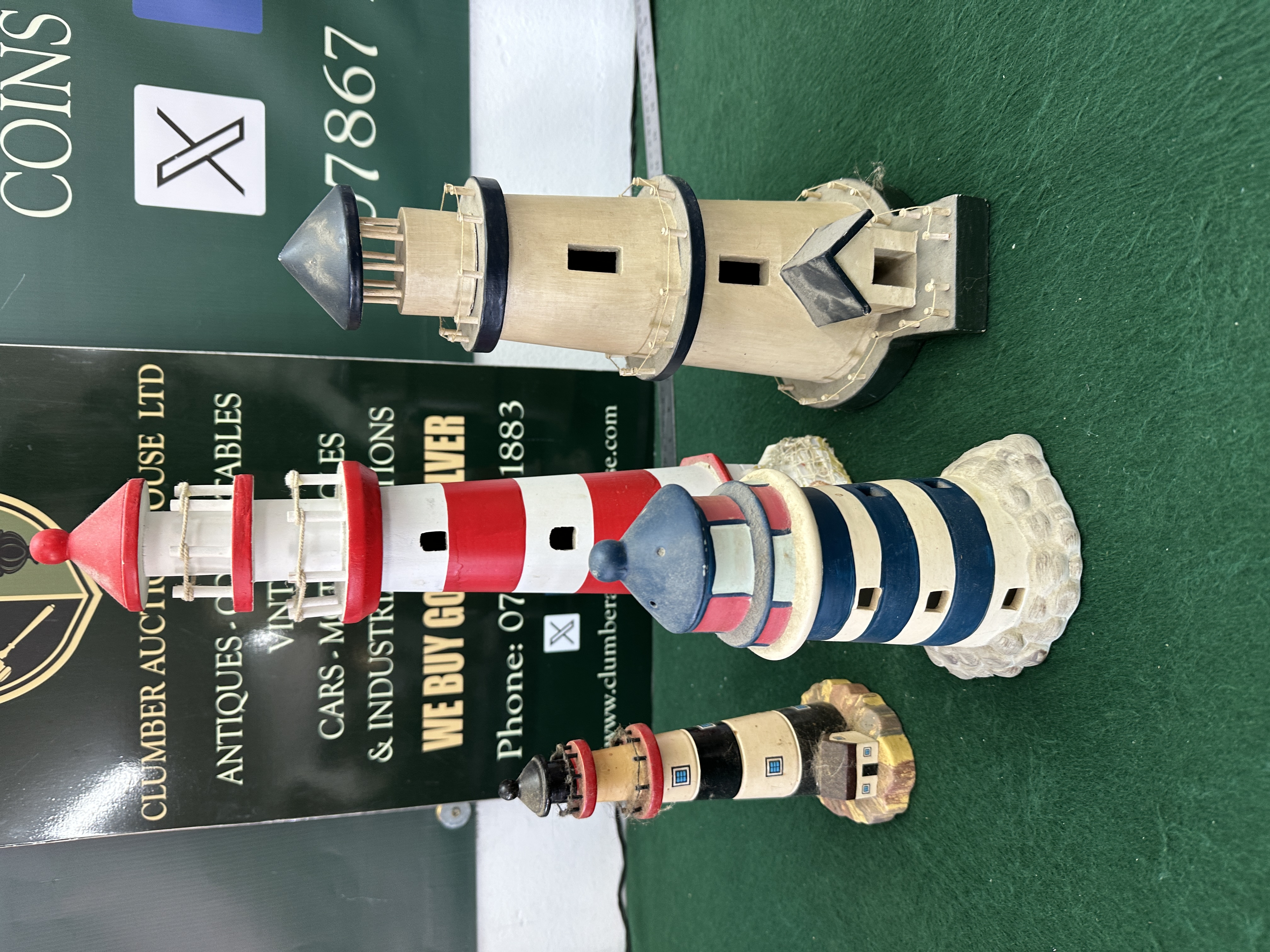 A collection of decorative model lighthouses in various sizes, styles, and finishes. The group includes models crafted from wood with painted details, including red and white stripes and natural wood tones, as well as cast resin or composite models with textured bases and painted banding in blue, white, and black. Several models feature nautical-style rope railings and tiered lanterns. No maker’s marks, signatures, or inscriptions are visible on the exterior of the pieces.
