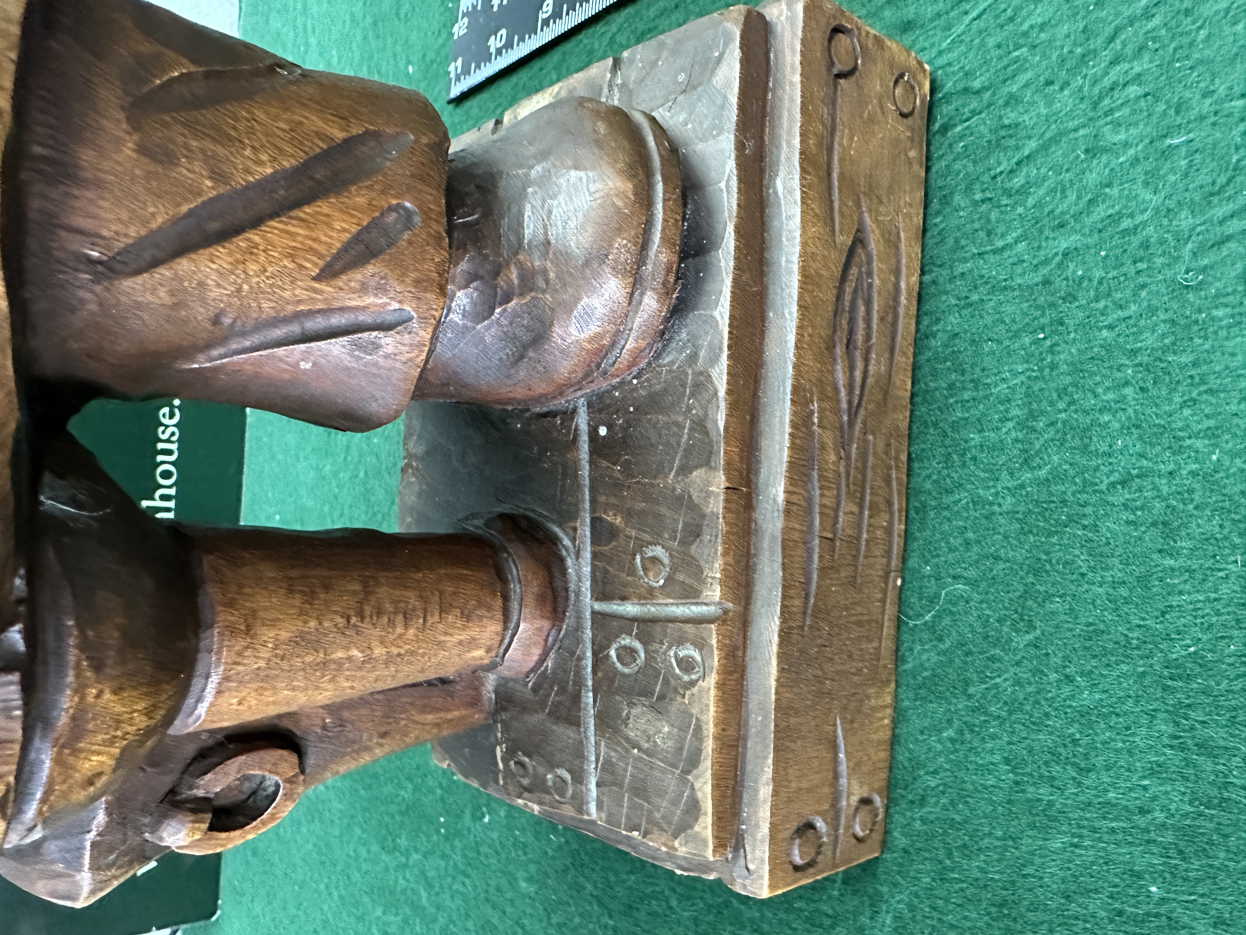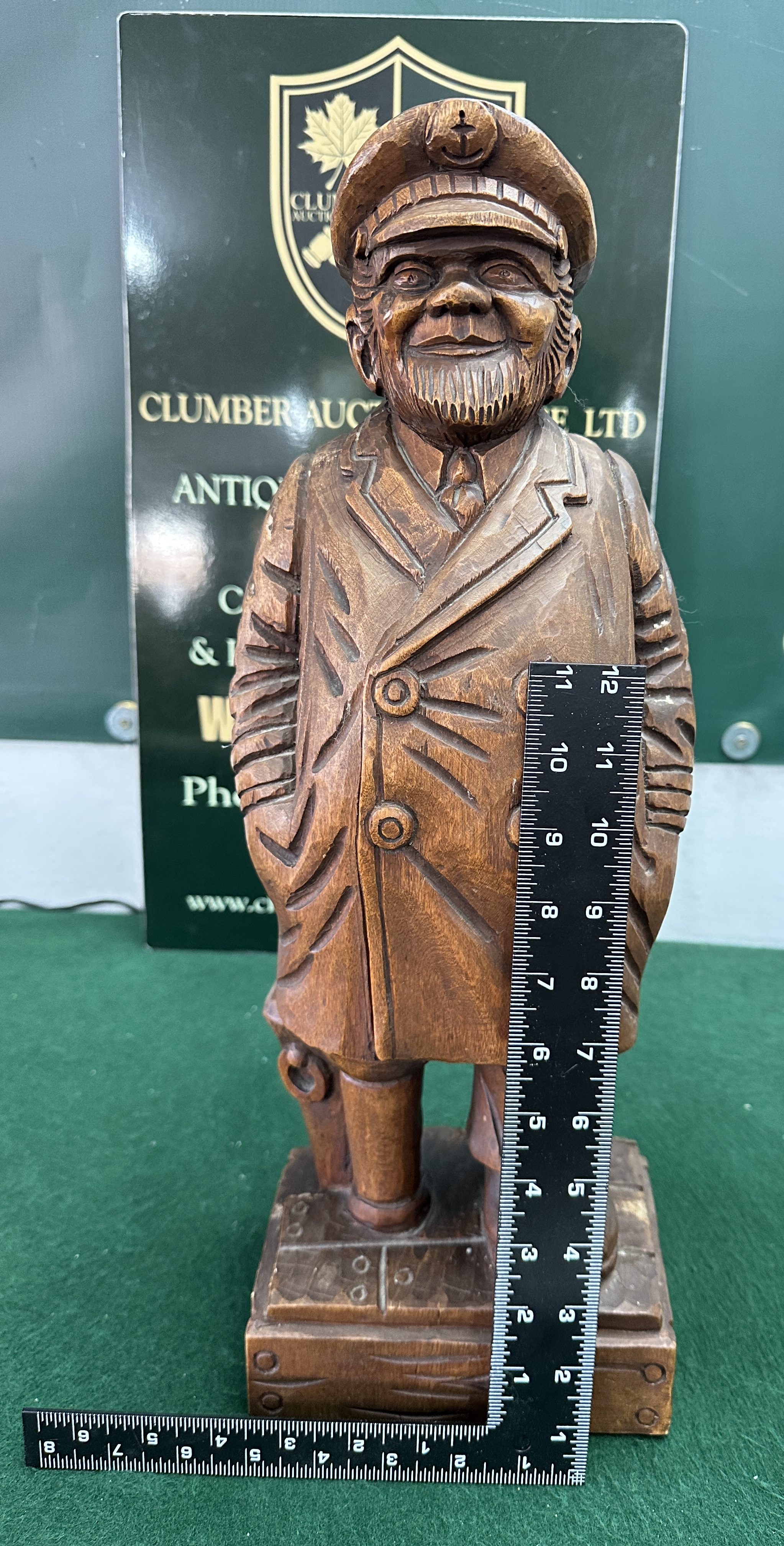 A hand-carved folk-art style wooden figurine depicting a nautical figure, identified as a sea captain or sailor. The character is depicted with a full beard and a peaked officer’s cap featuring an incised anchor emblem. The figure is wearing a double-breasted pea coat with hands tucked into the pockets. The carving is set upon an integral rectangular base designed to resemble a wooden deck or crate, featuring stylized incised lines and circular motifs. The item is constructed from wood with a dark brown stain and a polished wax or varnish finish. Several incised marks consisting of small circles and straight lines are present on the base and pedestal sides; these appear decorative in nature as no legible alphabetic or numerical maker’s marks are visible.