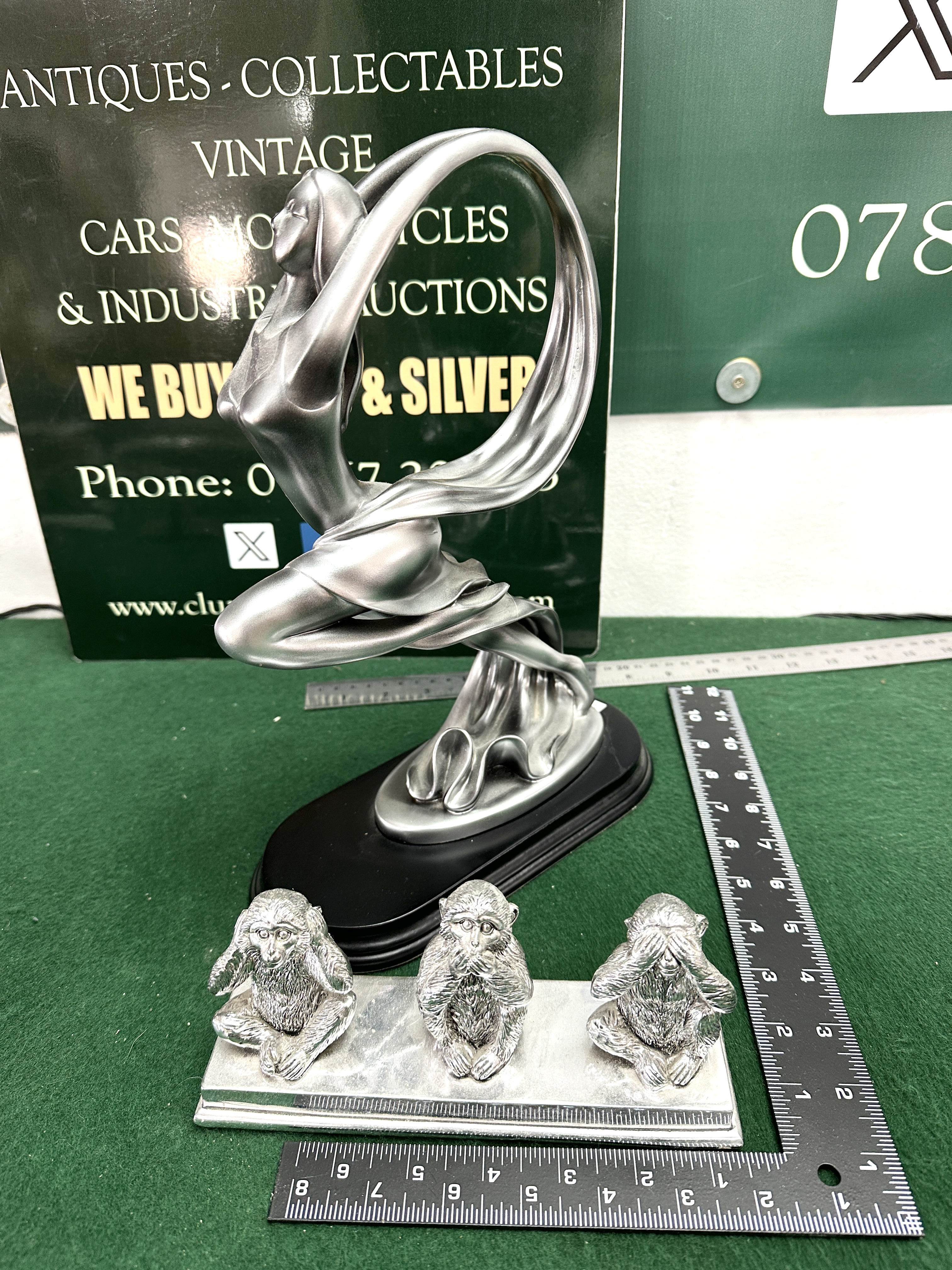 Two silver-toned decorative figurines. The first is an Art Deco style sculpture depicting a semi-nude female figure in a dynamic, stylised pose with flowing drapery forming an arc. The piece is finished with a satin silver-coloured coating and is mounted on a black stepped oval plinth. Web intelligence suggests this design is associated with the Chromeworks collection by Regency Fine Art or Austin Productions, though no maker’s marks or signatures are visible. The second item is a cast silver-toned figurine group representing the Three Wise Monkeys (See No Evil, Hear No Evil, Speak No Evil). The monkeys feature textured fur details and are mounted on a rectangular silver-toned base. Both items appear to be made of cast resin or a similar composite material.