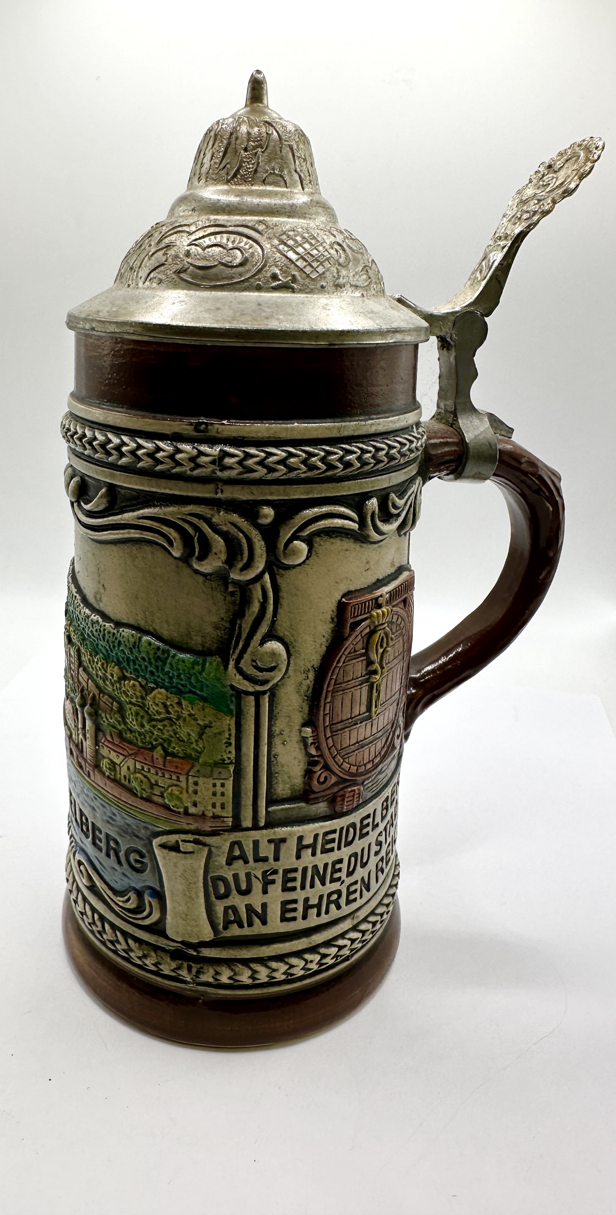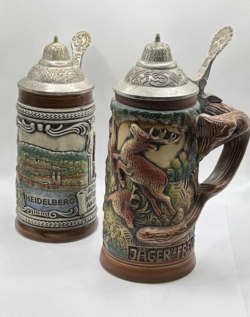 A group of two German relief-moulded stoneware beer steins, each featuring polychrome decorative scenes and fitted with ornate domed metal lids. The first stein depicts a panoramic view of Heidelberg, inscribed with the city name and the German text ALT HEIDELBERG DU FEINE DU STADT AN EHREN REICH, translated as Old Heidelberg, you fine one, you city rich in honour. The second stein illustrates a hunting scene featuring a stag and a boar, inscribed JÄGER’S FREUD or Hunter’s Joy, and is distinguished by a figural fox-form handle. Both vessels are constructed from stoneware with relief decoration and finished with a multi-coloured glaze. The metal lids feature decorative thumb lifts and embossed patterns. The base of one stein bears the stamped mark ORIGINAL GERZIT and is marked GERMANY.