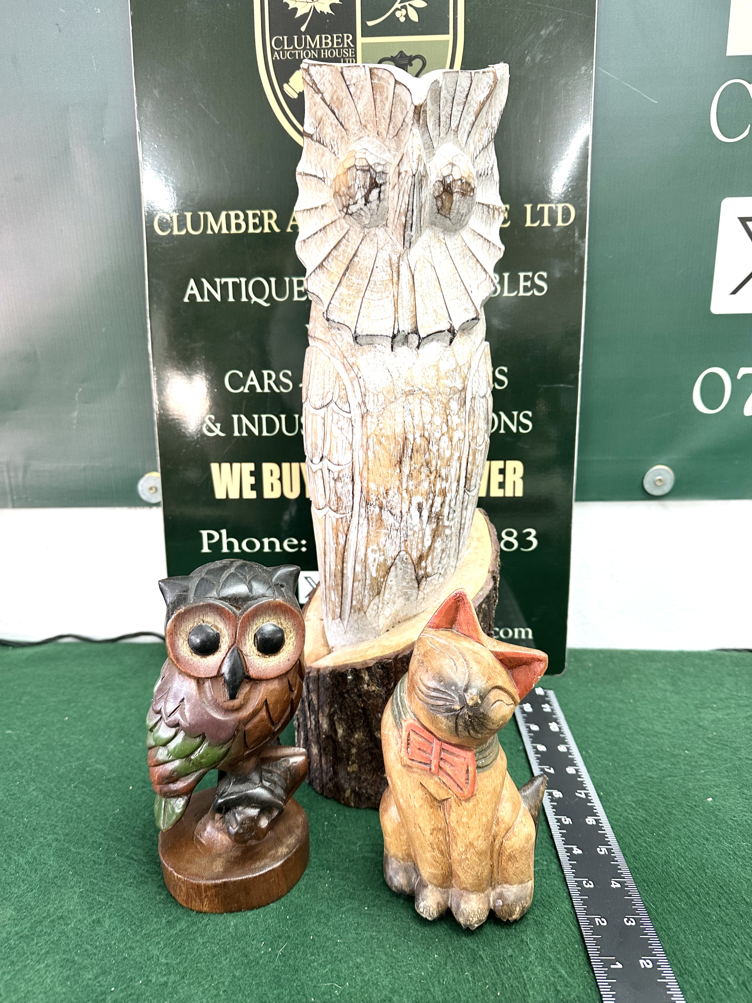A trio of carved wooden animal figurines comprising two owls and a cat. The largest item is a stylised owl figure carved from a single piece of timber, featuring a whitewashed finish and a naturalistic log base with bark intact. This item is characteristic of chainsaw folk art. Also included is a smaller polychrome painted wooden owl perched on a branch, decorated in shades of brown, green, and red, and a carved wooden cat figure depicted wearing a red bowtie. No maker’s marks or signatures are visible on the exterior surfaces of the items.
