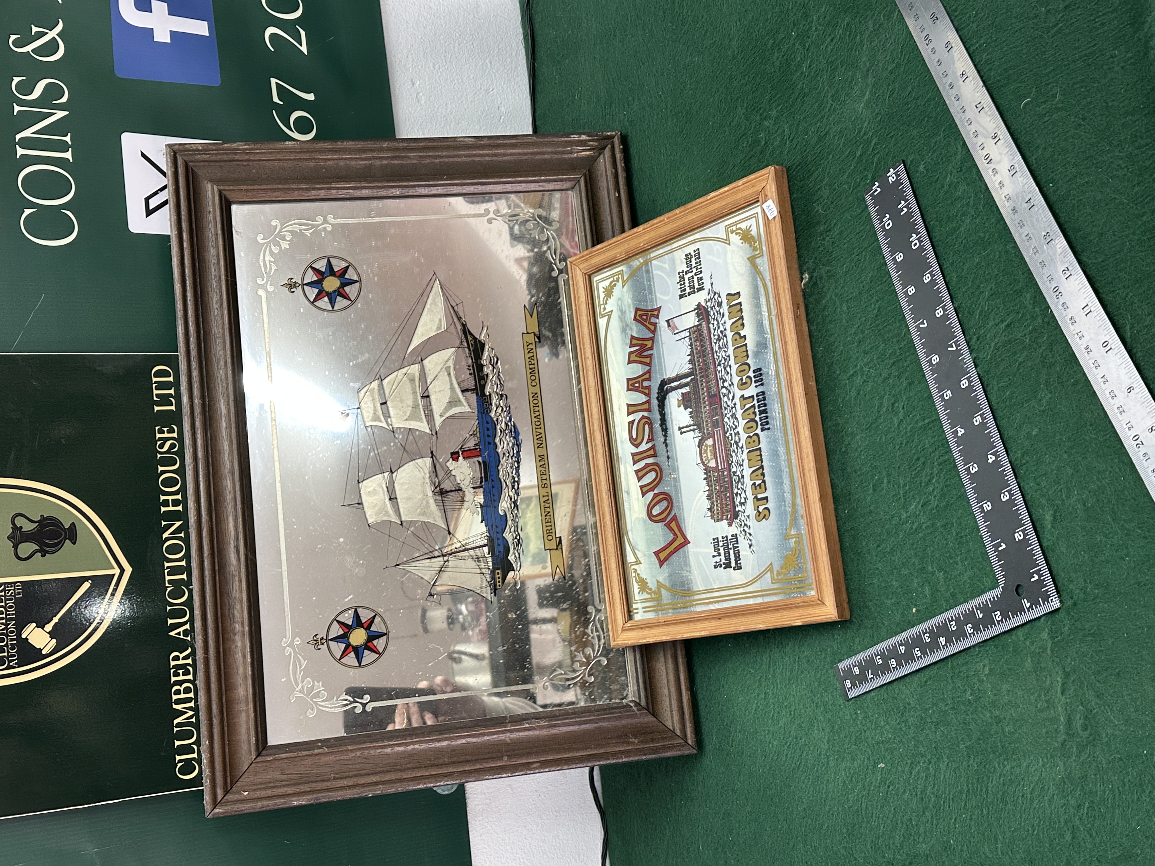 A pair of framed advertising mirrors featuring maritime subjects. The larger mirror displays a steamship under sail with a blue hull and white sails, flanked by two compass roses and a decorative frosted border. It contains the text Oriental Steam Navigation Company on a scroll banner and is set within a dark-stained wood frame. The smaller mirror depicts a paddle steamer and bears the text Louisiana Steamboat Company Founded 1889, listing port cities including St. Louis, Memphis, Greenville, Natchez, Baton Rouge, and New Orleans. This piece is presented in a light-coloured wood frame. Both items consist of printed glass within wooden frames.