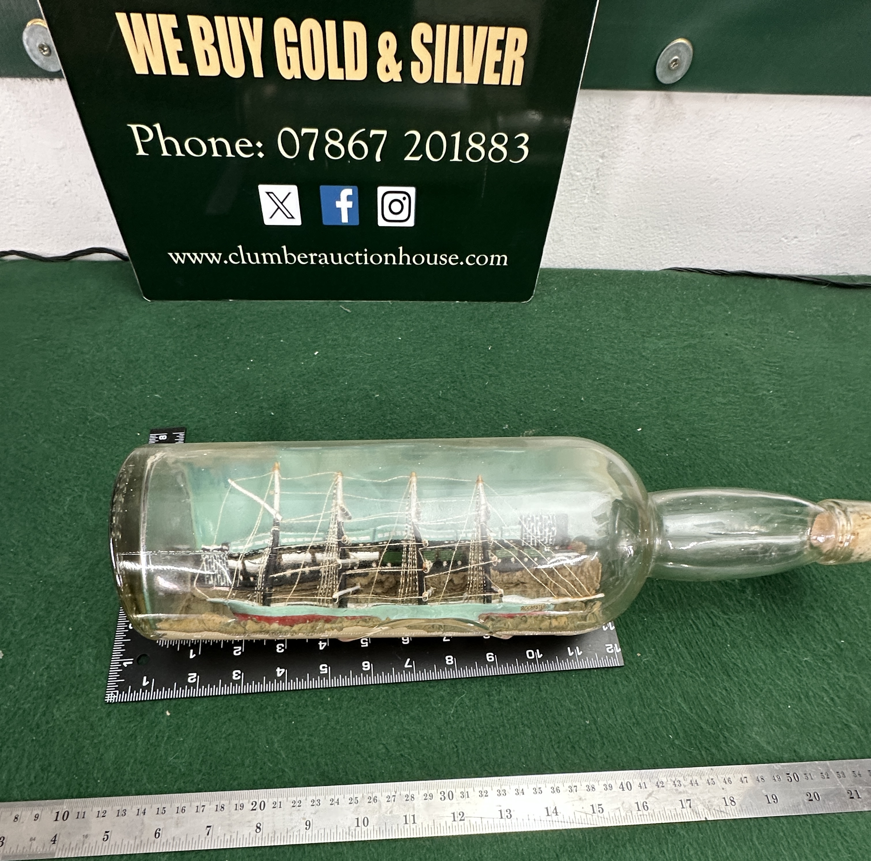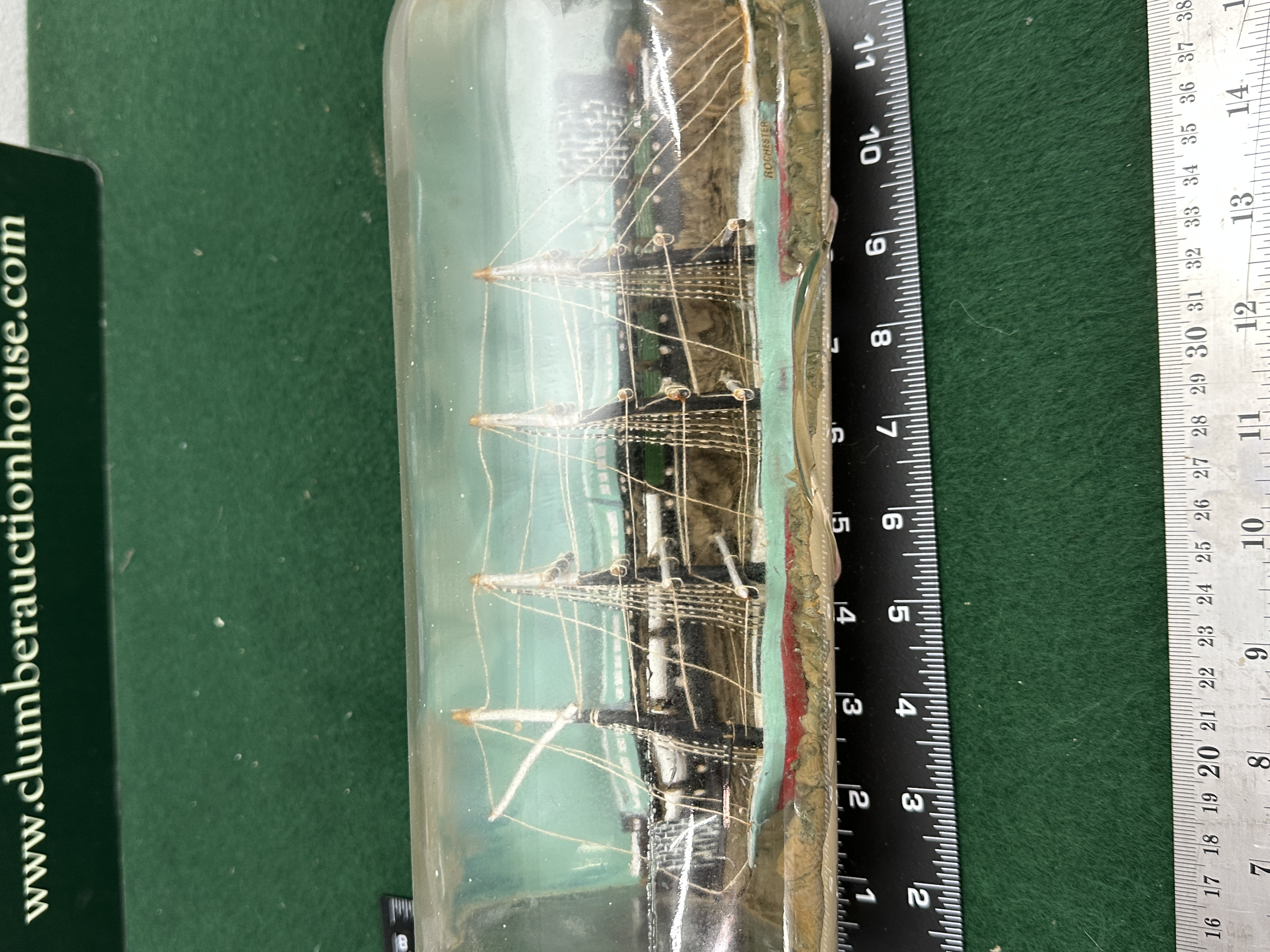 The model remains in good overall condition with the rigging intact and upright. The glass bottle is clear and free from significant damage. The putty sea-base exhibits minor age-related drying and fine cracking consistent with age.