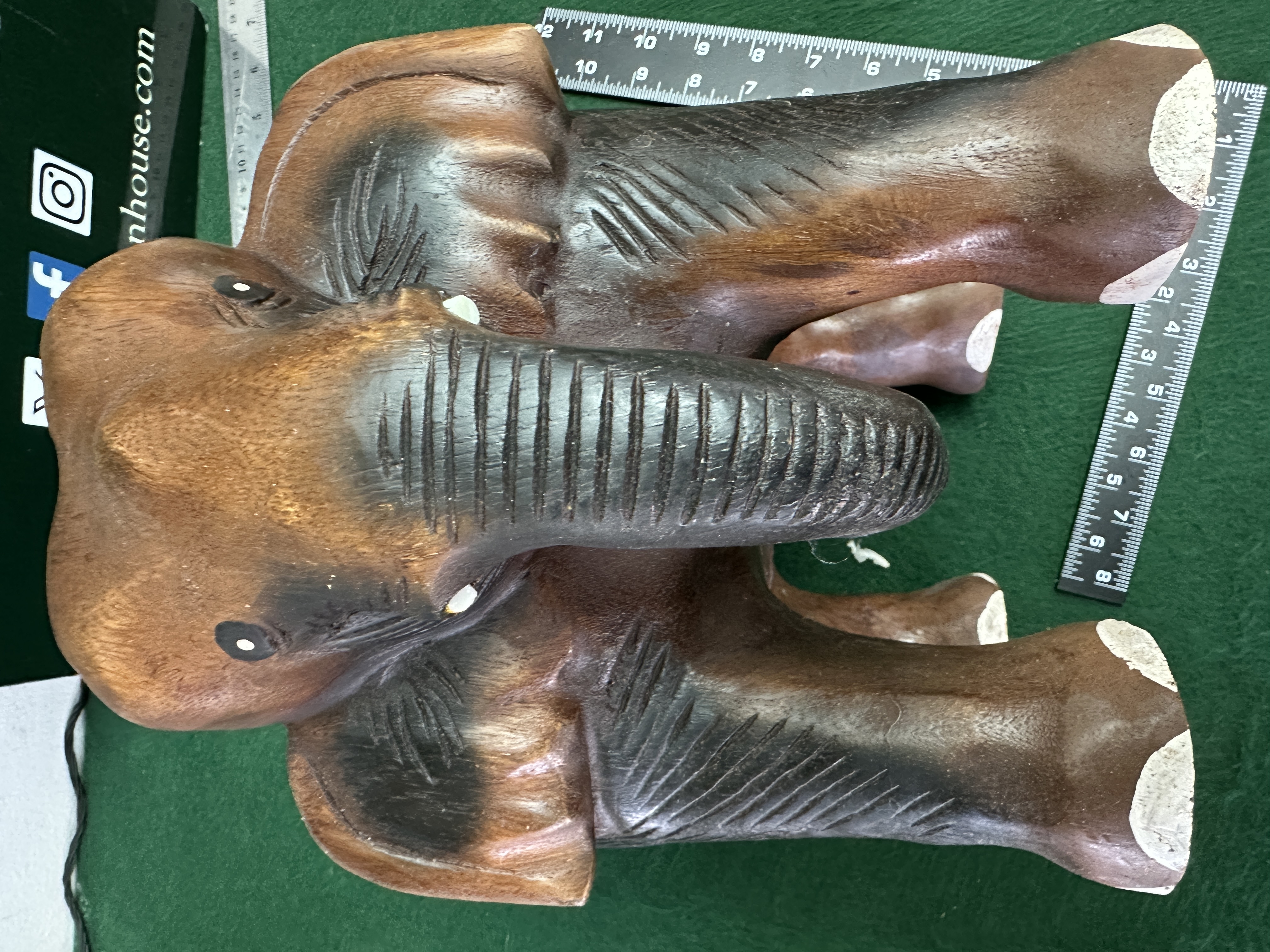 A hand-carved hardwood elephant figurine, designed with a flat circular top for use as a small stool or decorative stand. The piece features incised linear detailing to the trunk, ears, and limbs. The wood is finished in a mid-brown tone with darker scorched or stained highlights within the recesses. The eyes and toe pads are accented with white and black paint. No maker’s marks, signatures, or hallmarks are present.