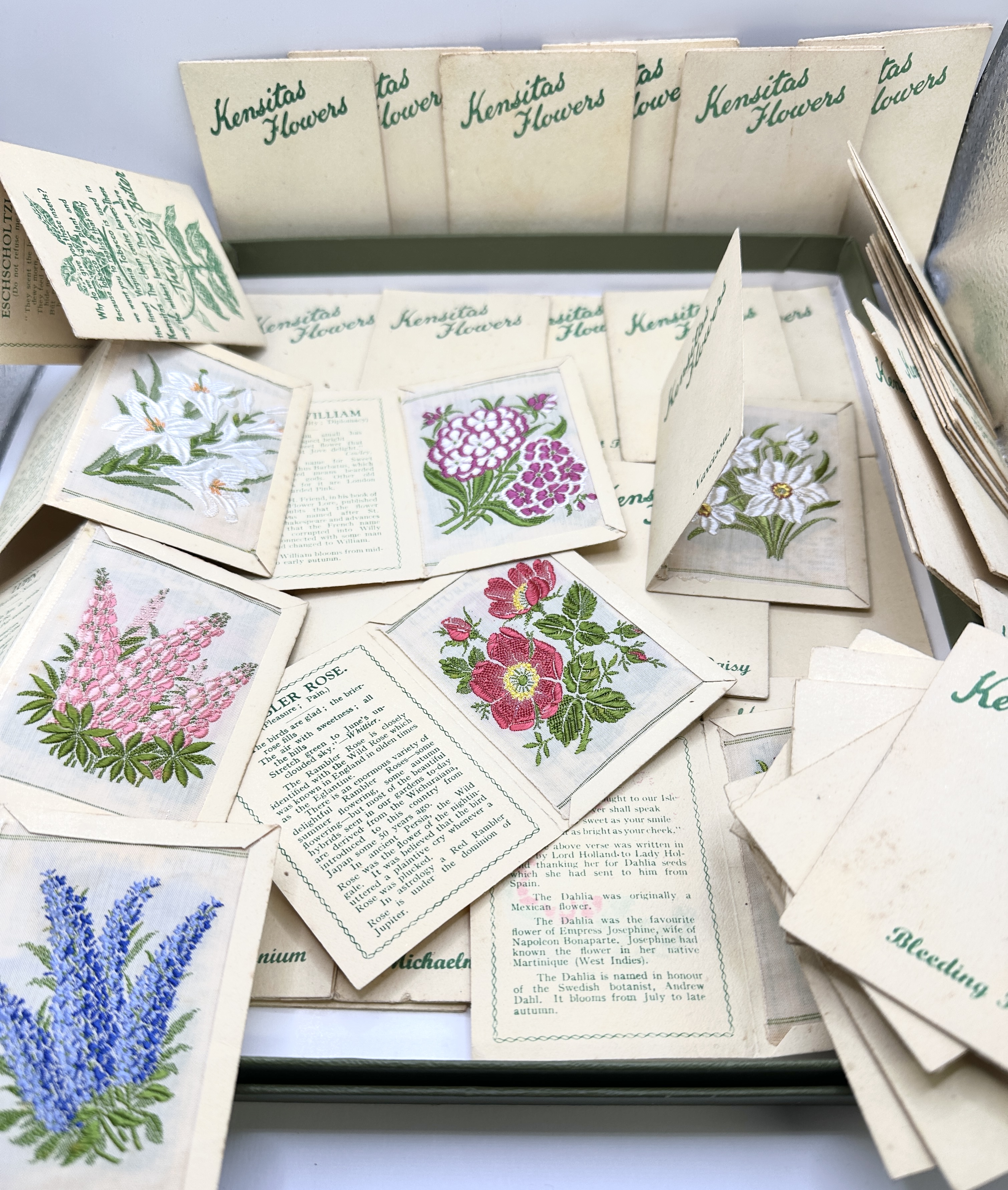 A collection of Kensitas Flowers silk cigarette trade cards, issued by J. Wix and Sons Ltd for Kensitas Cigarettes circa the 1930s. Each item is constructed as a small folding paper booklet. The paper folders feature green printed text including the series title in cursive script and descriptive botanical information or related poetry. Mounted inside each folder is a machine-embroidered silk panel depicting a specific flower in vibrant multi-coloured thread. Identified species within this assortment include Rambler Rose, Dahlia, Narcissus, Lupin, and Bleeding Heart. Promotional text on the interior of the folders includes the slogan Kensitas… Tobacco… They Taste Better.