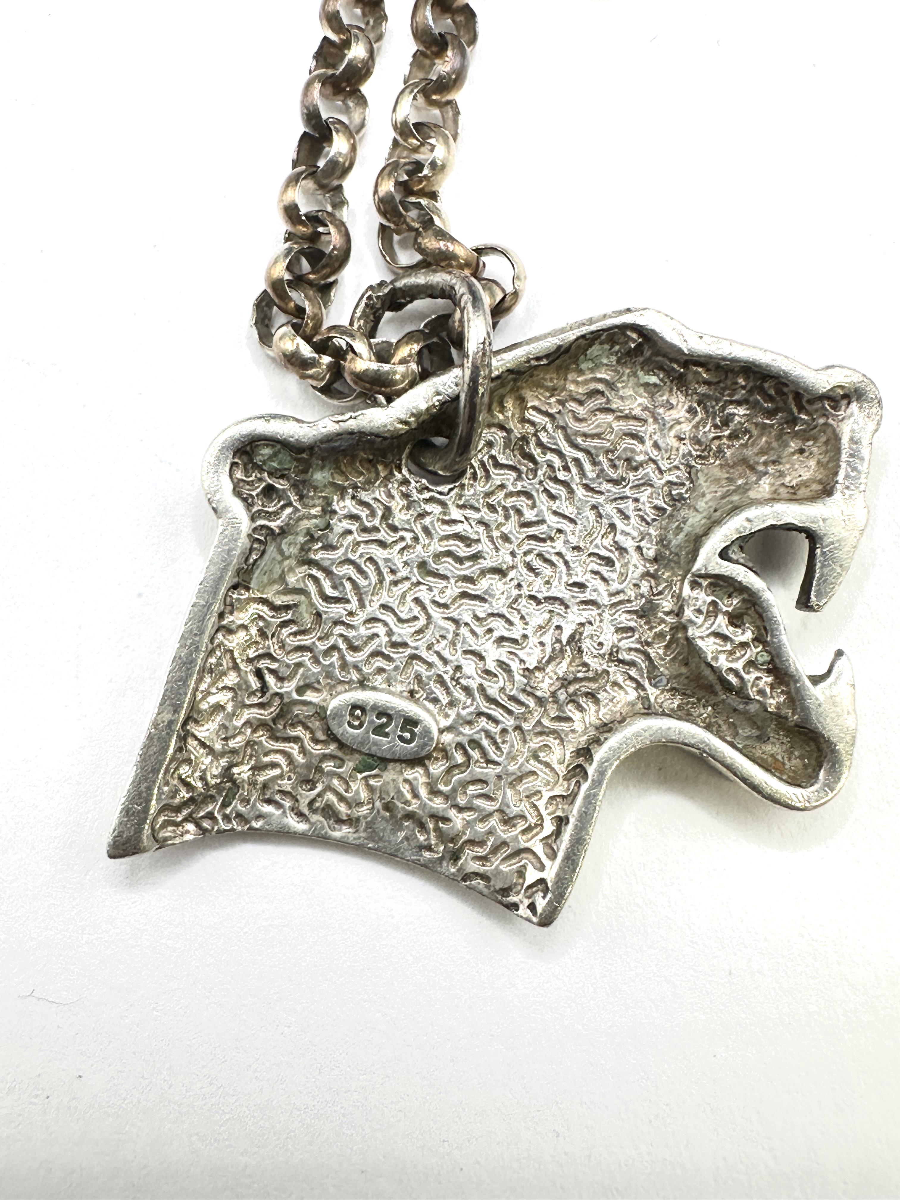 A 925 silver pendant necklace featuring a stylised roaring big cat head, such as a panther or leopard. The pendant is grain-set with small, round brilliant-cut clear gemstones to the eye, ear, and within the open mouth. The reverse of the pendant displays a cast textured pattern and is struck with an oval 925 fineness mark. The pendant is suspended from a silver rolo link chain by a single jump ring.