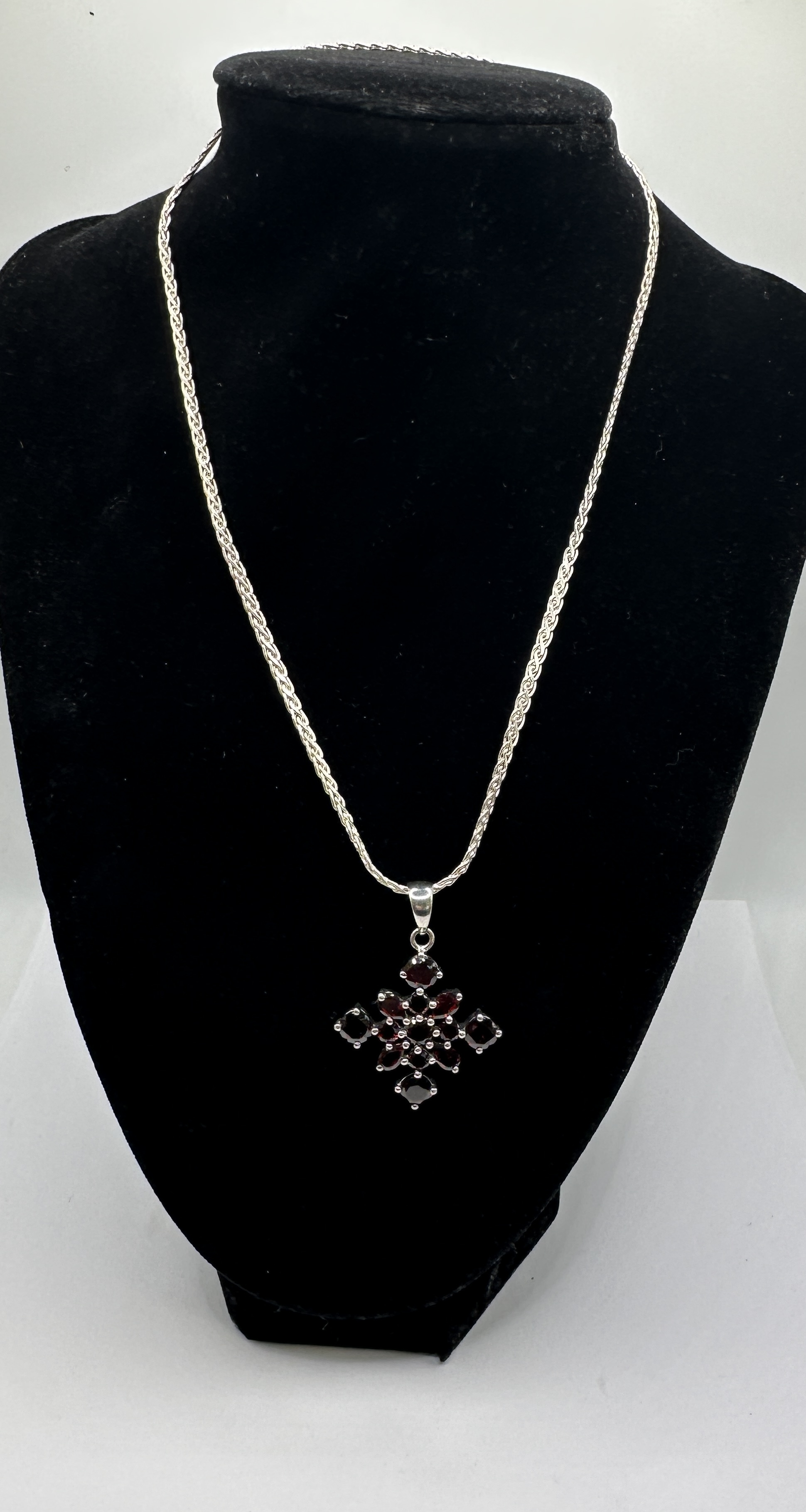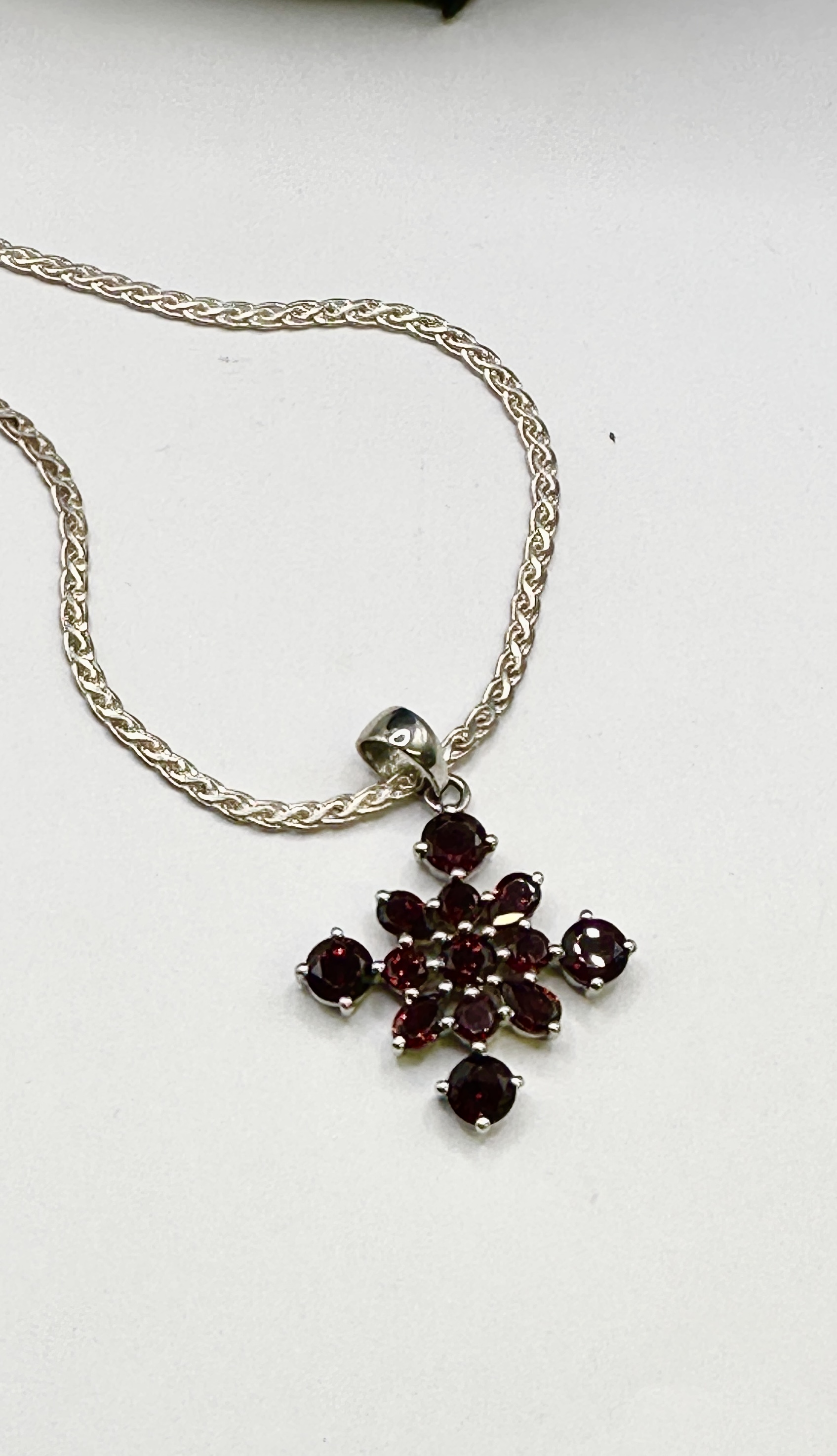 A 925 silver necklace featuring a detachable cruciform pendant set with seventeen faceted deep red garnets. The pendant is constructed in a cluster arrangement with a central round-cut garnet surrounded by eight marquise-cut garnets in a radiating pattern. Four larger round-cut garnets are set at the cardinal points, accented by four smaller round-cut garnets. All gemstones are secured in multi-claw settings. The pendant is suspended from a polished tapered bail on a 925 silver spiga or wheat-link style chain. A small, illegible mark is present on the side of the bail.