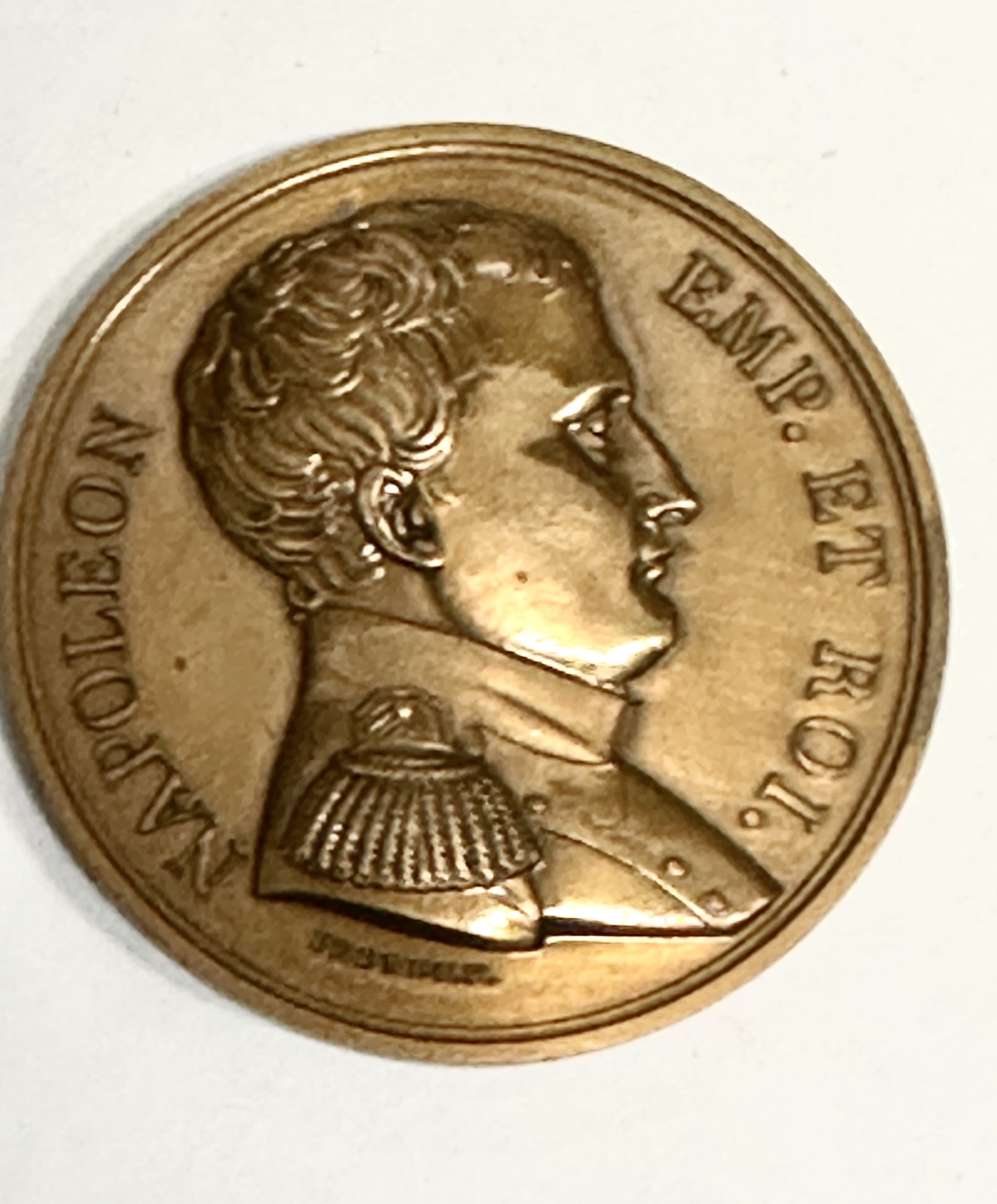 This bronze commemorative medal is part of the National Medals series published by James Mudie. The obverse features the Napoleon Empereur et Roi type by Jean-Bertrand Andrieu, inscribed NAPOLEON EMP. ET ROI. with the signature ANDRIEU F. below the bust. The reverse features the Surrender to H.B.M.S. Bellerophon type by Nicolas-Guy-Antoine Brenet, inscribed SURRENDER TO H.B.M.S. BELLEROPHON CAPT. MAITLAND. around the upper edge. The exergue contains the date XV. JULY MDCCCXV. and is signed BRENET F. to the left and MUDIE D. to the right. This medal commemorates the surrender of Napoleon Bonaparte to Captain Frederick Maitland of the British Royal Navy on 15 July 1815.