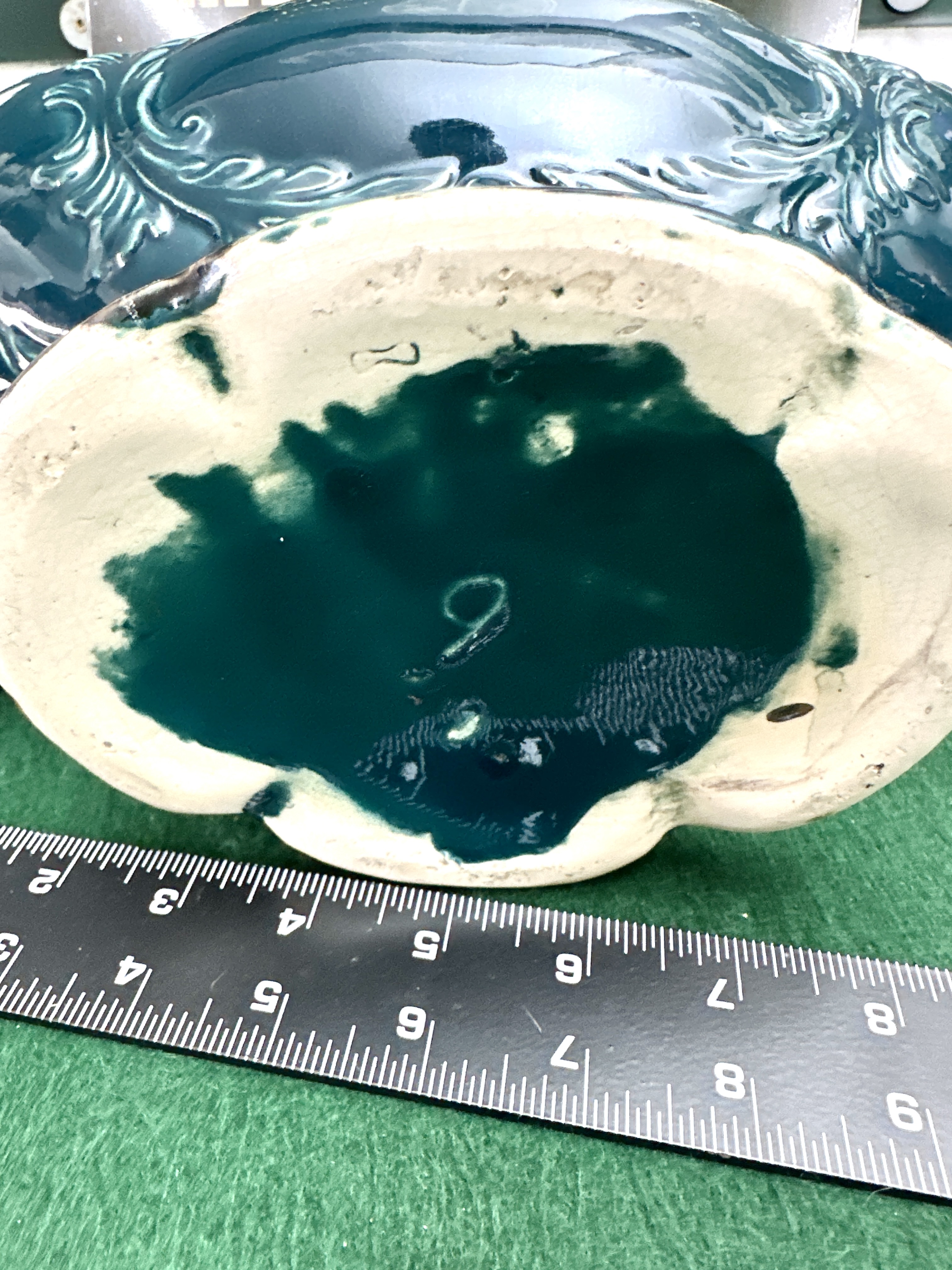 A large ceramic centrepiece bowl produced in the Rococo-revival style, featuring a deep teal-green glaze with polychrome and gilt accents. The vessel is designed with elaborate scrolled handles and a matching scalloped pedestal base, both decorated with gilt floral motifs. A central hand-painted cartouche depicts a classical mythological scene containing multiple figures and a chariot. The underside of the footed base displays an impressed numerical mark 9 alongside other indistinct incised markings.