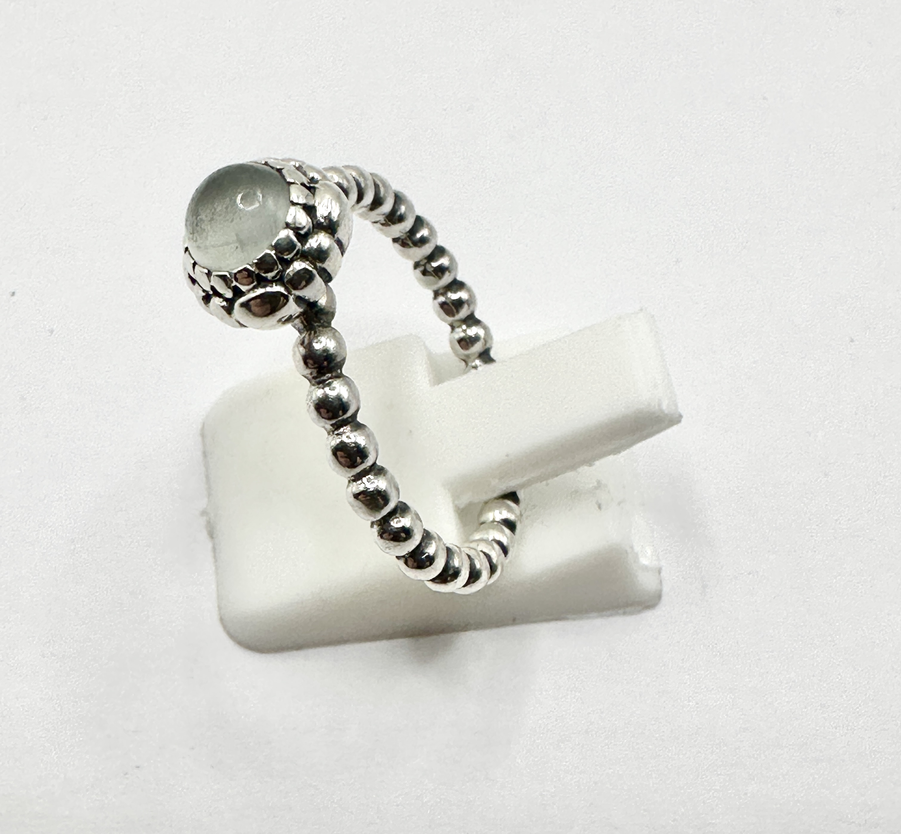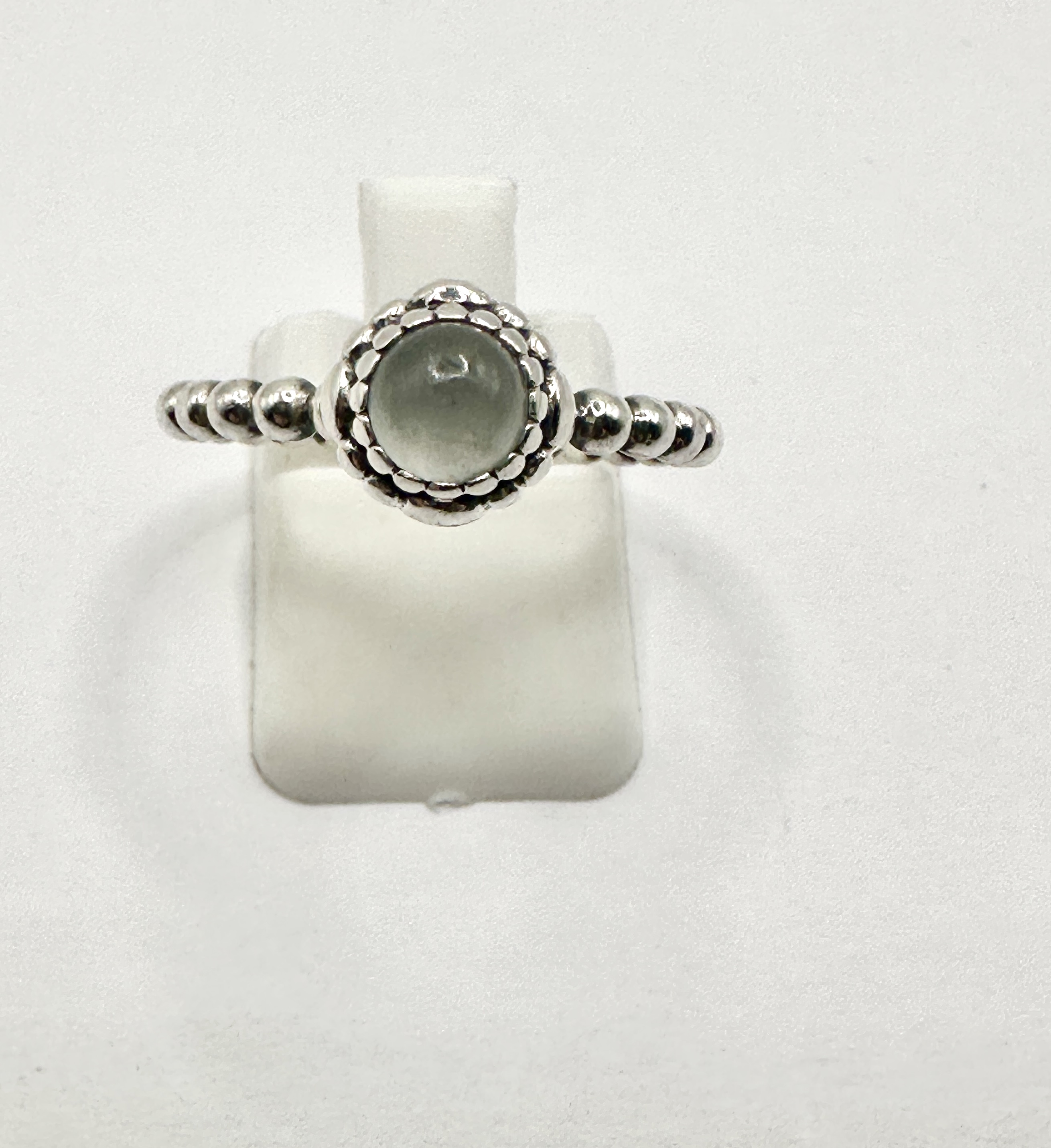 A Pandora Birthday Blooms June ring, identified as a retired design from the maker. The piece is crafted from 925 silver and features a centrally set round cabochon-cut moonstone. The gemstone is translucent with a pale green to grey tone, held within a decorative scalloped bezel setting. The band is formed of a continuous row of polished silver spheres. Internal markings are present on the inner band but are not clearly legible in the provided images.