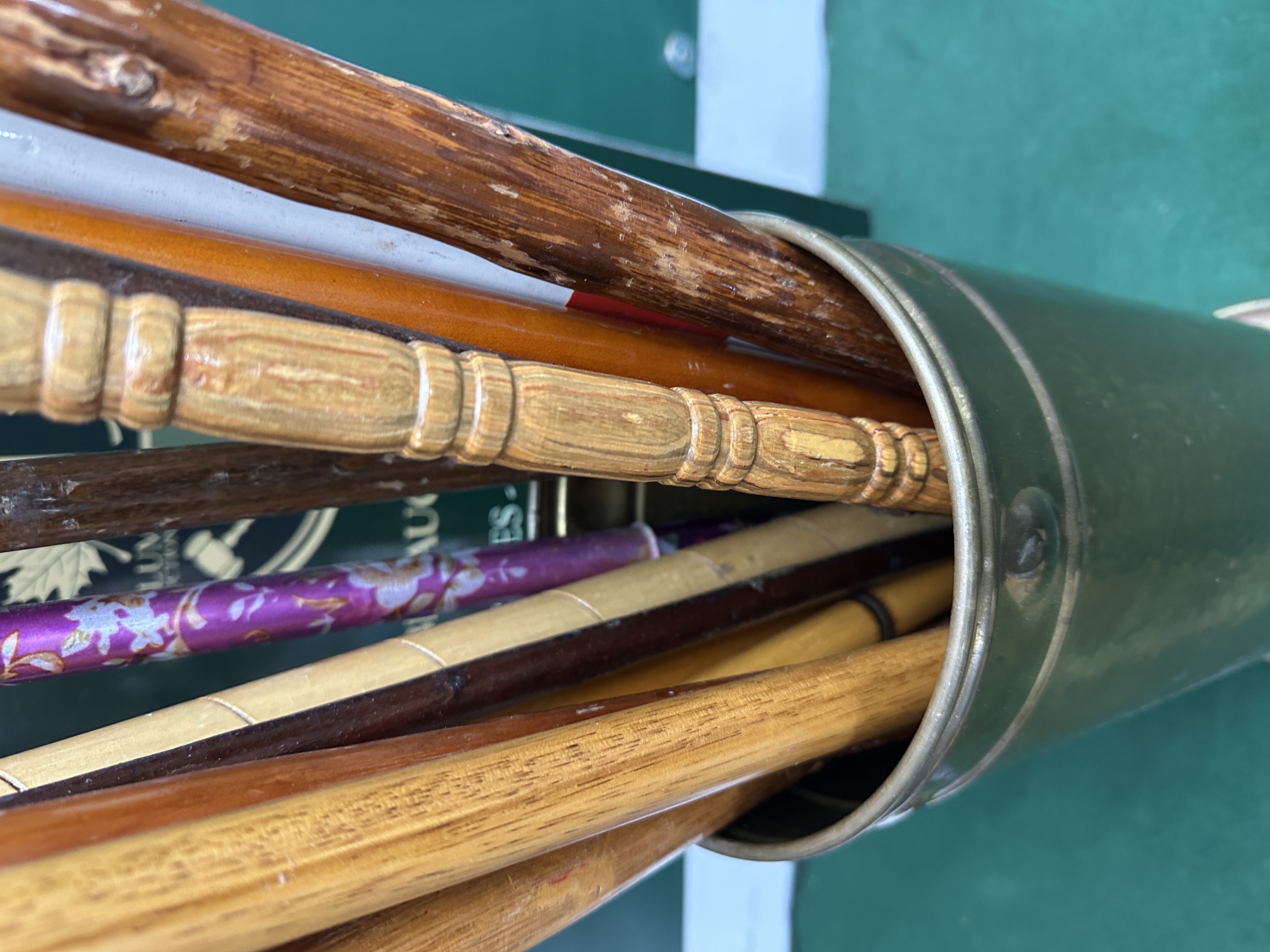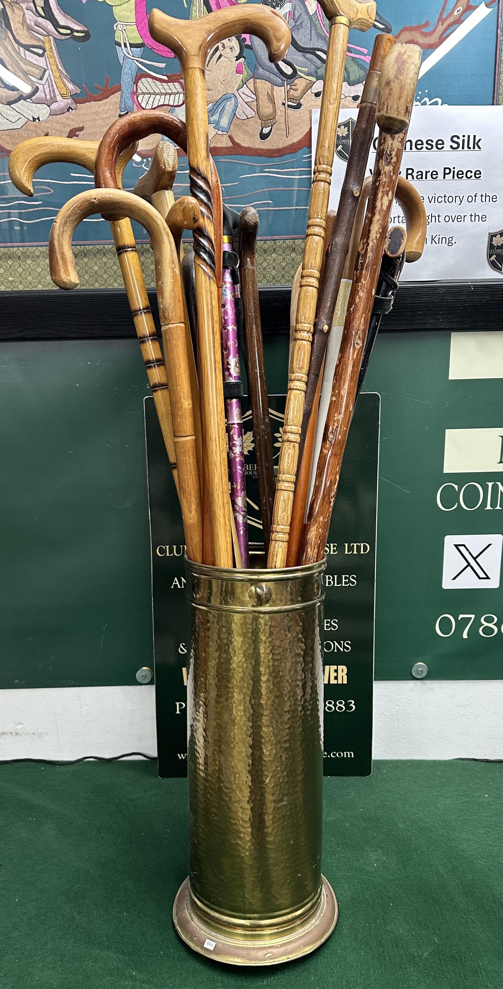 A collection of assorted walking sticks and canes presented in a cylindrical brass vessel. The vessel is constructed from a large-calibre artillery shell casing, featuring a hand-hammered texture to the body, a flared stepped base, and a plain top rim secured with visible studs. The walking sticks comprise various wooden shafts, including examples in ash, hazel, and bamboo. Handle forms include multiple carved crooks, a large T-shaped handle, and a turned wooden handle. One modern telescopic cane is included, featuring an aluminium shaft with a purple floral decorative pattern. No manufacturer marks, silver hallmarks, or internal system features are visible on the items. A small white adhesive label with the printed characters 778 is attached to the flared base of the vessel.