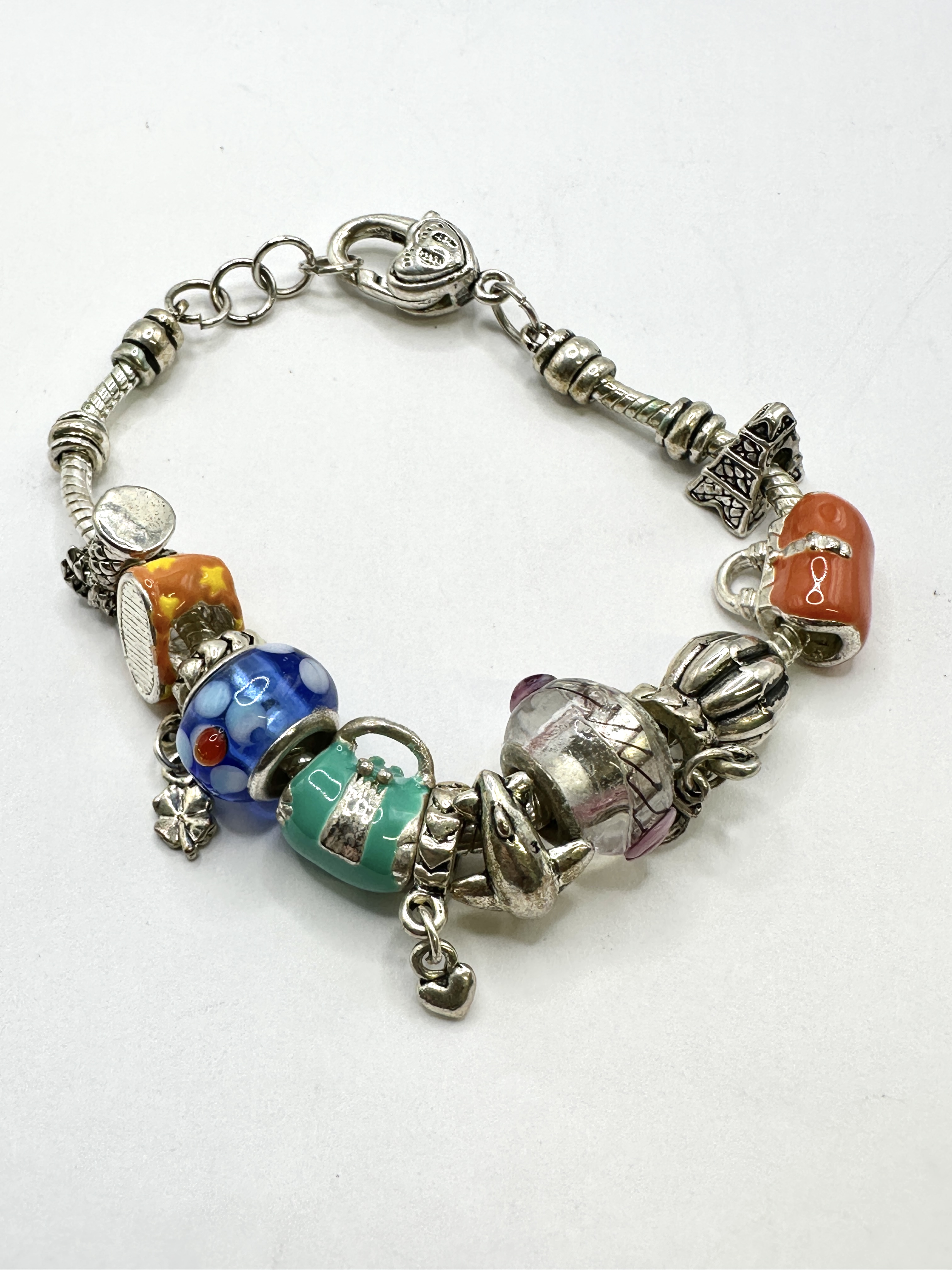 The piece shows light signs of wear and minor surface tarnish in the recessed areas of the charms, consistent with previous use. The enamel and glass elements appear to be in good order with no visible chips or cracks.