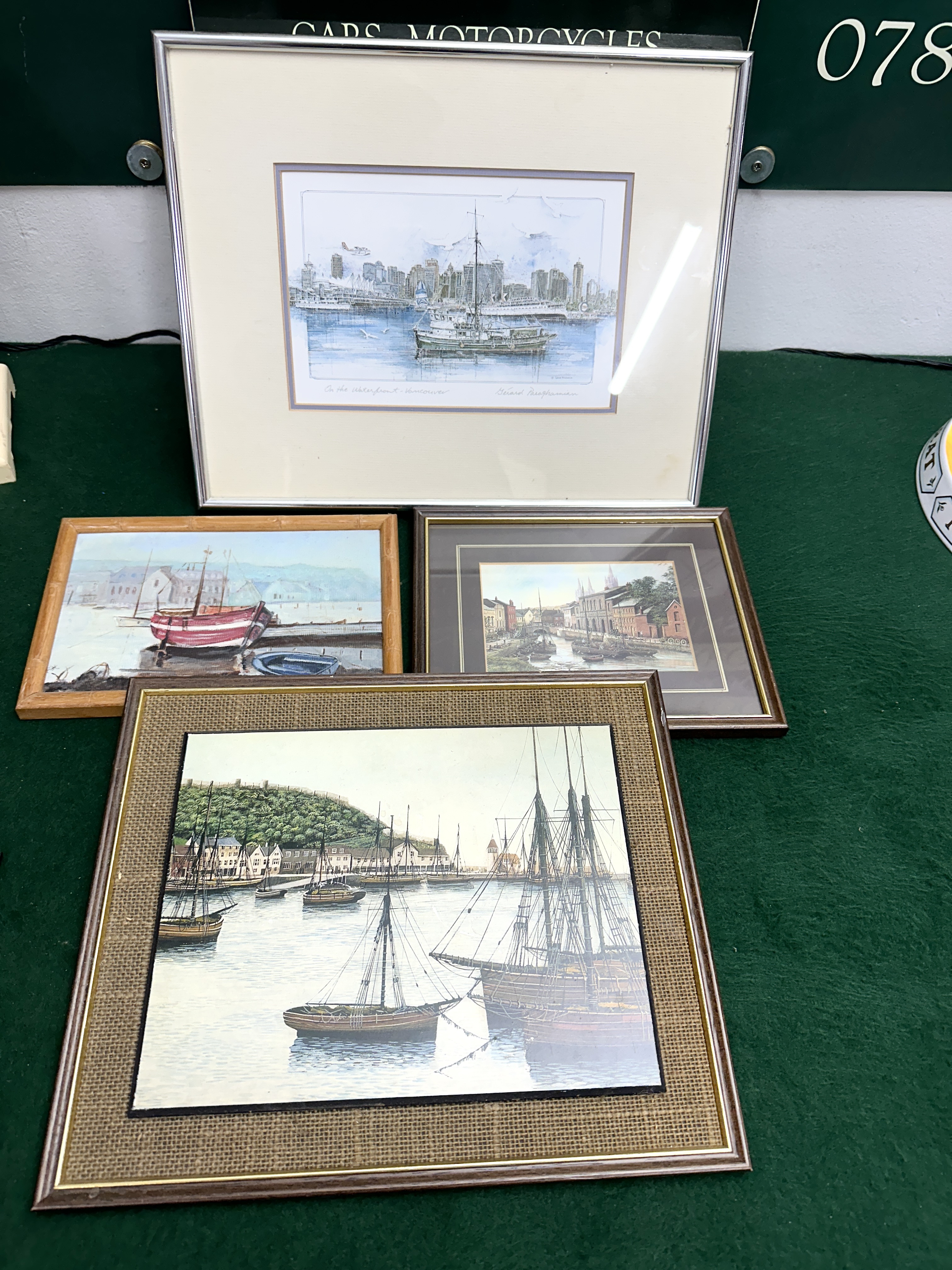A group of maritime and harbour-themed artworks in various media. The collection is led by a framed print on paper titled On the Waterfront – Vancouver by Gerard Brughamian. The work depicts a city skyline with a central vessel and is inscribed with the title to the lower left and signed Gerard Brughamian to the lower right. It is housed in a silver-toned frame with a wide cream mount. The group further includes a small oil or acrylic painting on board depicting a red boat moored at a quay, presented in a light wood frame. Also present is a small print of a canal scene with buildings in a dark wood-effect frame with a double mount, and a larger print or painting depicting a harbour scene with numerous sailing masts and a hillside town, featuring a textured burlap-style mat and a wood frame.