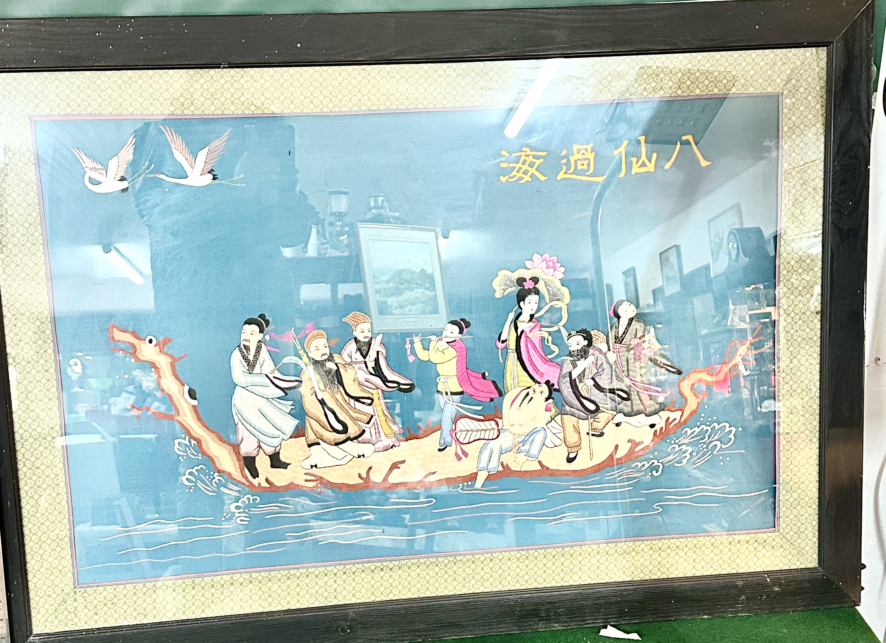 This silk embroidery panel depicts the traditional Taoist theme of the Eight Immortals Crossing the Sea (Baxian guo hai). The figures are worked in polychrome silk threads on a deep teal-blue silk ground, shown riding a log-form vessel over stylised crested waves. Two cranes, representing longevity, are embroidered in the upper left corner. The upper right quadrant features four embroidered Chinese characters reading 八仙過海 (Bāxiān guò hǎi), identifying the narrative scene. The work is mounted with a patterned silk brocade border and presented in a modern black-stained wooden frame under glass. A small label on the glass describes the piece as Chinese Silk and refers to the narrative as the victory of the Immortal Eight over the Dragon King.