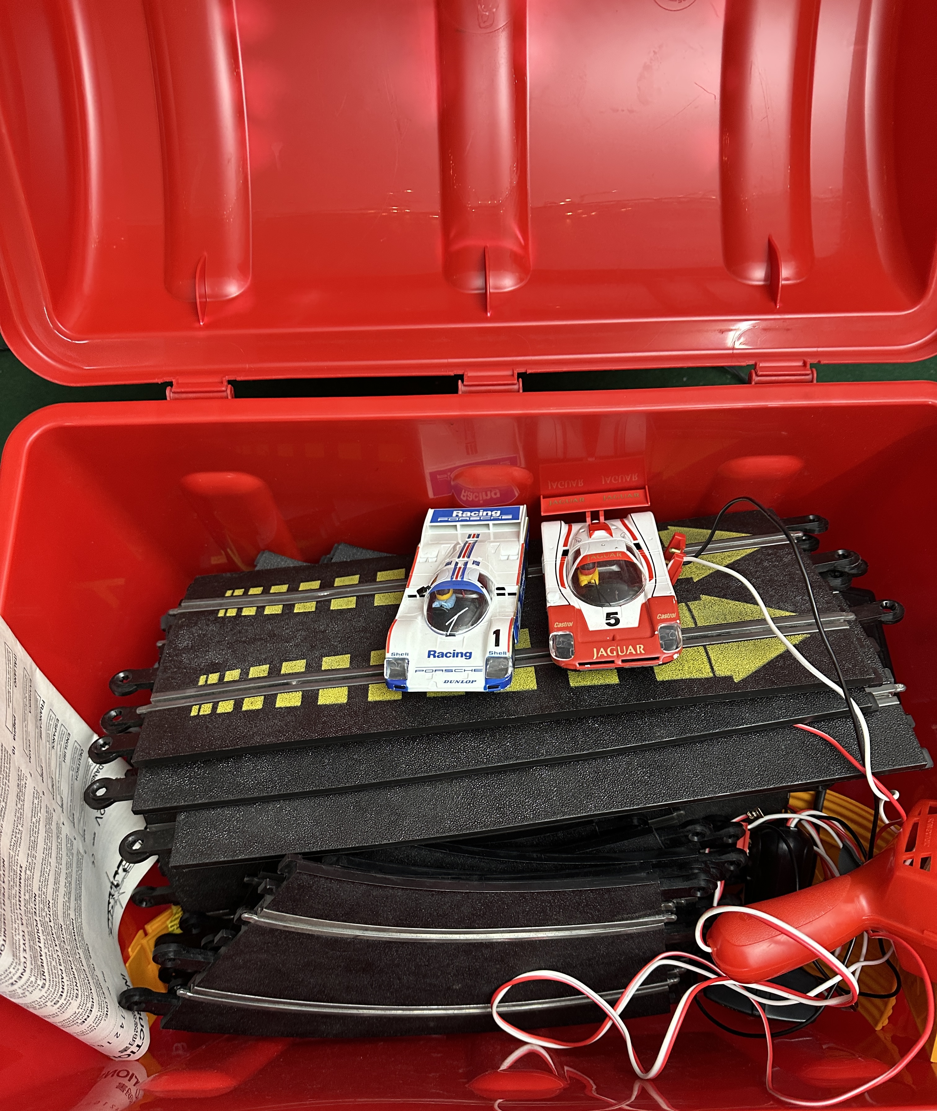 The set is in used condition with visible wear to the car decals and light surface marking to the track sections. The items are housed in a non-standard red plastic storage chest rather than the original retail cardboard packaging. The electrical components and mechanical functionality are untried and untested.