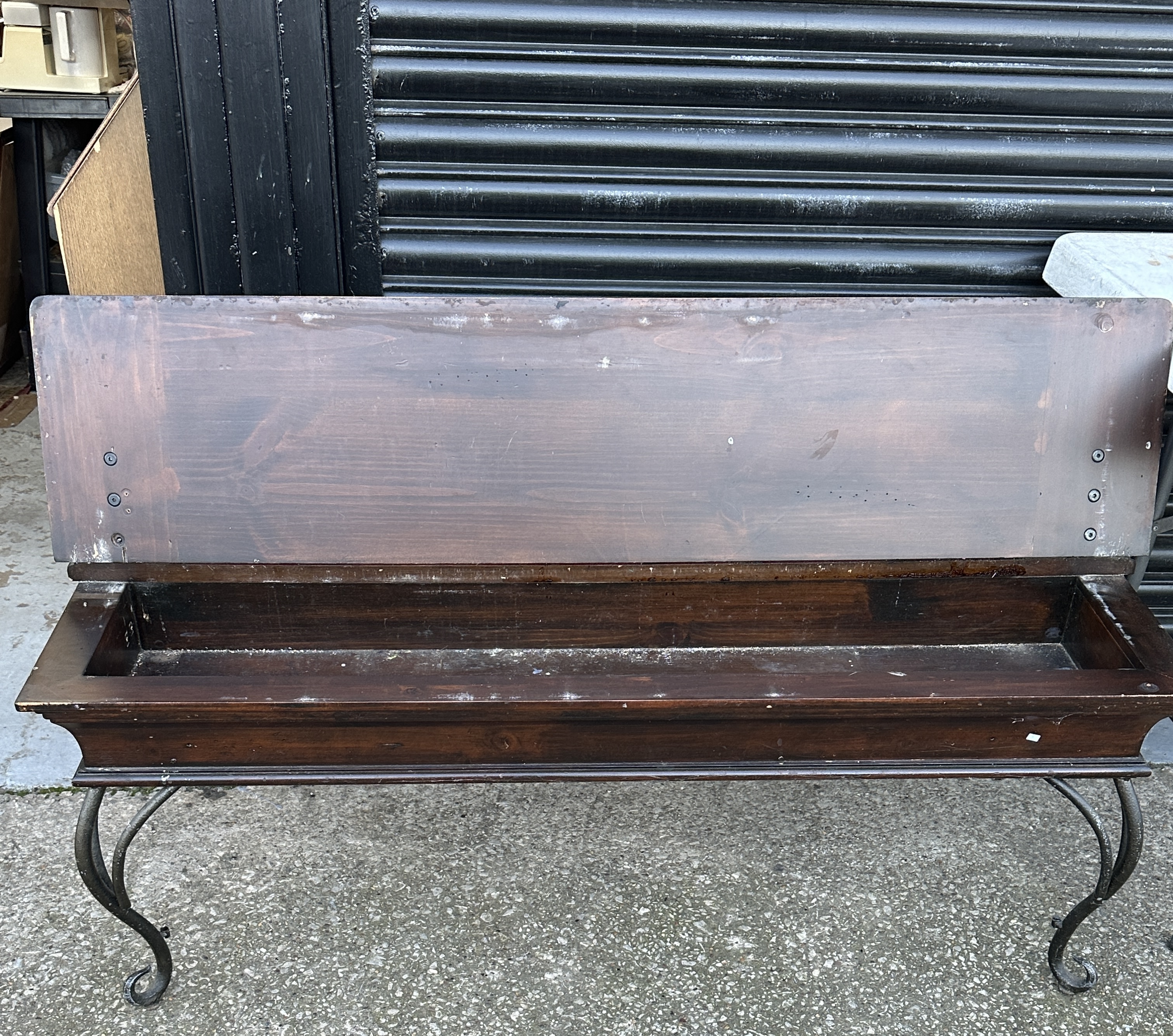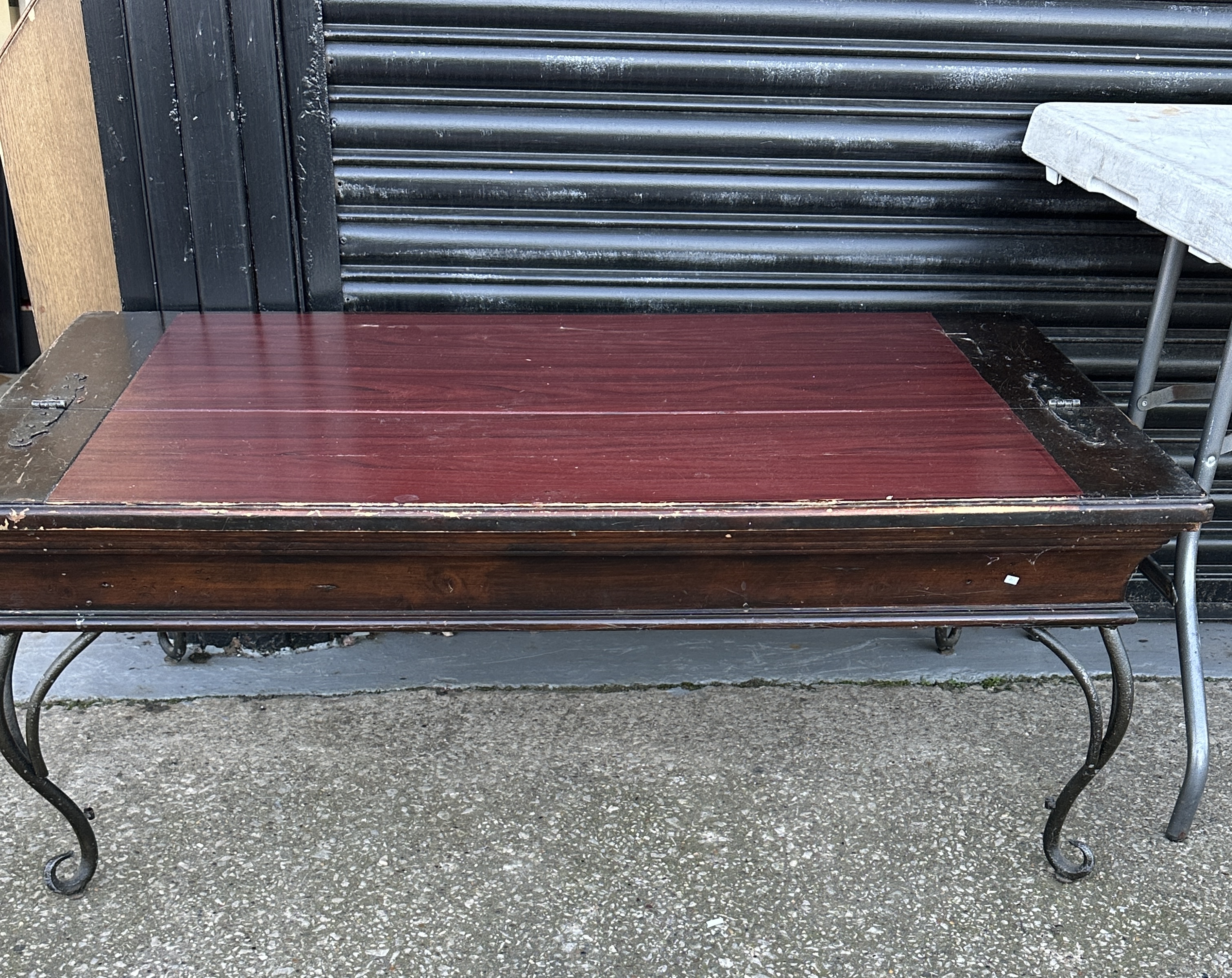 A 20th-century storage coffee table in the Spanish Revival style. The piece features a dark-stained wooden frame surrounding a central rectangular panel with a prominent reddish wood grain finish, likely a rosewood veneer or laminate. The top is constructed with a longitudinal hinge that opens to reveal a shallow internal storage compartment. The top surface is further detailed with two cast metal decorative strap plates. The table is supported by a base consisting of four scrolled wrought iron legs with a textured finish. No maker’s marks or labels were identified during inspection.