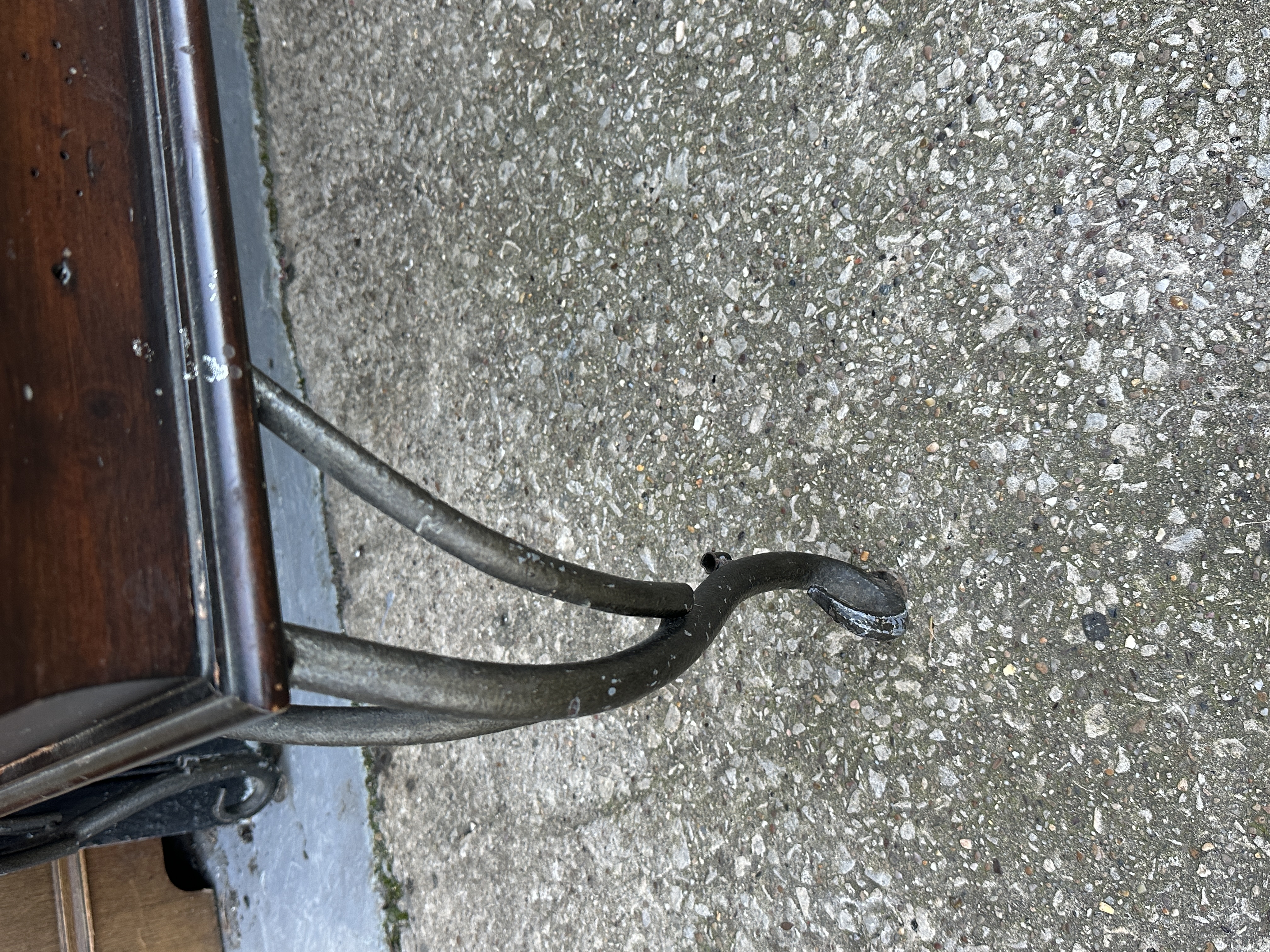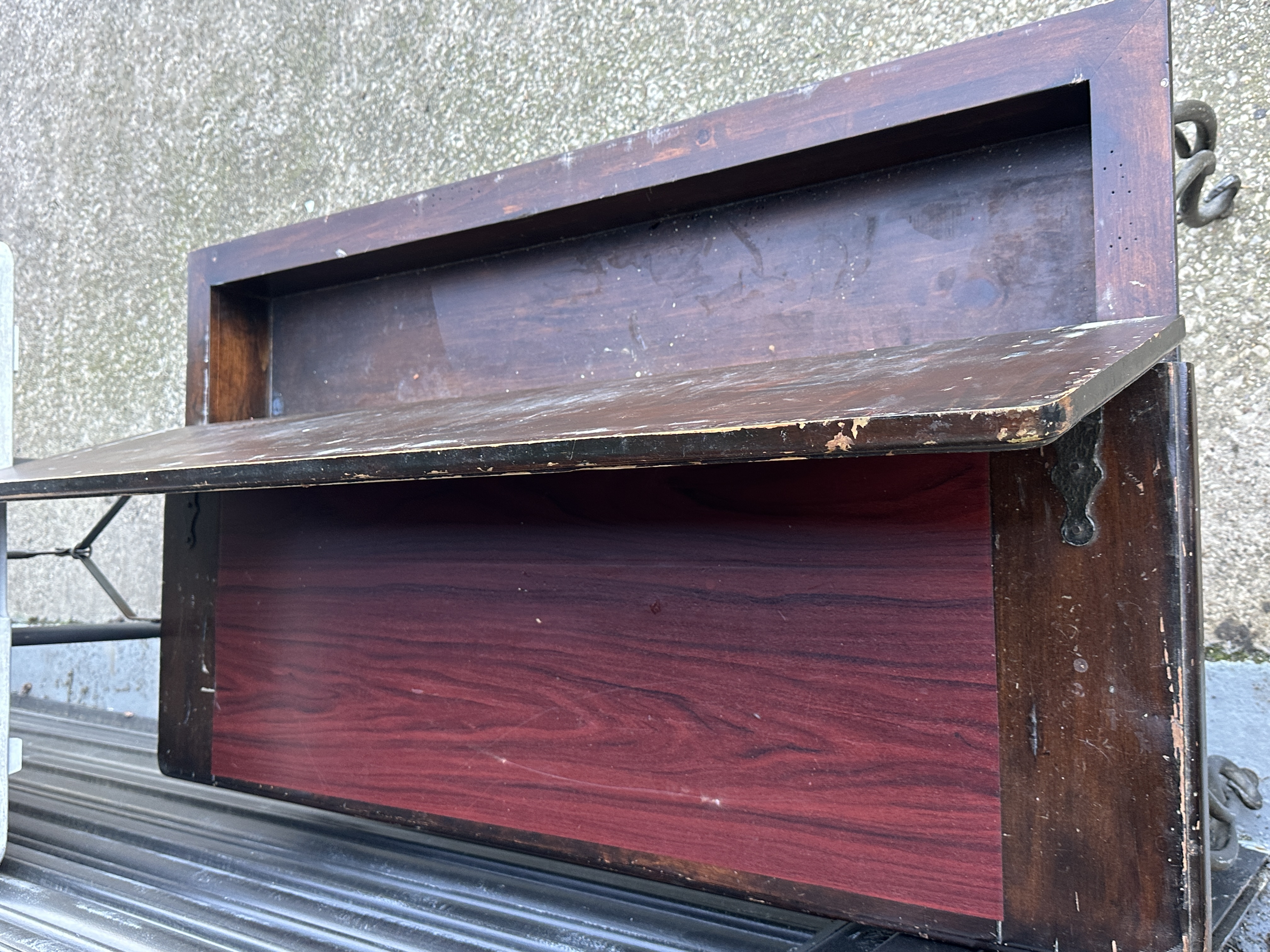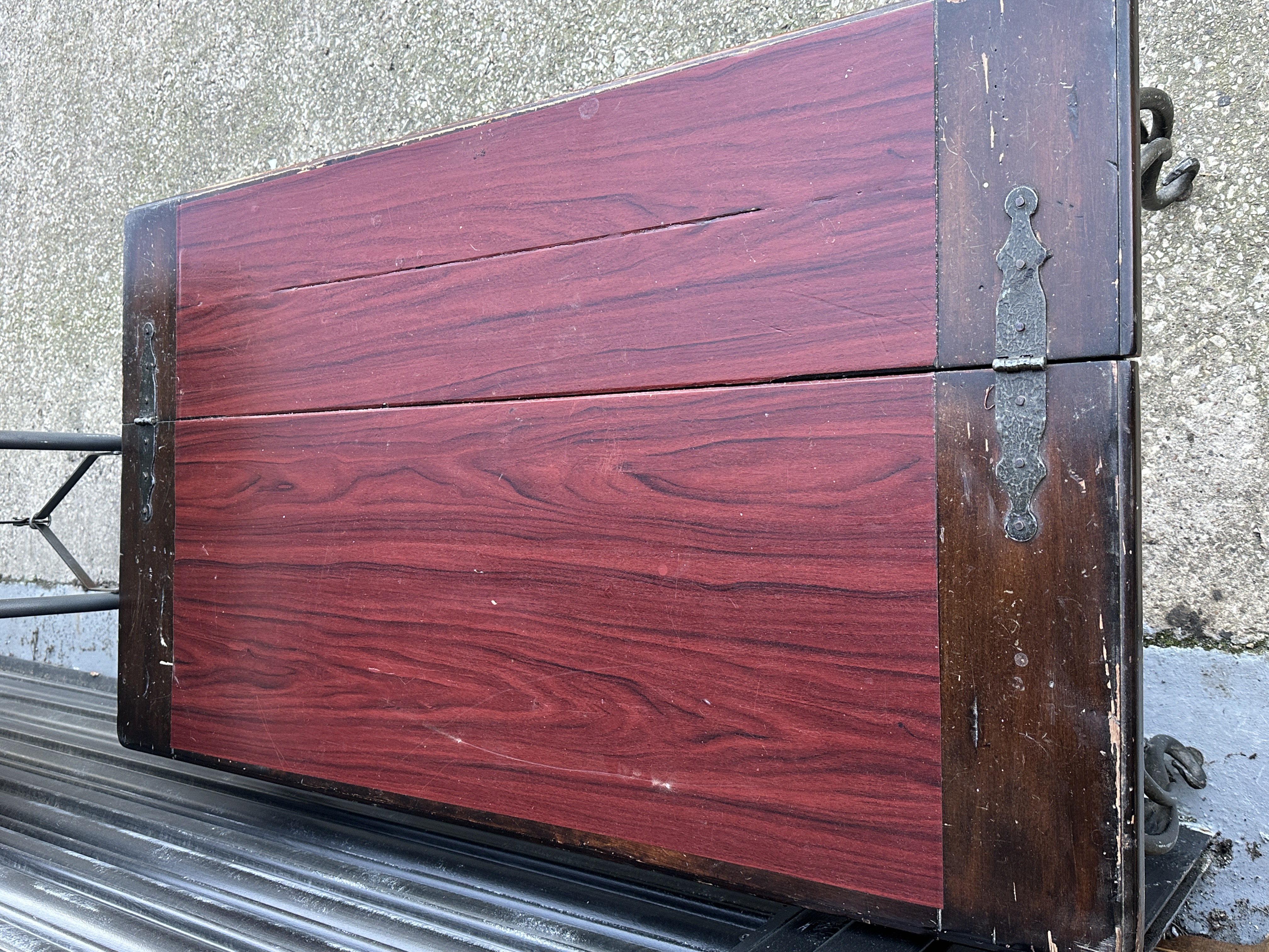 The table is in fair to good used condition. There are visible surface scratches and scuffs across the top. Significant wear and chipping to the finish are present along the edges of the central reddish panel. The wooden frame exhibits general age-related nicks and minor finish loss. The internal compartment shows signs of use and dust. The wrought iron legs show minor surface wear and oxidation consistent with age.