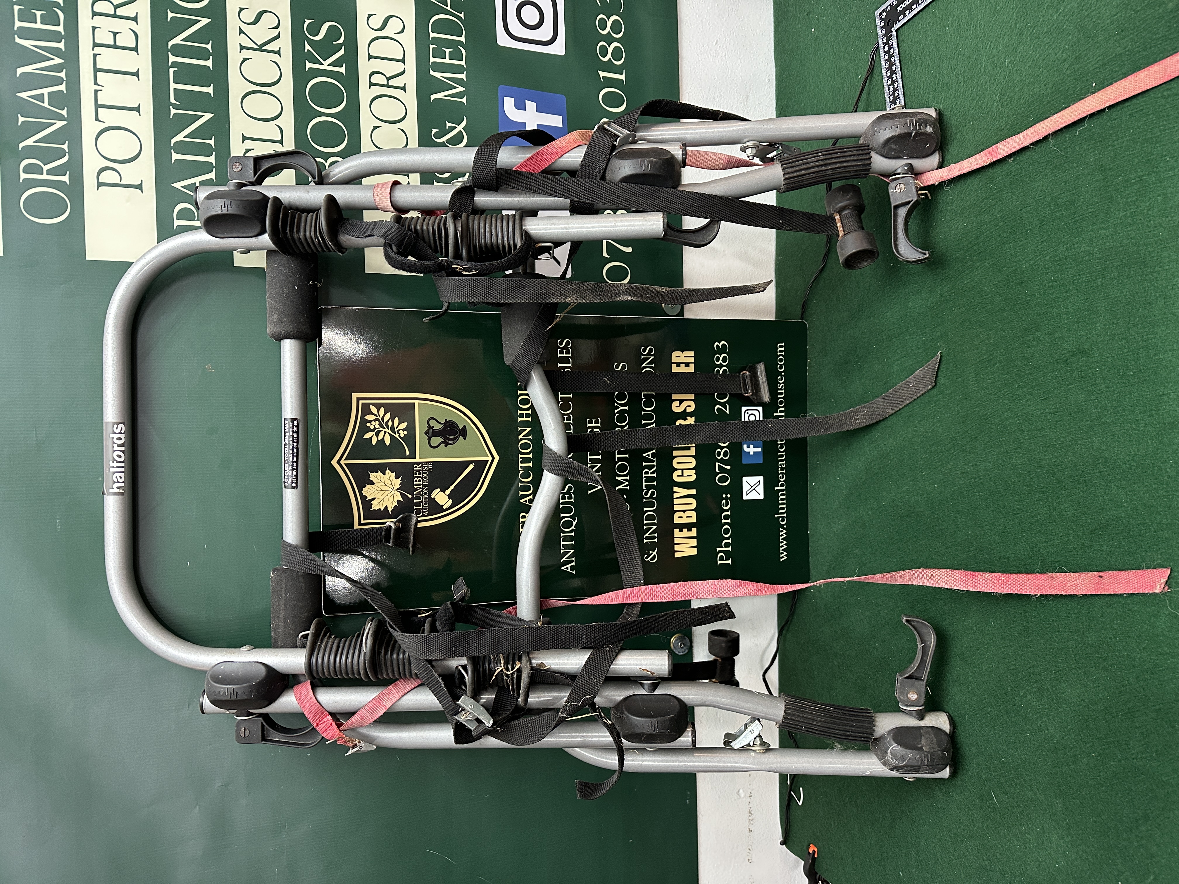 A Halfords brand rear-mounted bicycle carrier constructed from a silver-finished tubular metal frame. The rack is designed to accommodate up to three bicycles and includes black foam protective padding and adjustable nylon webbing straps in red and black. A manufacturer label is present on the side of the frame bearing the Halfords name. A safety sticker is affixed to the metalwork stating 3 CYCLES – TOTAL 45kg MAX and provides instructions regarding strap tension. The unit features plastic cradles and adjustment knobs for securing the frame to a vehicle trunk or hatch.