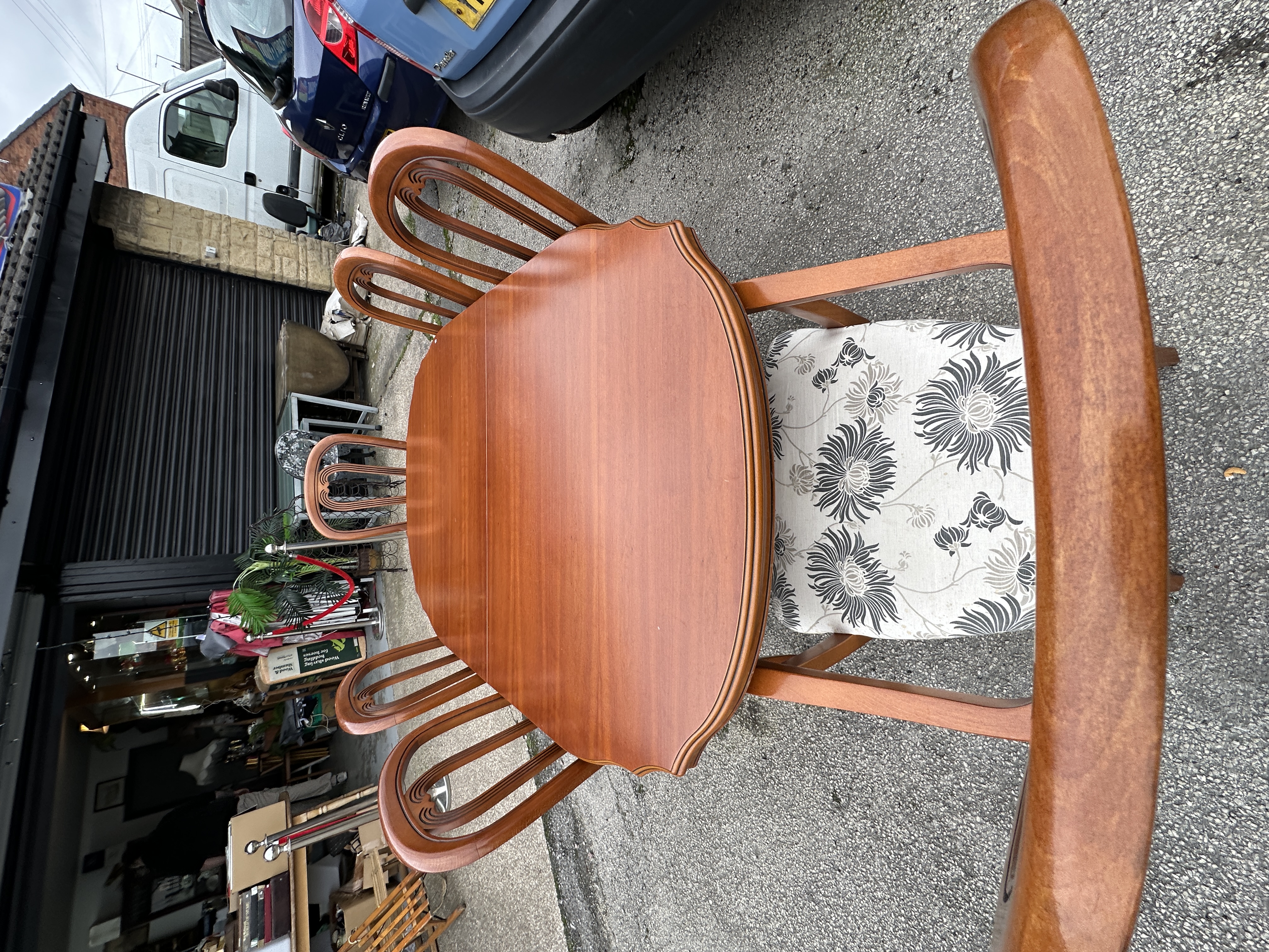 A late 20th-century dining suite in the traditional reproduction style, likely of British manufacture. The suite includes an oval dining table featuring a shaped serpentine edge and a warm cherry or yew wood-toned veneer top. The table is supported by a central turned pedestal base terminating in four splayed cabriole-style legs. The underside of the table is fitted with metal hinges and a mechanism indicating an extendable design. Accompanying the table is a set of matching dining chairs, each designed with an arched, openwork splat back. The chair seats are upholstered in a contemporary grey and white floral patterned fabric. The construction utilizes a combination of solid wood and veneers with a high-gloss finish applied to the table surface. No maker’s marks or stamps were identified during inspection.