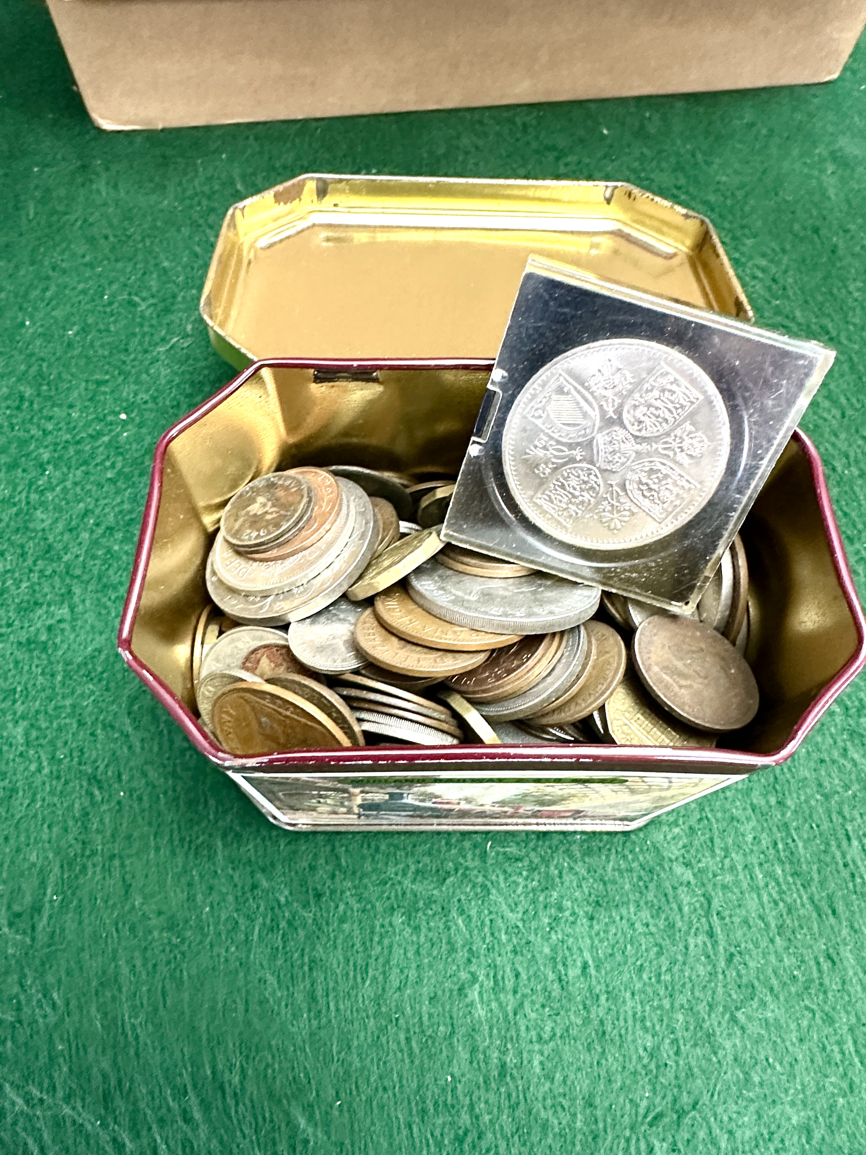 The coins exhibit a range of conditions from well-circulated with significant wear, surface marks, and dark patination to some pieces retaining original lustre. No professional grading is present. The tin shows minor surface wear, scratches, and oxidation consistent with age and use.