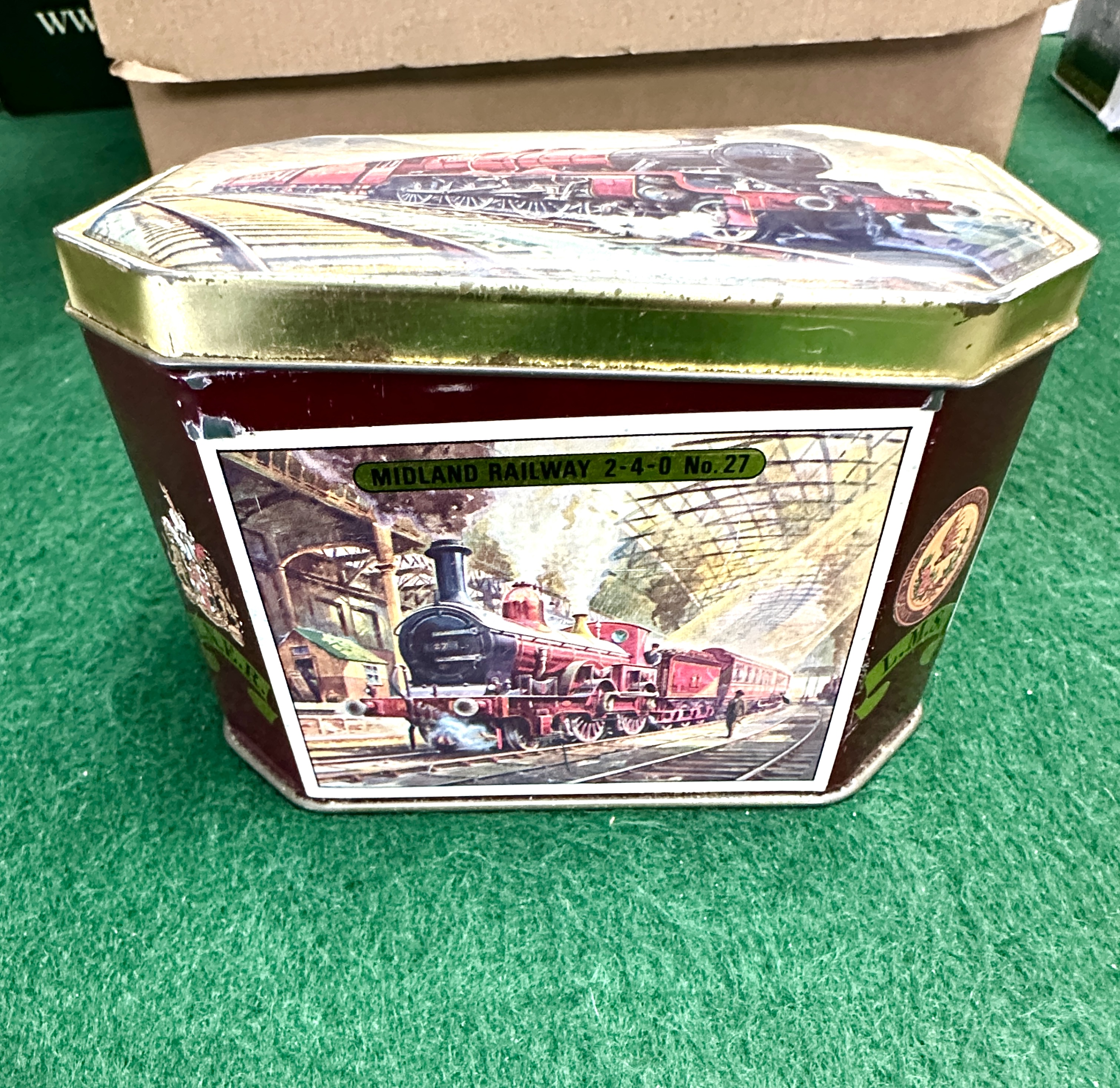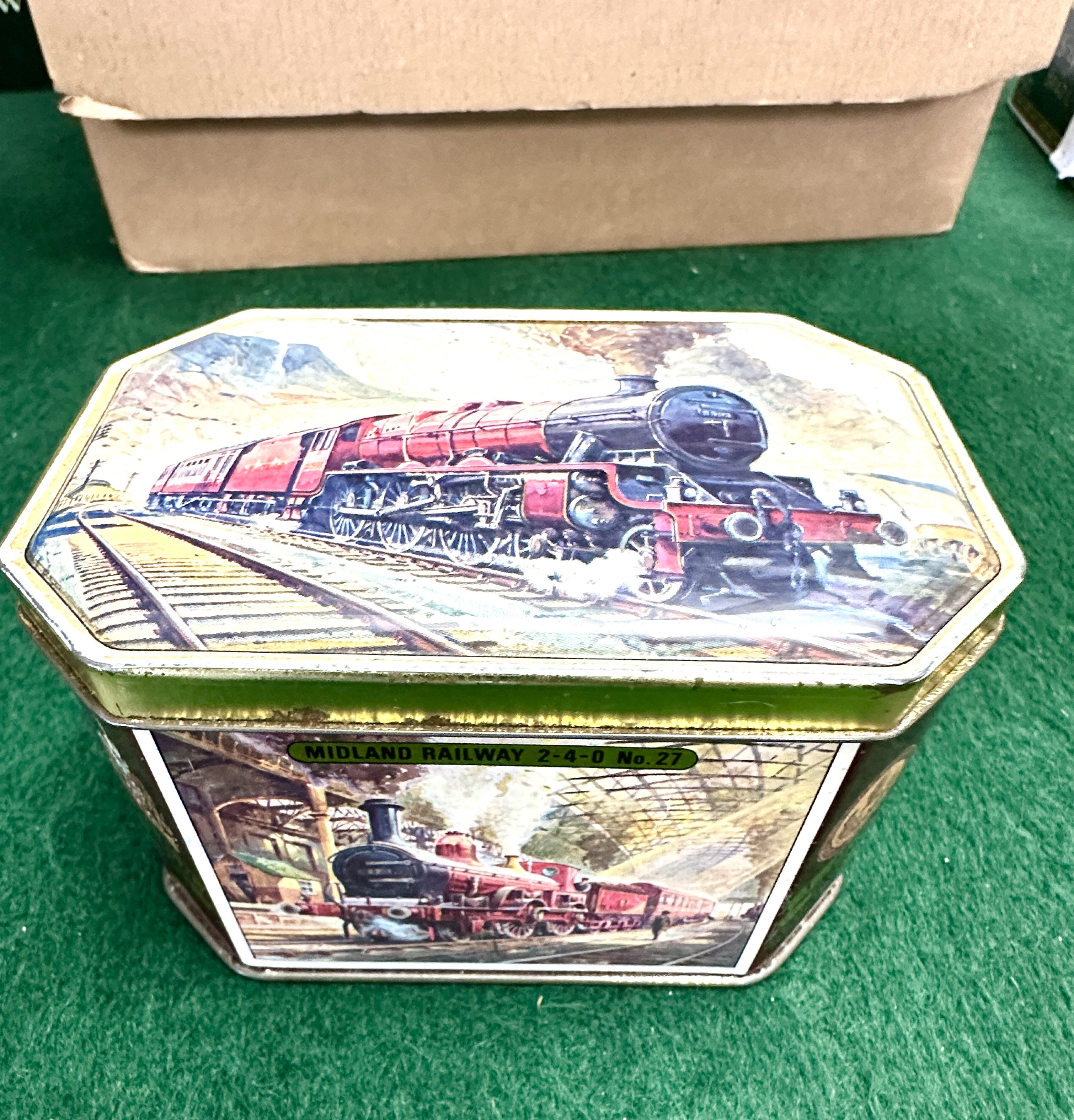 A collection of UK coins housed in a vintage octagonal lithographed tin. The tin is decorated with steam locomotive illustrations, including a panel titled Midland Railway 2-4-0 No. 27. The collection includes a crown denomination in a clear plastic flip featuring a cruciform shields reverse. The assortment contains various pre-decimal and decimal denominations including bronze pennies and halfpennies, brass threepences, and cupro-nickel florins, shillings, and sixpences. A penny dated 1947 is visible. The lot comprises a diverse range of denominations and dates from the 20th century.