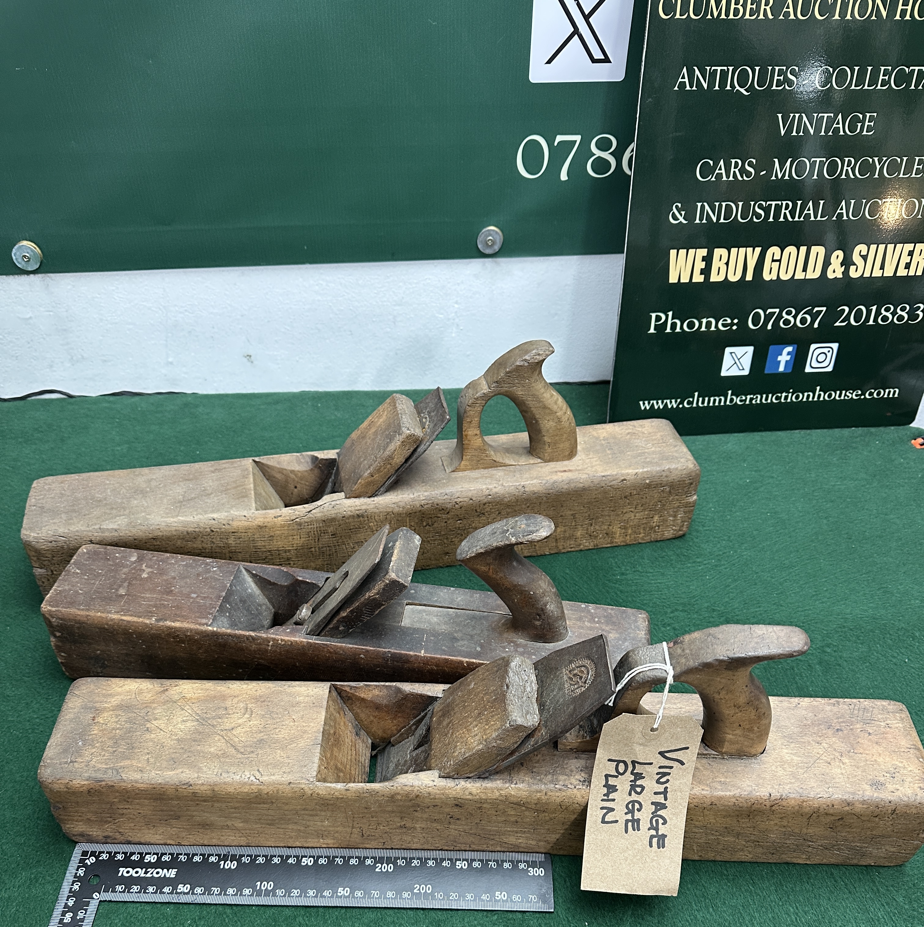 A trio of vintage wooden hand planes of English type, typically used for jointing and smoothing in traditional woodworking. Each tool is constructed with a solid hardwood block, an integrated wooden tote handle, a metal iron, and a wooden wedge for securing the blade. One metal iron features a circular stamped manufacturer’s mark. The collection includes a handwritten auction tag identifying the group as vintage large planes. The construction and form are consistent with 19th or early 20th-century English workshop tools.