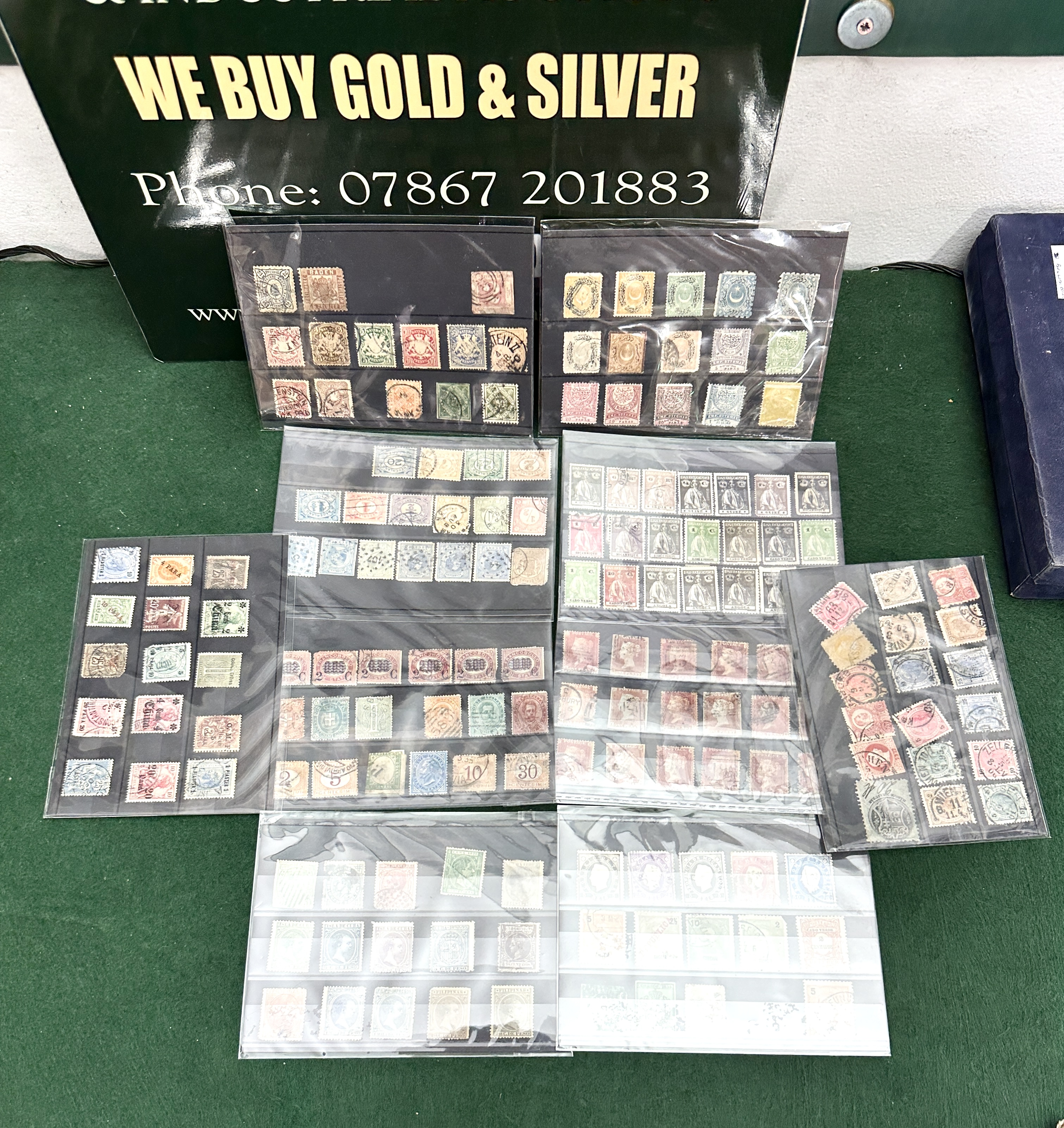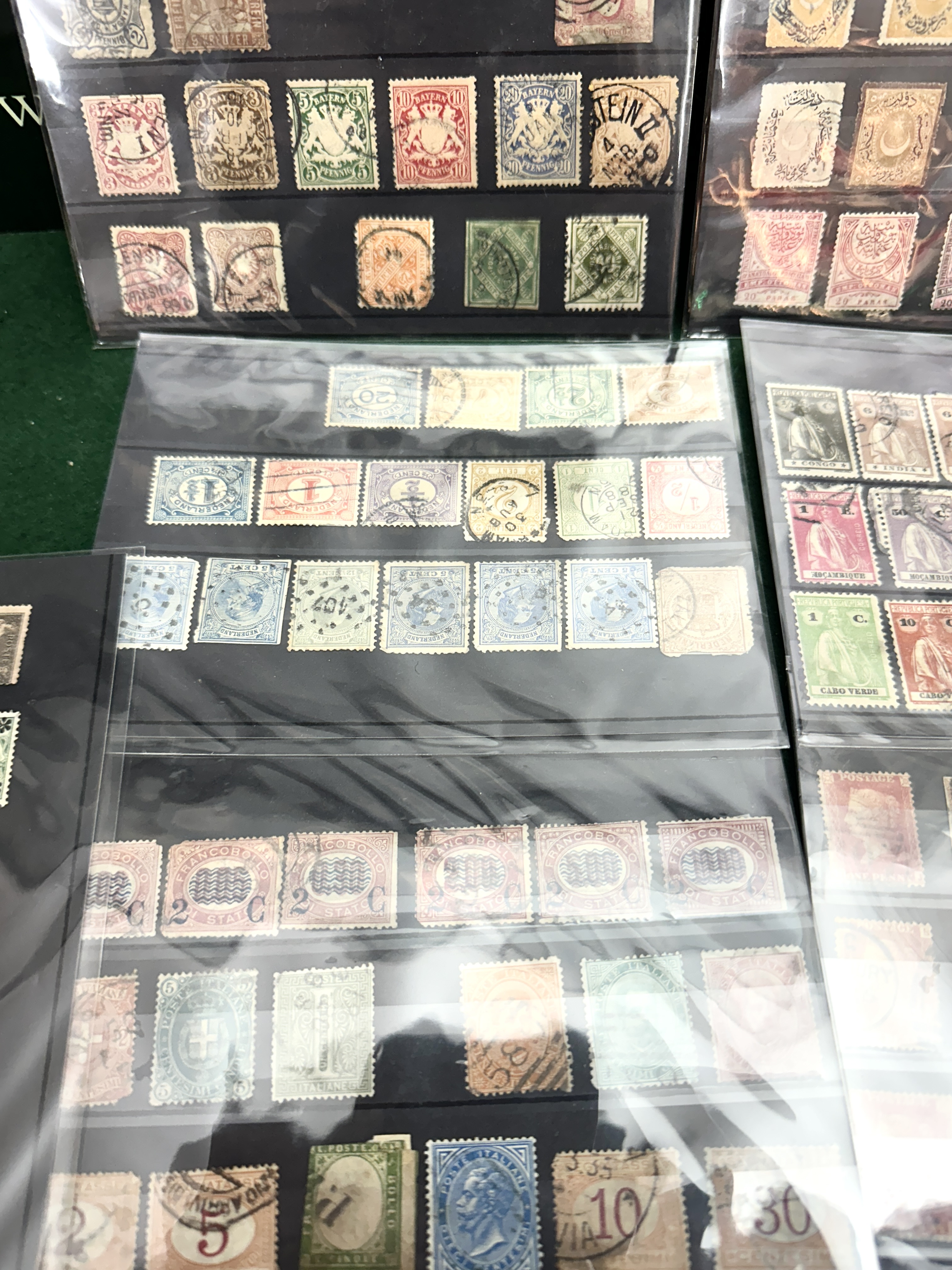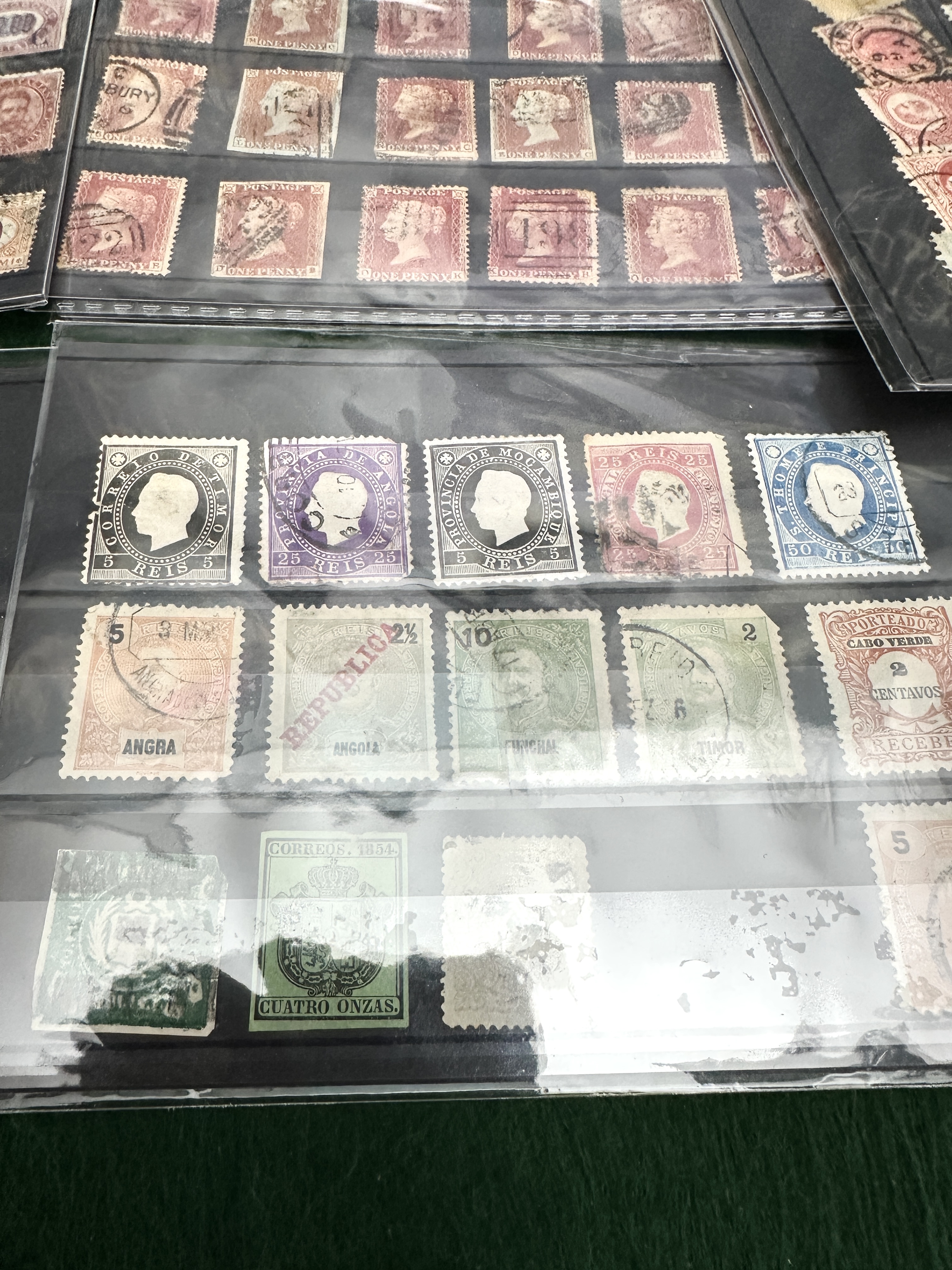 An assortment of worldwide postage stamps dating from the mid-19th to early 20th centuries, presented on several stock cards. The collection features a significant representation of UK Victorian issues, specifically Penny Red definitives bearing various postal cancellations including BURY and numeral 194. Spanish colonial issues are present for the Philippines and Cuba, including denominations of 5 Centavos and 5 C. De Peso, with some examples carrying the IMPTO DE GUERRA war tax overprints. Portuguese colonial territories represented include Angola, Mozambique, Cape Verde, Timor, St. Thomas and Prince, Guinea, Angra, and Funchal, largely featuring King Carlos I types with red REPUBLICA overprints. Other notable areas include the Ottoman Empire with crescent and star motifs, Bavaria coat of arms issues, Italy, and the Netherlands. The lot includes an early Spain 1854 Cuatro Onzas official issue in green. The stamps are predominantly perforated and used, displaying a variety of postal markings including circular date stamps, barred cancels, and numeral cancels such as 401 on Dutch issues.