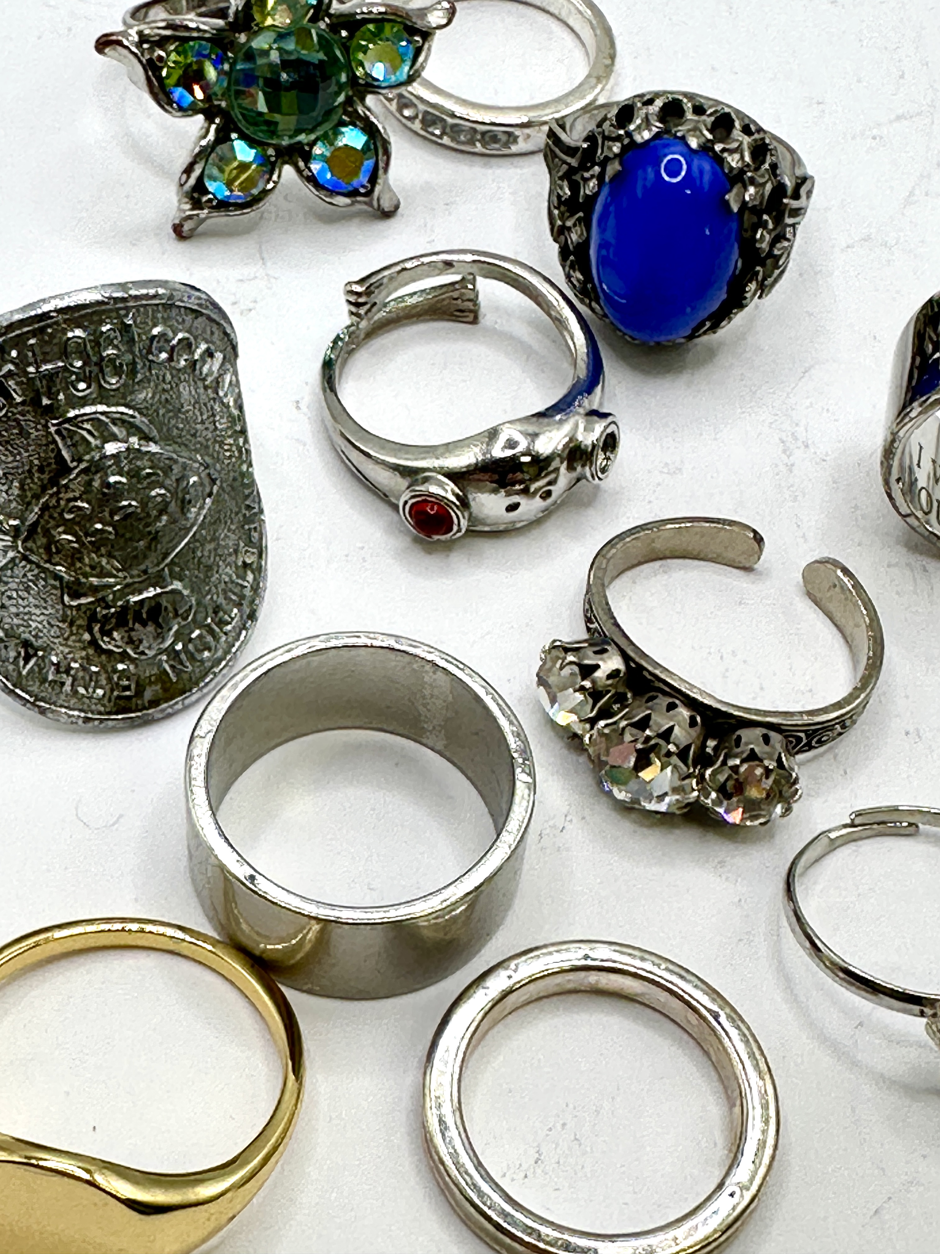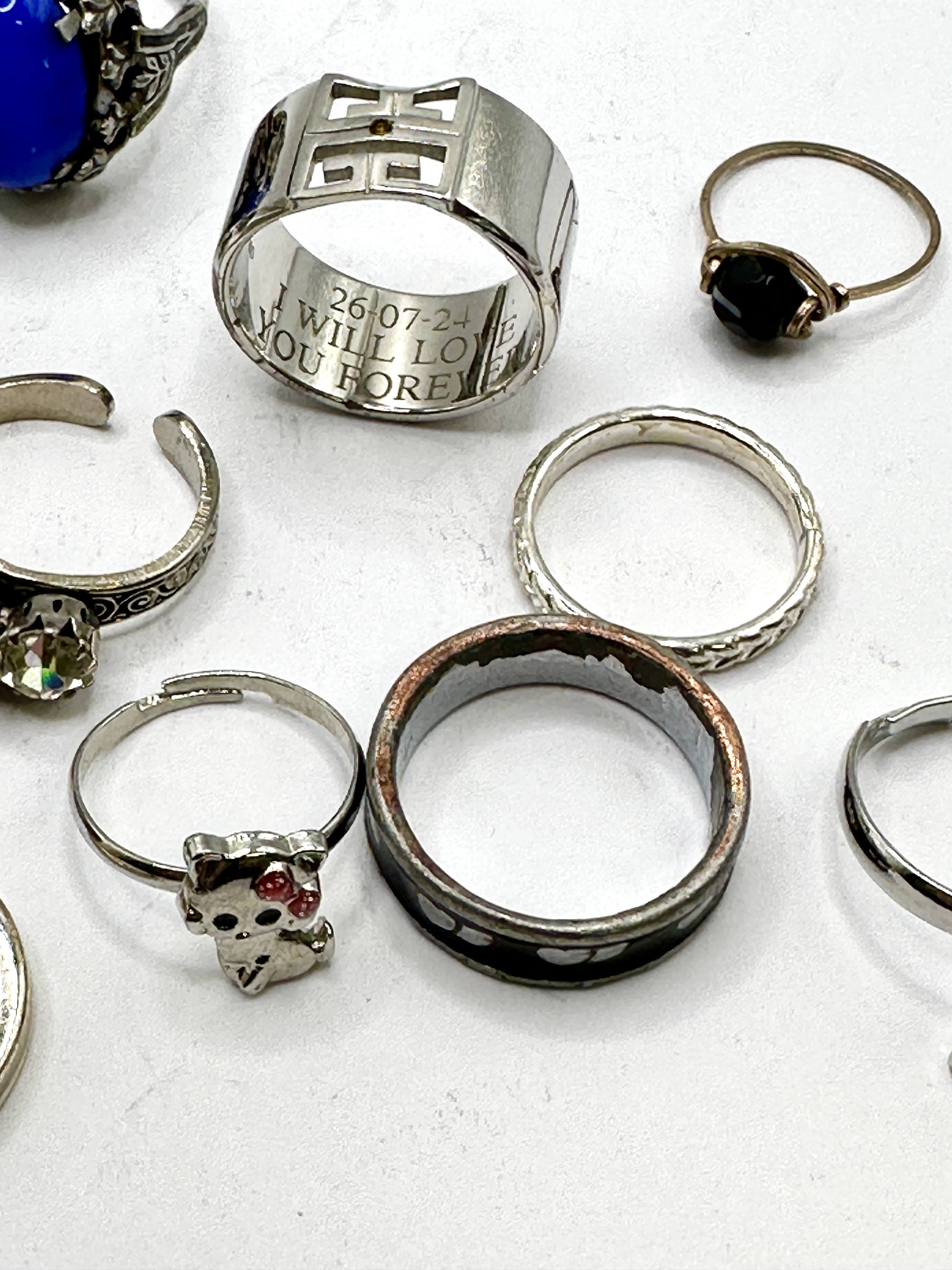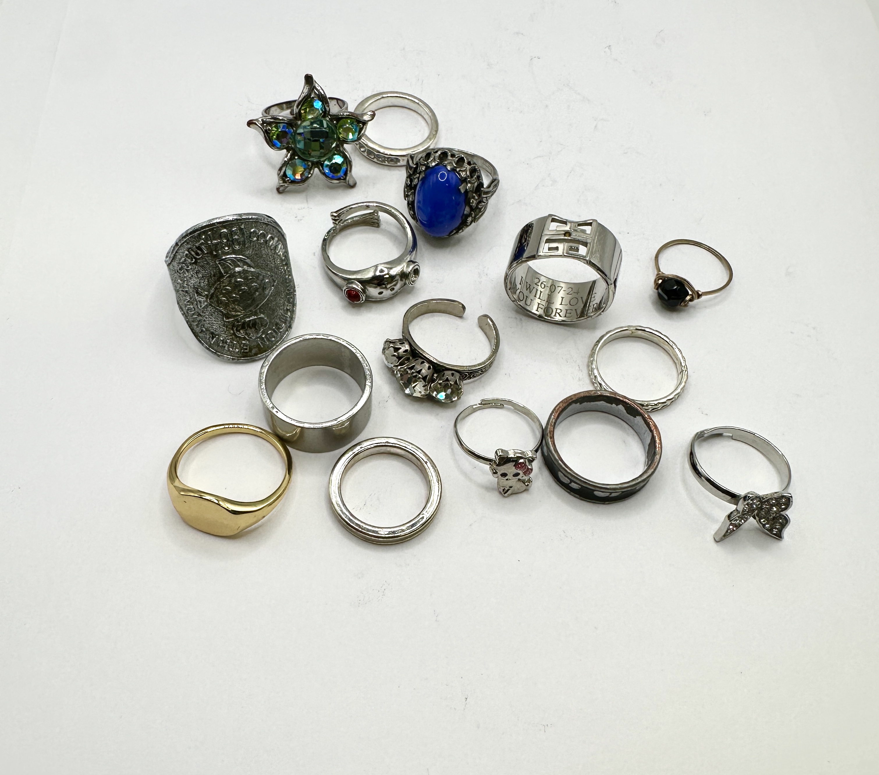 An assortment of costume jewellery rings in various styles, materials, and finishes. The collection includes a large cast white metal commemorative shield-style ring featuring a textured face embossed with London 1988 and partial text appearing to read South Con Ethna. A wide polished silver-toned band with a geometric cutout design bears an interior engraving reading 26-07-24 I WILL LOVE YOU FOREVER. The lot features several decorative cocktail rings, including a star-shaped design set with blue and green Aurora Borealis faceted crystals in claw settings, and an ornate openwork gallery ring set with a large oval blue cabochon. Novelty designs include an adjustable frog motif ring with red stone eyes and a feline character ring with red accents. Further items include a gold-toned signet-style ring, a wire-wrapped ring with a black cabochon, a three-stone adjustable ring with clear faceted stones, and various plain, textured, and patterned bands. The materials consist of assorted base metals with silver-toned and gold-toned plating; stones appear to be glass, crystal, or synthetic. No precious metal hallmarks are visible.