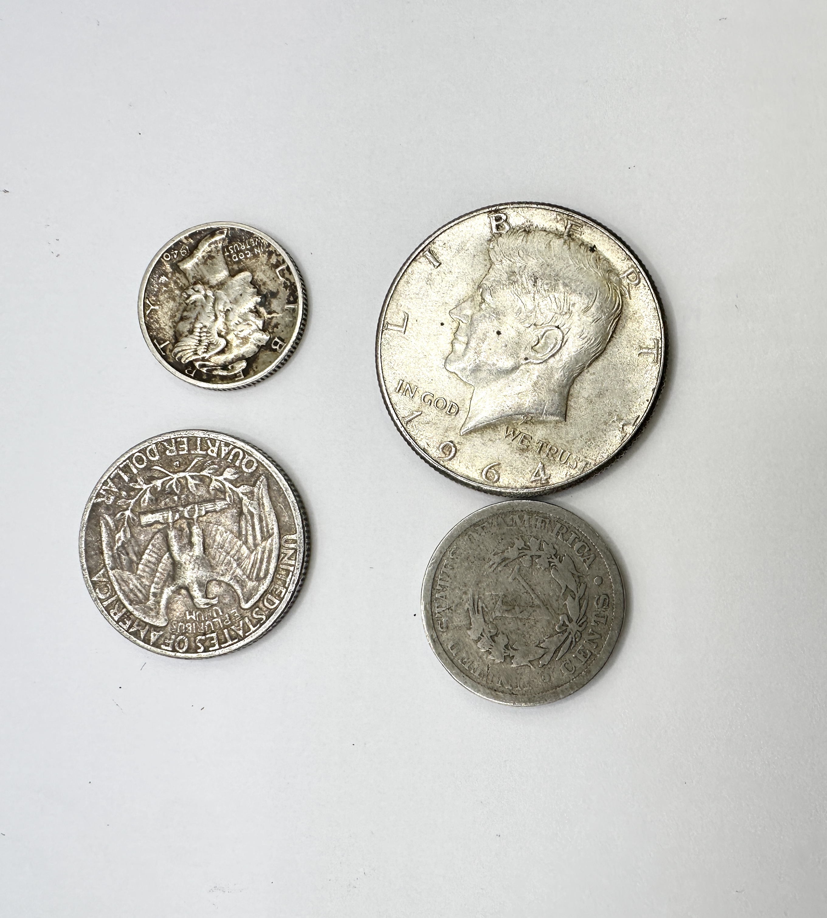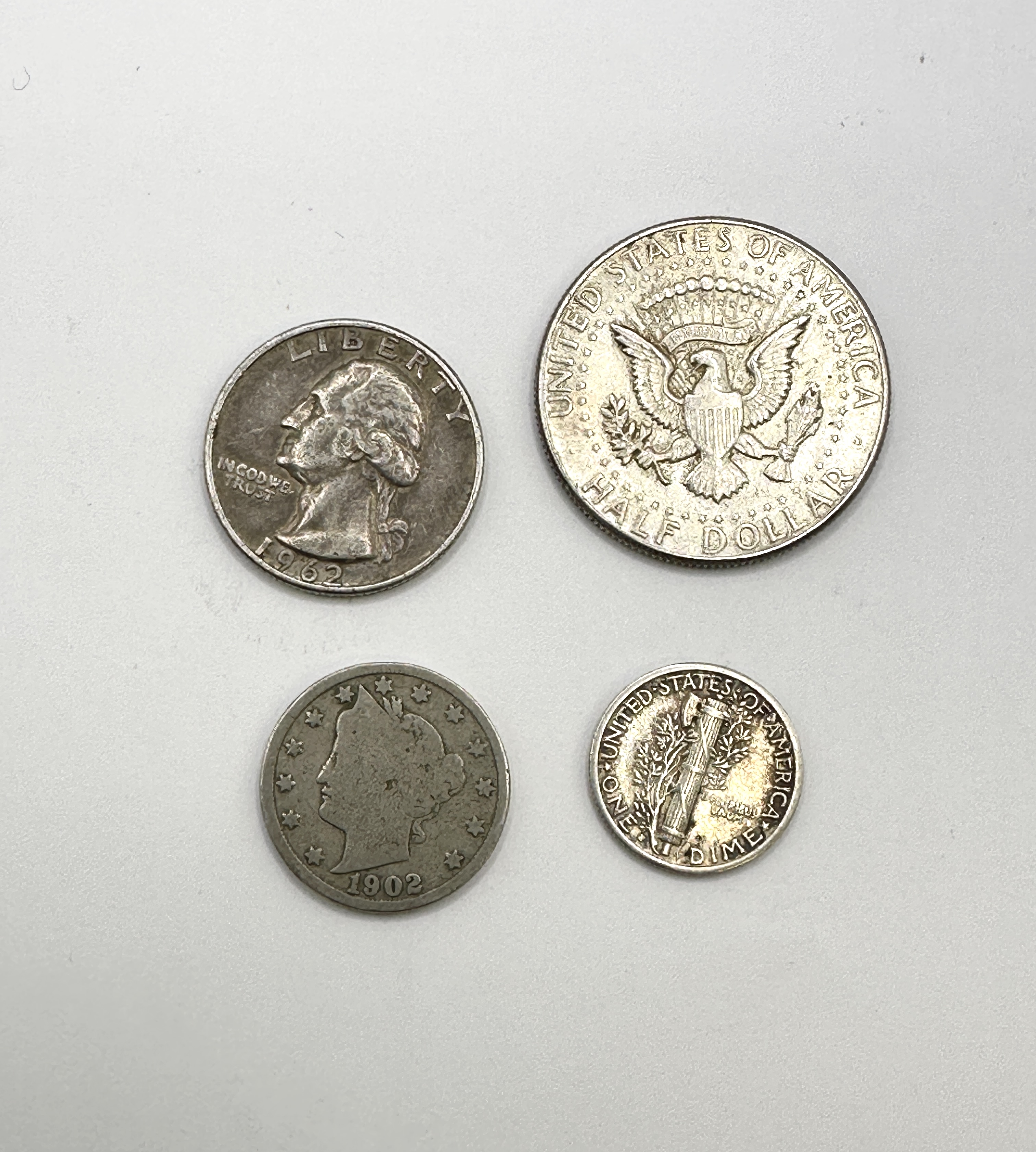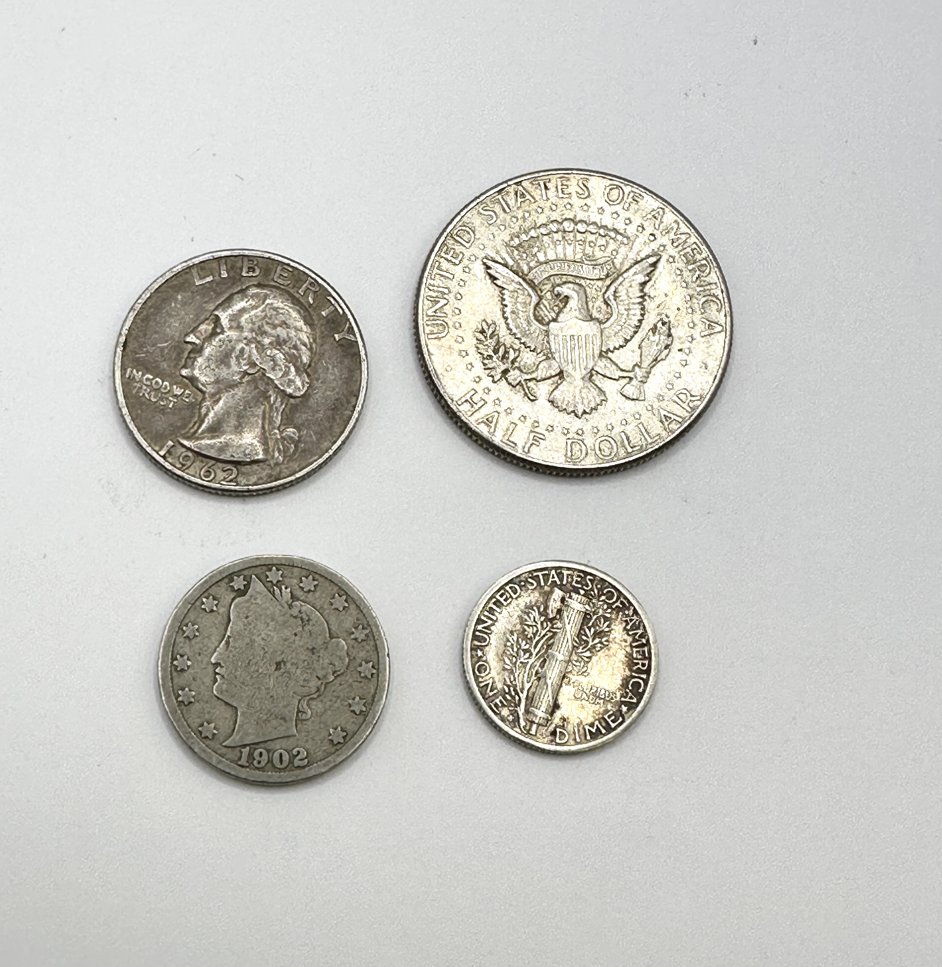 A collection of US coins comprising silver and copper-nickel denominations. The group includes a 1964 Kennedy half dollar struck in 0.900 fine silver at the Denver Mint, featuring a D mint mark on the reverse. Also present is a 1962 Washington quarter in silver from the Denver Mint and a 1940 Mercury dime in silver, also from the Denver Mint. The collection is completed by a 1902 Liberty Head nickel struck in copper-nickel alloy. The silver denominations feature reeded edges, while the nickel has a plain edge. The 1964 Kennedy half dollar represents the only year this design was produced in 90 percent silver for general circulation.