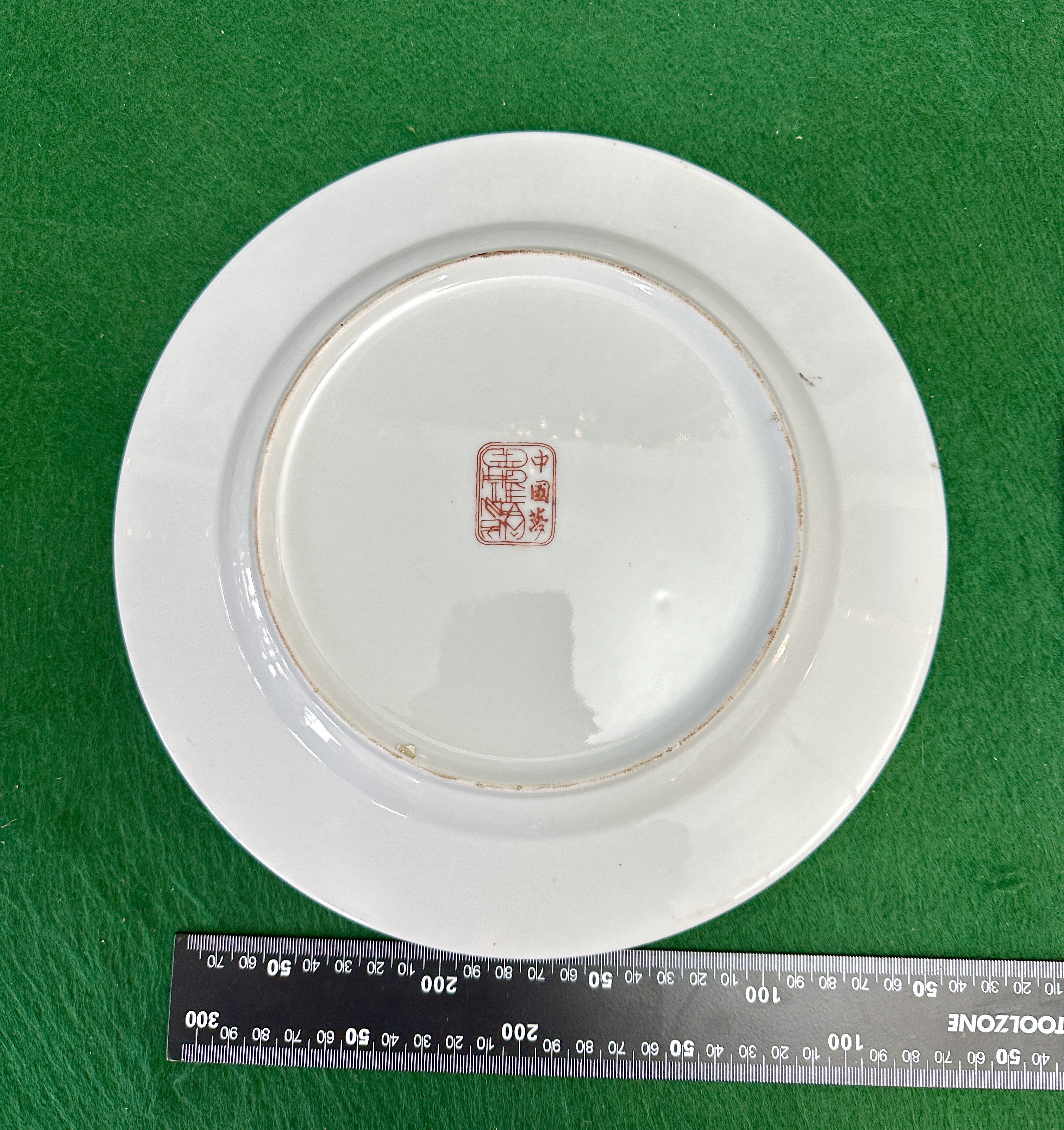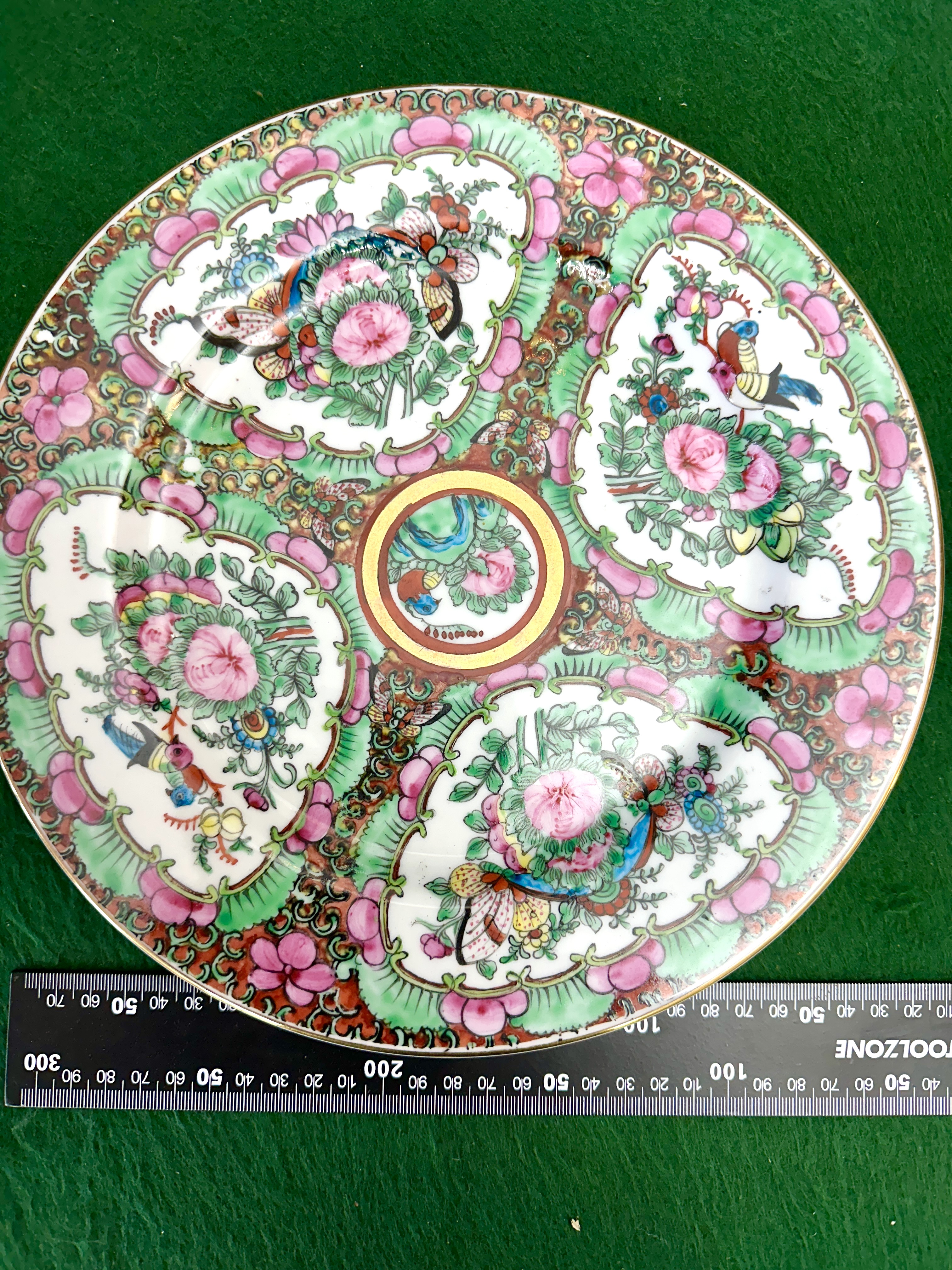 A Chinese porcelain plate decorated in the Rose Medallion pattern. The decorative scheme features a central floral medallion encircled by four panels depicting birds, butterflies, and peonies, with gilt highlights throughout. The reverse side is marked with a red stamped seal for Jingdezhen, China, and includes the text MADE IN CHINA.
