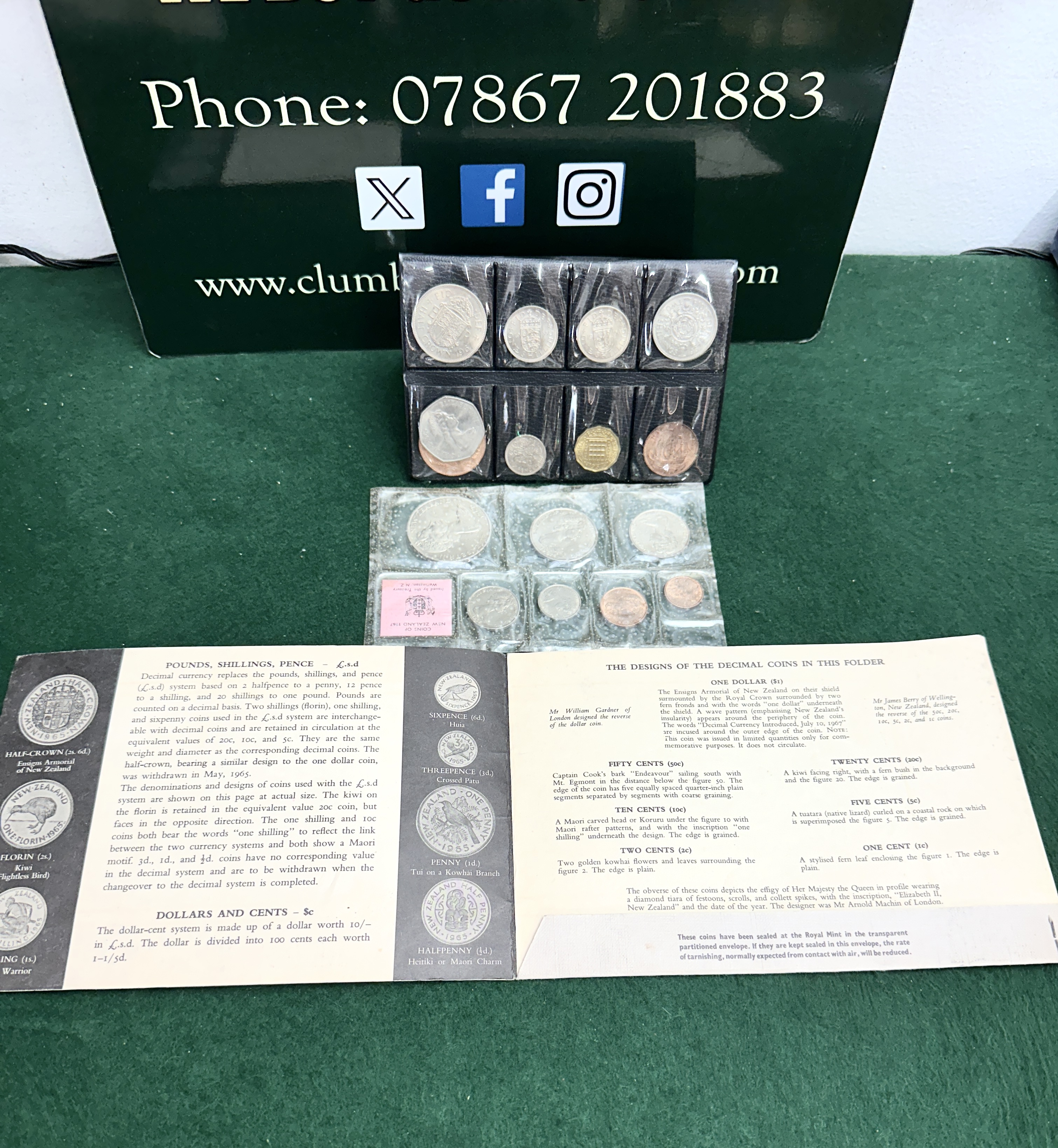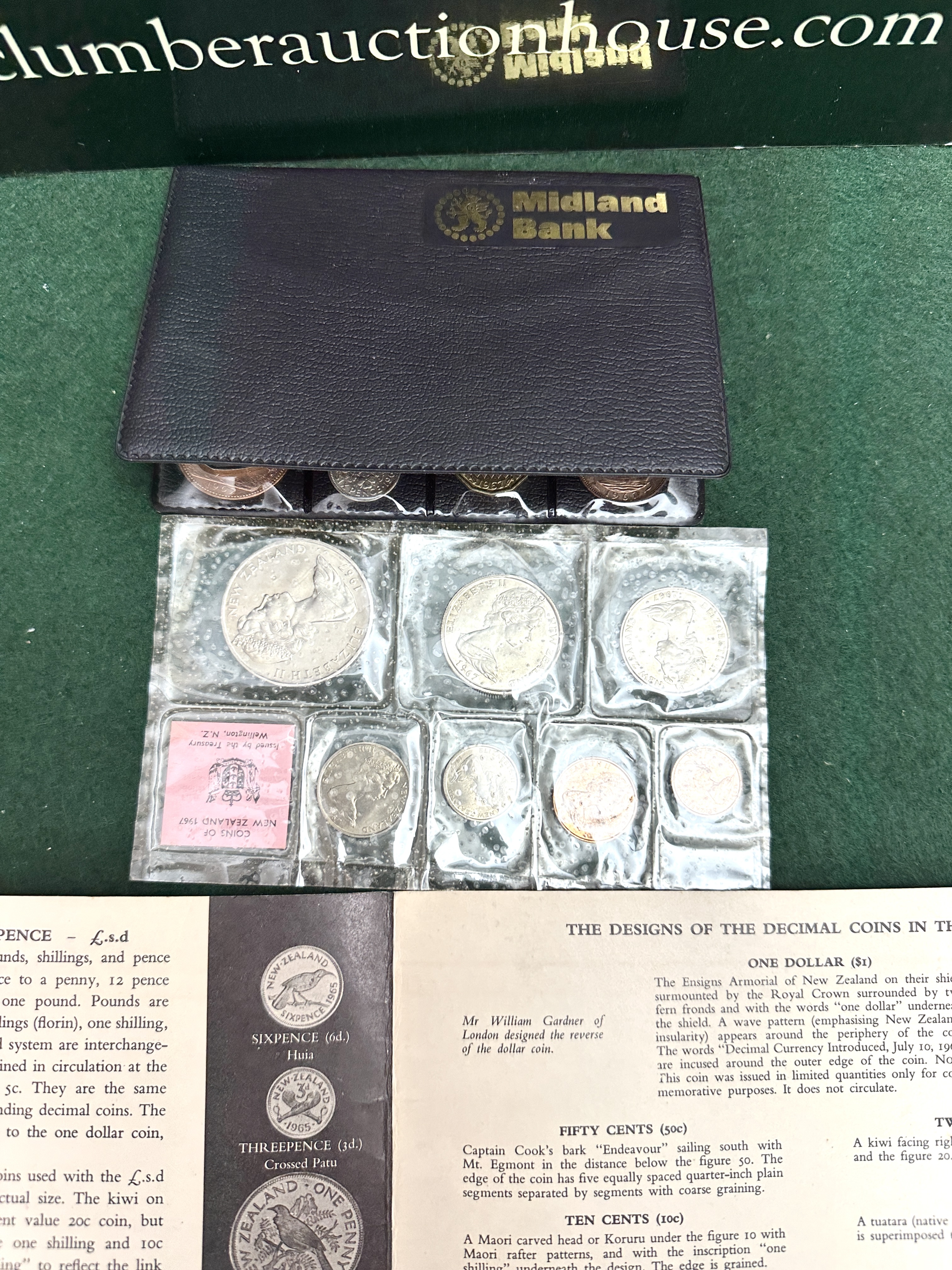 Coins generally appear in uncirculated or proof-like condition as issued. Natural light toning is present on several specimens, particularly the bronze and brass issues. Minor storage wear, light scuffing, and edge wear are visible on the outer Midland Bank folder and the 1970 presentation case. The New Zealand set remains in its original factory-sealed plastic packaging.
