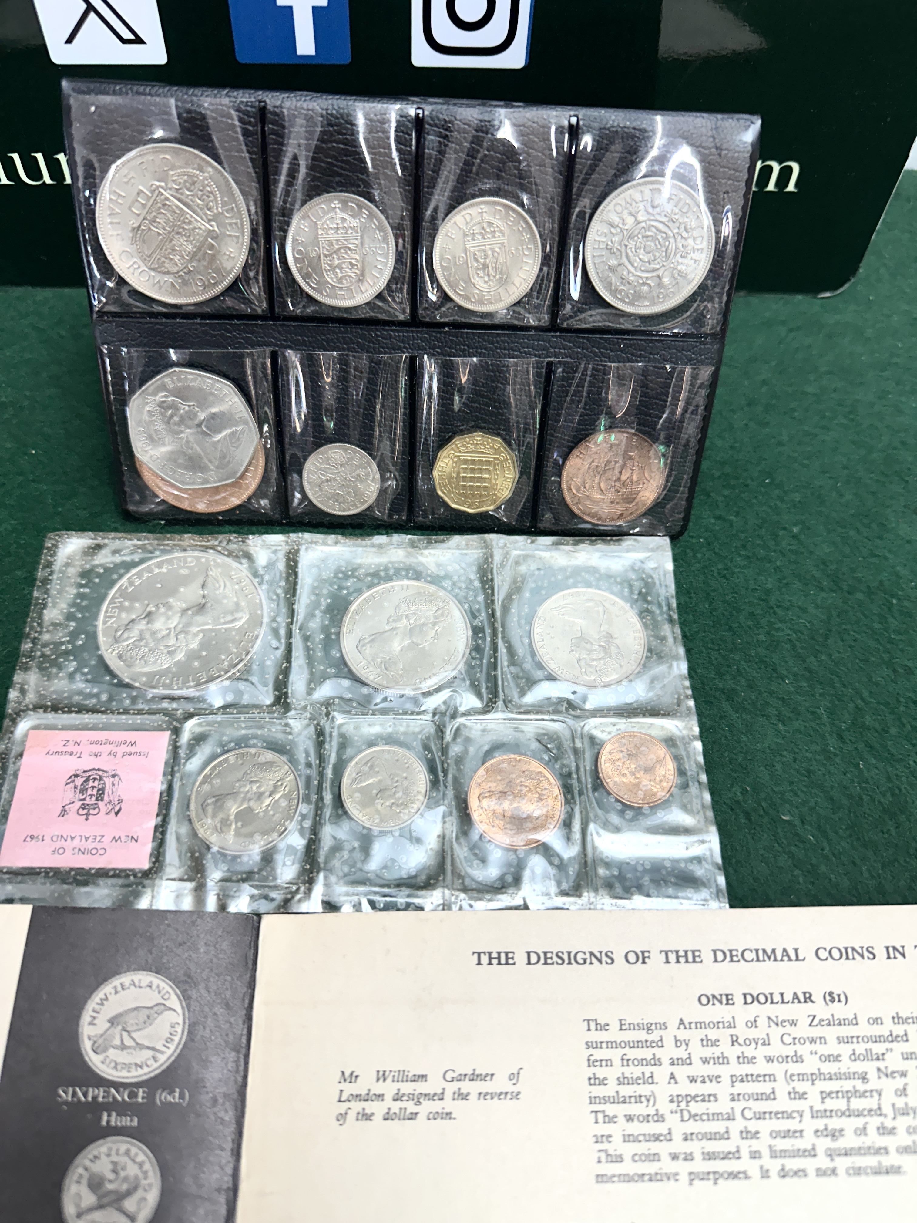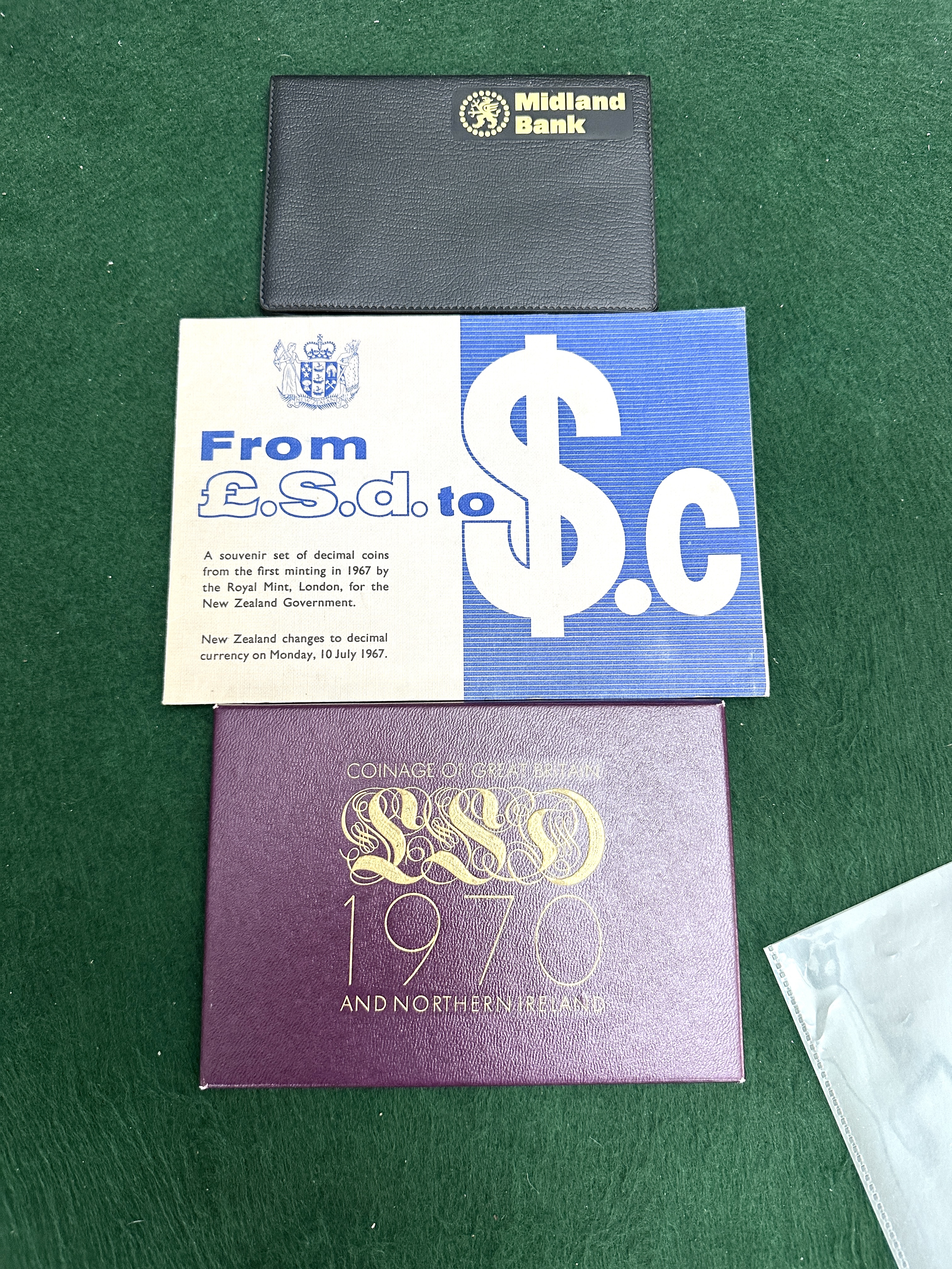A collection of numismatic sets comprising UK and New Zealand coinage from the mid-to-late 20th century. The lot includes a UK pre-decimal and early decimal transition set presented in a black textured Midland Bank folder, containing eight coins including a 1967 Half Crown, 1965 Florin, and 1969 Ten New Pence, featuring the Machin portrait of Queen Elizabeth II on the obverse and various heraldic motifs on the reverse. Also present is a 1967 New Zealand decimal currency souvenir set, commemorating the changeover from pounds, shillings, and pence to decimal currency on 10 July 1967. This set is sealed in its original transparent partitioned plastic envelope as issued by the Royal Mint, London, and includes a commemorative One Dollar coin featuring the Ensigns Armorial of New Zealand with an incused edge inscription, alongside denominations from 50 cents down to 1 cent, accompanied by the original descriptive gatefold pamphlet. The collection is completed by a Coinage of Great Britain and Northern Ireland 1970 proof set, housed in the original purple textured presentation case with gold-leaf lettering, representing the final year of pre-decimal coin production.