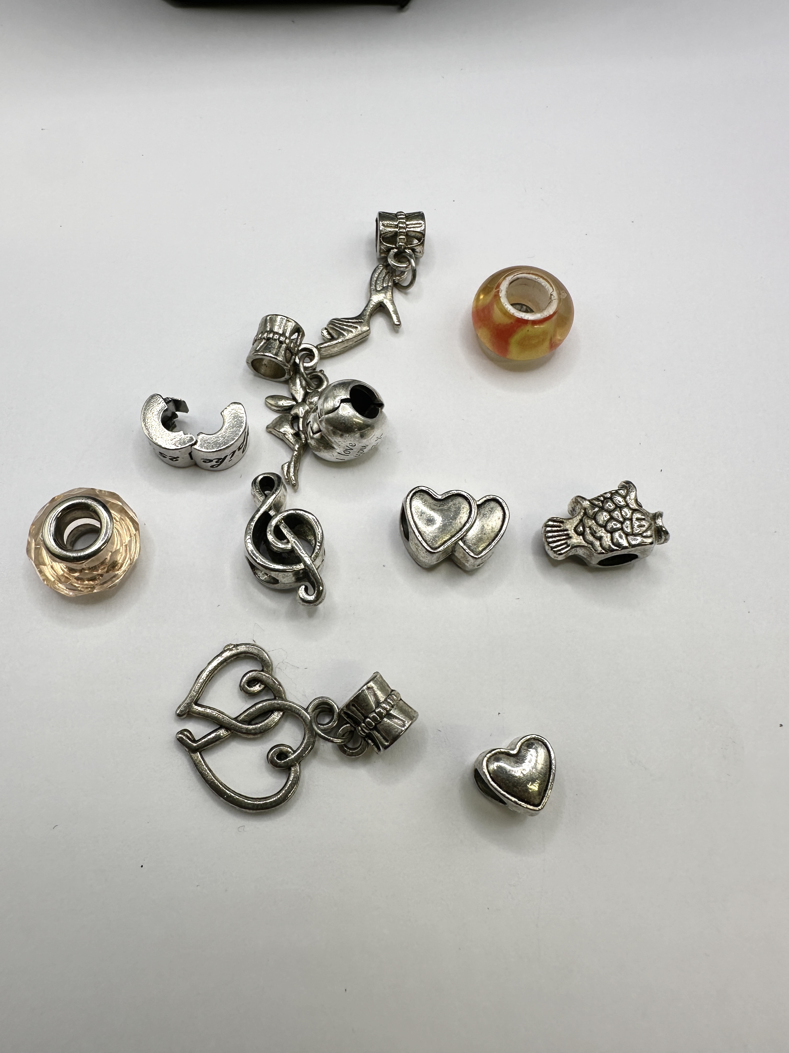 A collection of 925 silver and glass charms and beads designed for use with modular-style jewellery systems, in the style of makers such as Pandora. The assortment includes glass beads, featuring a faceted pale pink example and a lampworked design with orange and yellow swirl patterns, both fitted with 925 silver cores. The silver components comprise a variety of designs including a treble clef, a dangling high-heel shoe, a dangling pendant with intertwined openwork hearts, a dangling orb-shaped charm, a fish-shaped bead, a double-heart spacer, a single heart spacer, and a hinged clip bead. The hinged clip bead bears the partial inscription ike 2, and the orb-shaped pendant is inscribed with the words love you. Several items feature small incised marks on the bails or bodies.