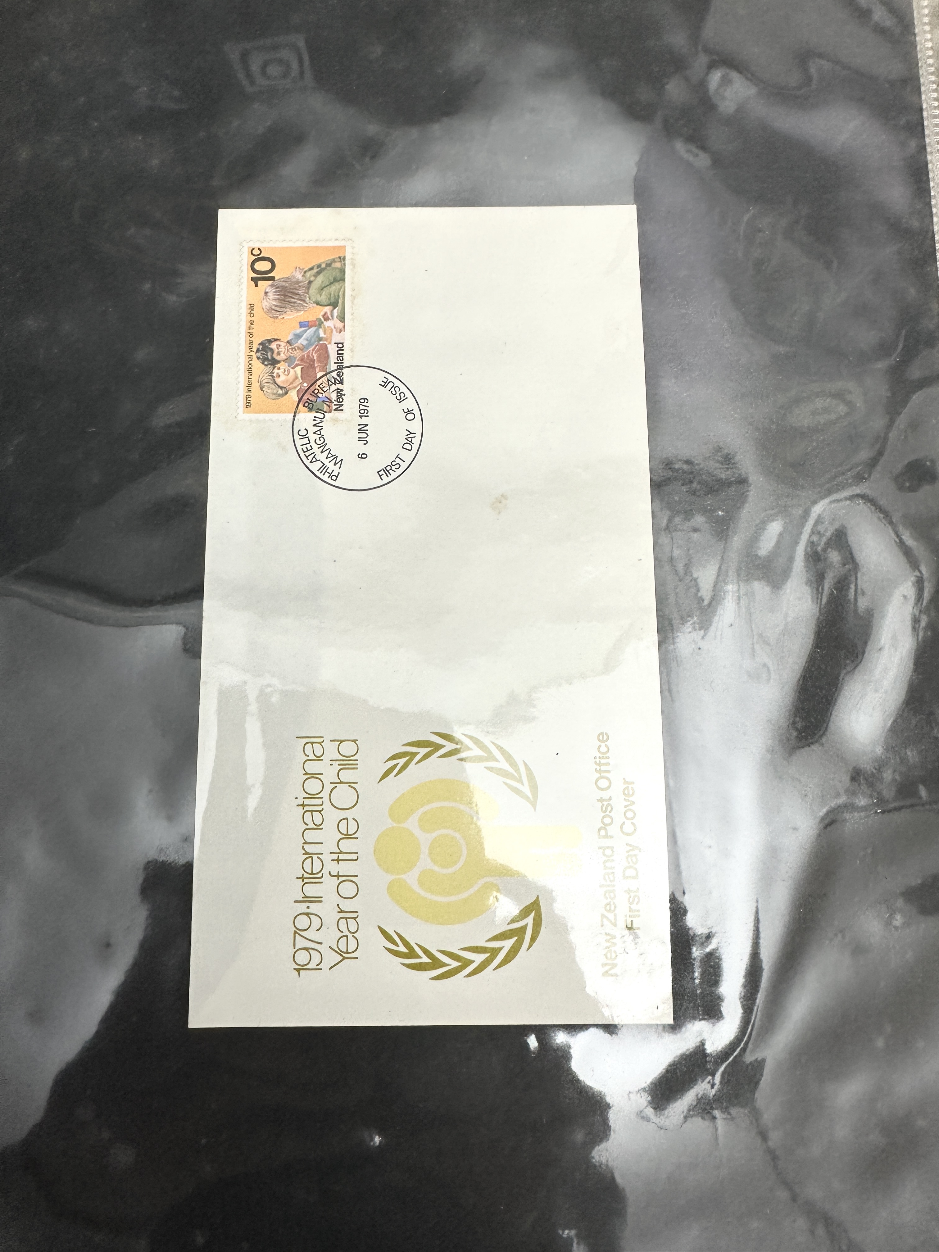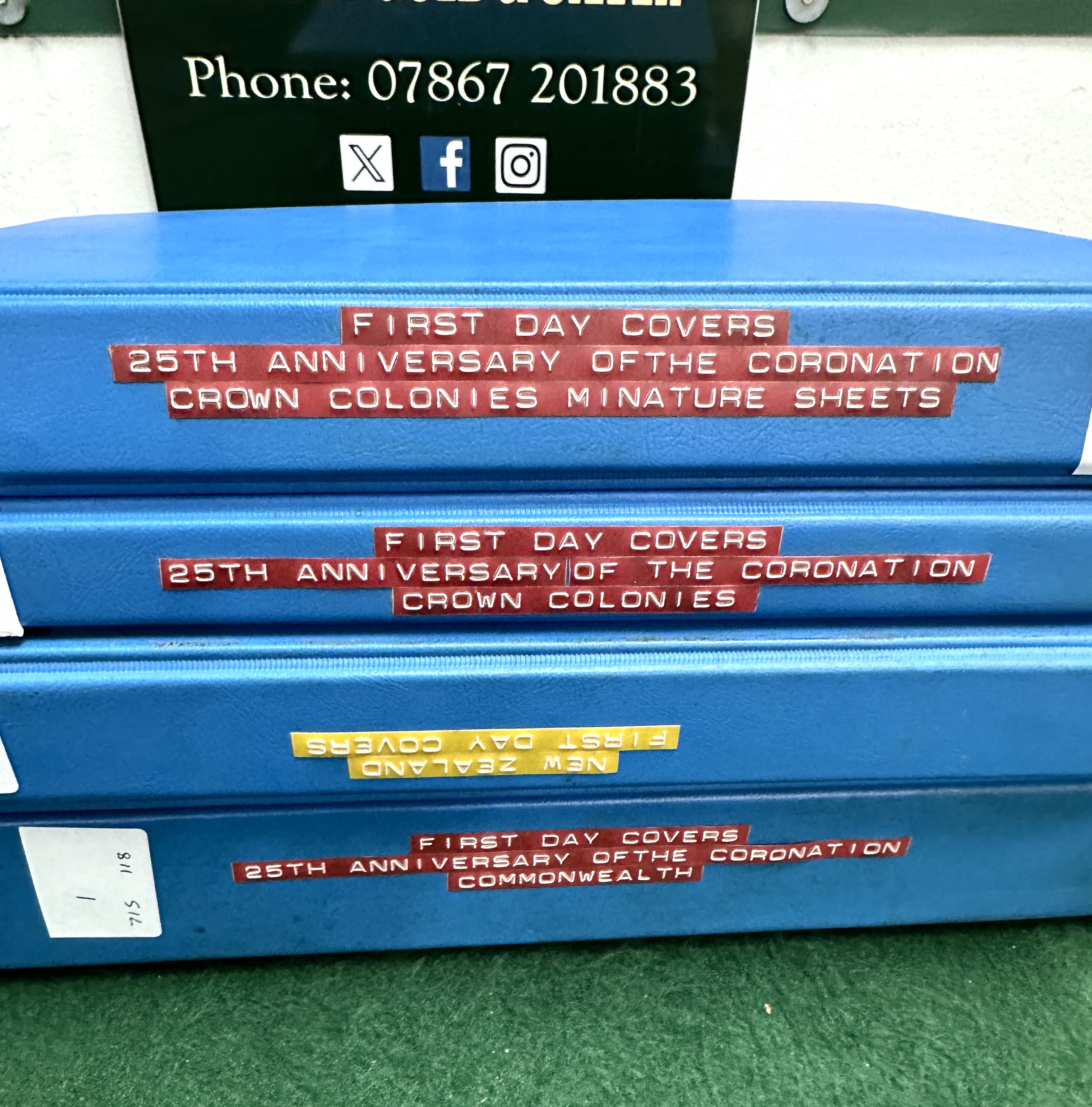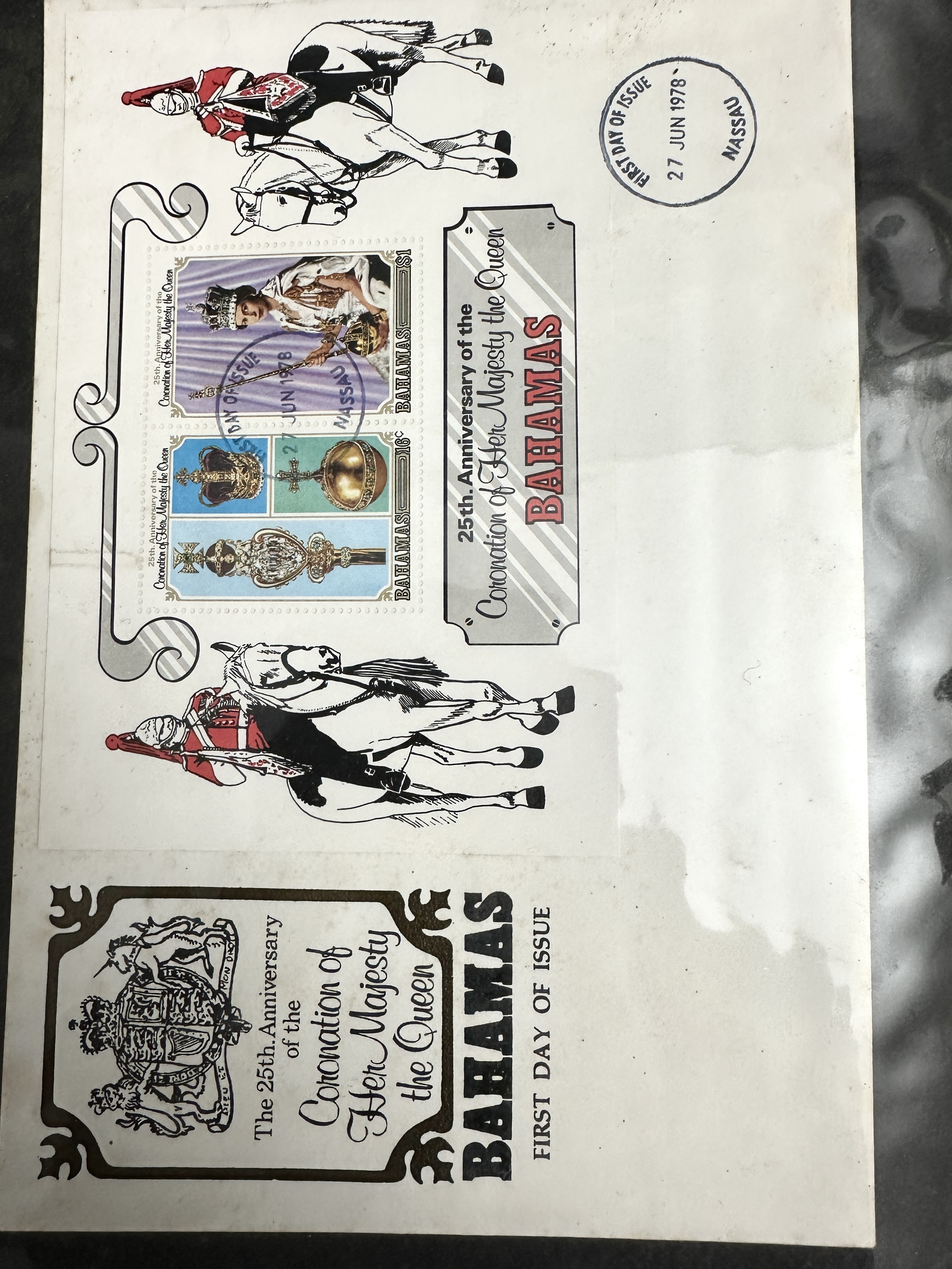 A collection of philatelic materials comprising First Day Covers and miniature sheets, primarily commemorating the 1978 25th Anniversary of the Coronation of Queen Elizabeth II. The items are housed in blue binders with embossed adhesive labels identifying contents as Crown Colonies, Commonwealth, and New Zealand First Day Covers. The collection includes issues from various Commonwealth territories and Crown Colonies, including a Bahamas miniature sheet First Day Cover dated 27 June 1978 and a Samoa i Sisifo First Day Cover. A dedicated binder contains New Zealand First Day Covers, including the 1979 International Year of the Child issue dated 6 June 1979. The stamps are perforated and the covers feature printed cachets and circular date stamp cancellations. The materials are stored in clear plastic pocket pages.