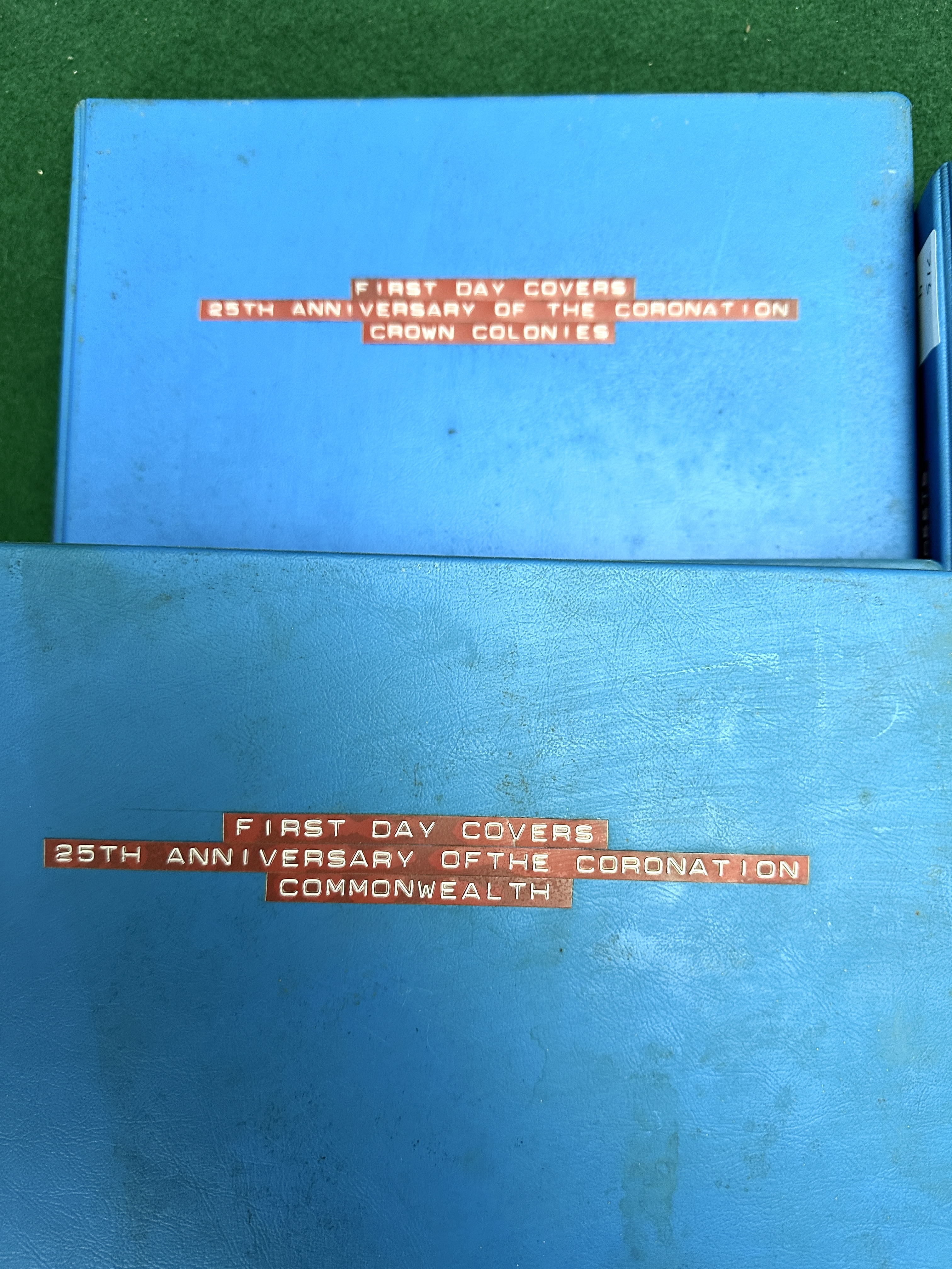 The binders show moderate surface wear, scuffing, and some accumulation of dust. The First Day Covers and miniature sheets are generally in good condition, though some envelopes show evidence of light toning and minor foxing. Cancellations are clear and mostly do not obscure the primary stamp designs. Stamps appear to have good centring and intact perforations.