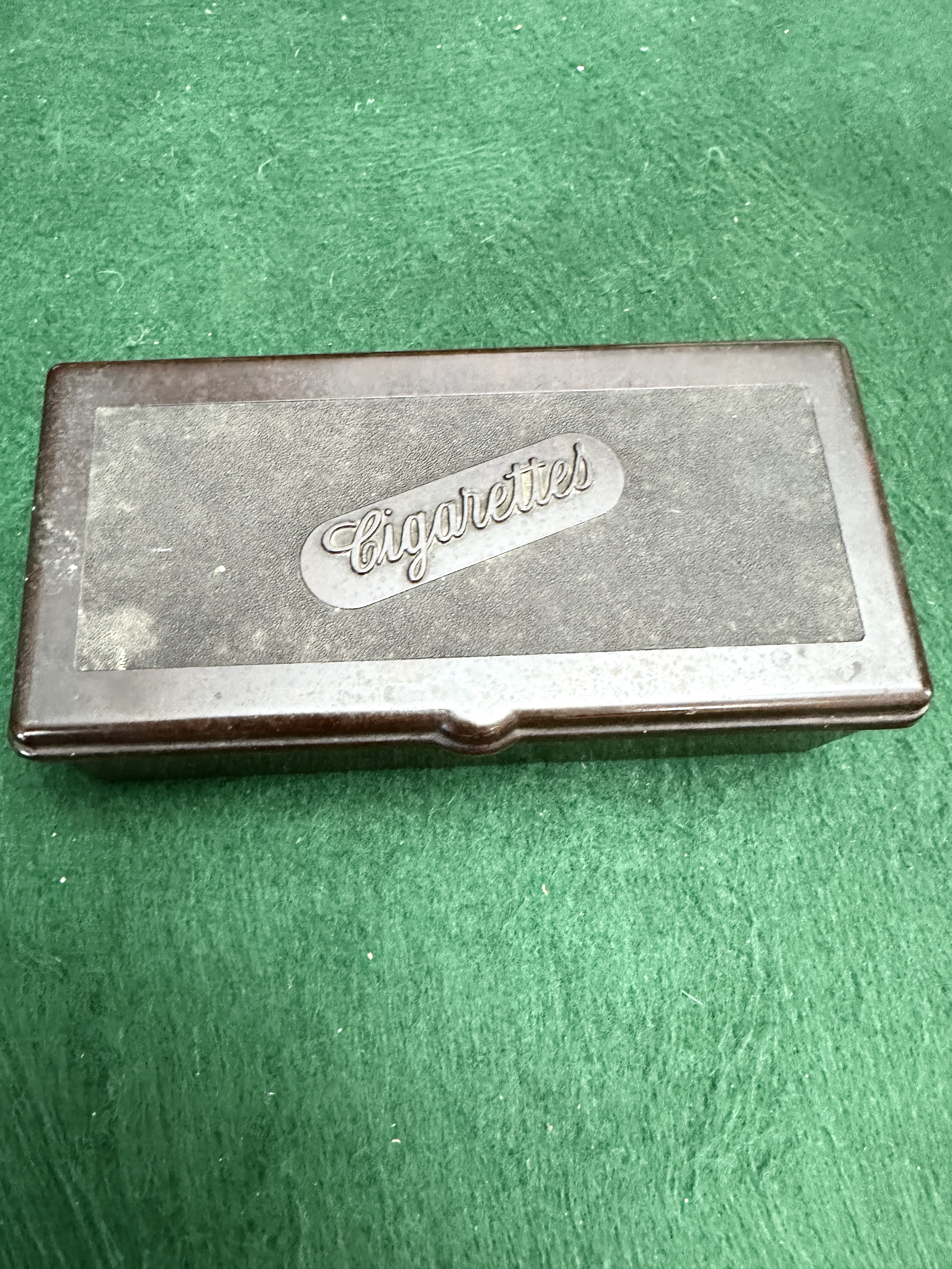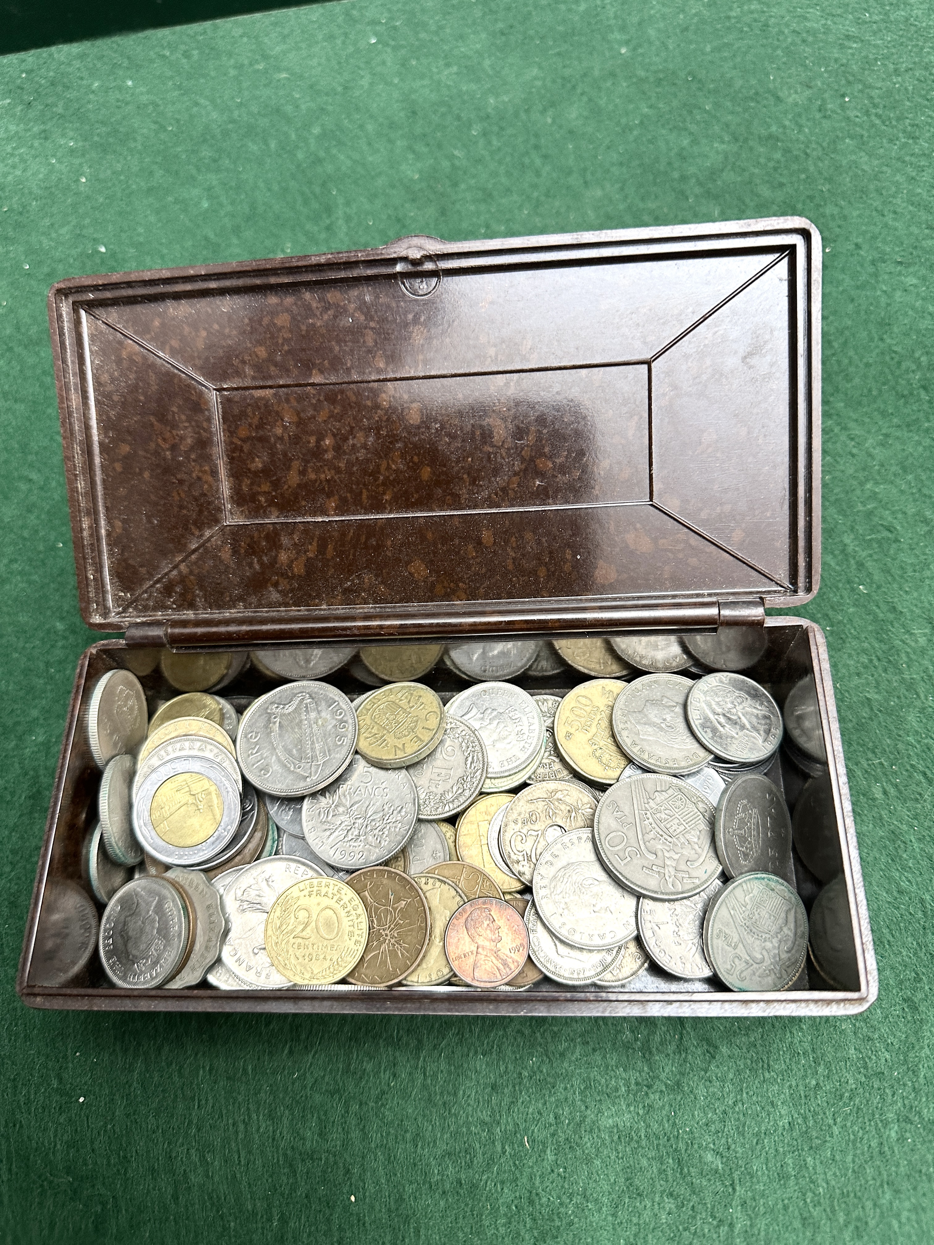 A collection of international base metal coins presented in a rectangular brown mottled plastic case. The lid of the case features a raised oval plaque with the script inscription Cigarettes. The numismatic lot includes several issuers and denominations, notably: FR cupro-nickel 5 Francs dated 1992 and brass 20 Centimes dated 1984 inscribed LIBERTE EGALITE FRATERNITE; ES cupro-nickel Juan Carlos I 50 Pesetas and 25 Pesetas inscribed REY DE ESPANA; IE cupro-nickel coinage dated 1995 inscribed EIRE; UK cupro-nickel Elizabeth II coinage; a US copper-plated zinc Lincoln cent dated 1999; and an IT bimetallic coin. The collection comprises various compositions including cupro-nickel, brass, copper-plated zinc, and bimetallic alloys. Most European issues represent the final decades of national currency circulation prior to the adoption of the Euro.