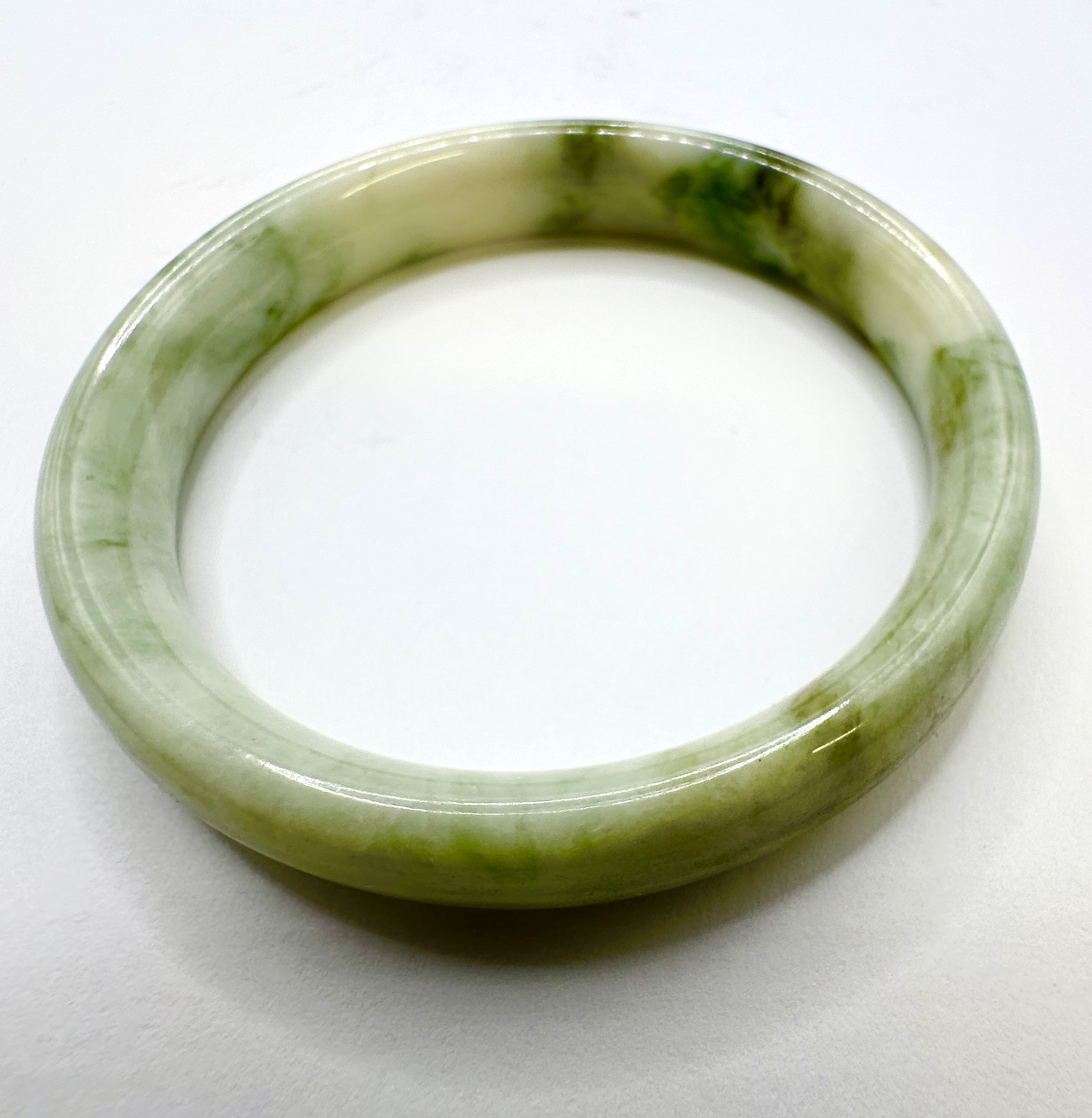 A solid circular hololith slip-on bangle carved from a single piece of variegated stone. The material, identified as jade, displays a palette of pale celadon and off-white with darker moss-green mottled inclusions. The bangle features a rounded D-shape profile and a high-lustre polished finish. No characters, symbols, or maker marks are visible on the surface. The item is accompanied by a cream-coloured textile drawstring pouch featuring a repeating geometric key-pattern and black cord ties with gold-toned finials. Stone bangles of this type are frequently associated with East Asian jewellery traditions. Prospective purchasers are advised that without gemological testing, the exact mineral composition and any potential colour treatments cannot be definitively confirmed.