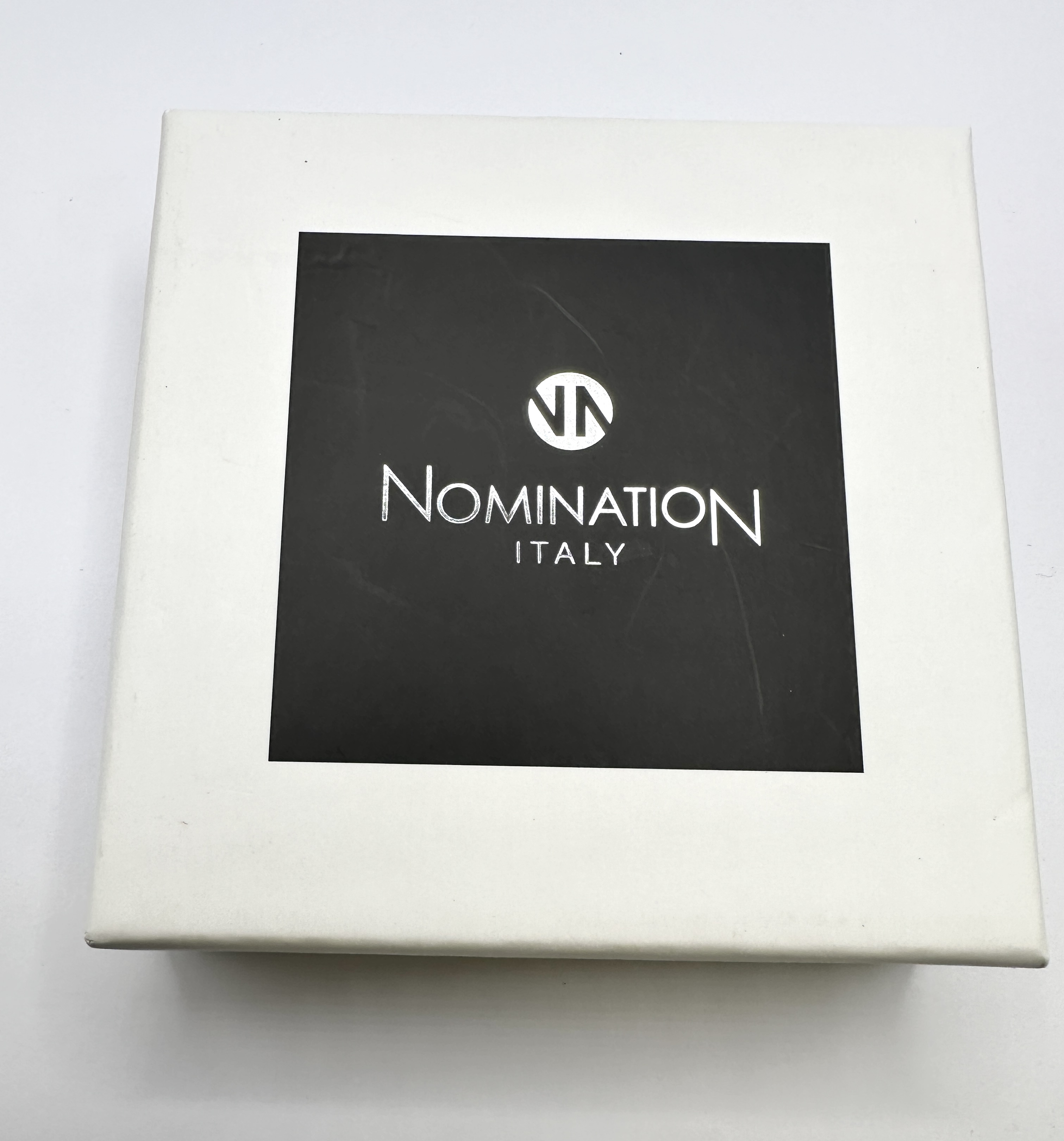 A stainless steel modular stretch-link bracelet by Nomination Italy. The bracelet features a central polished bar element with a circular pavé-set motif. This central motif is set with numerous small, clear round-cut stones. The construction consists of individual spring-loaded links, characteristic of the brand’s modular design. The interior of the links and the reverse of the central bar are stamped with the maker’s mark NOMINATION and the material mark ST. STEEL. The bracelet is accompanied by a branded Nomination Italy presentation box.