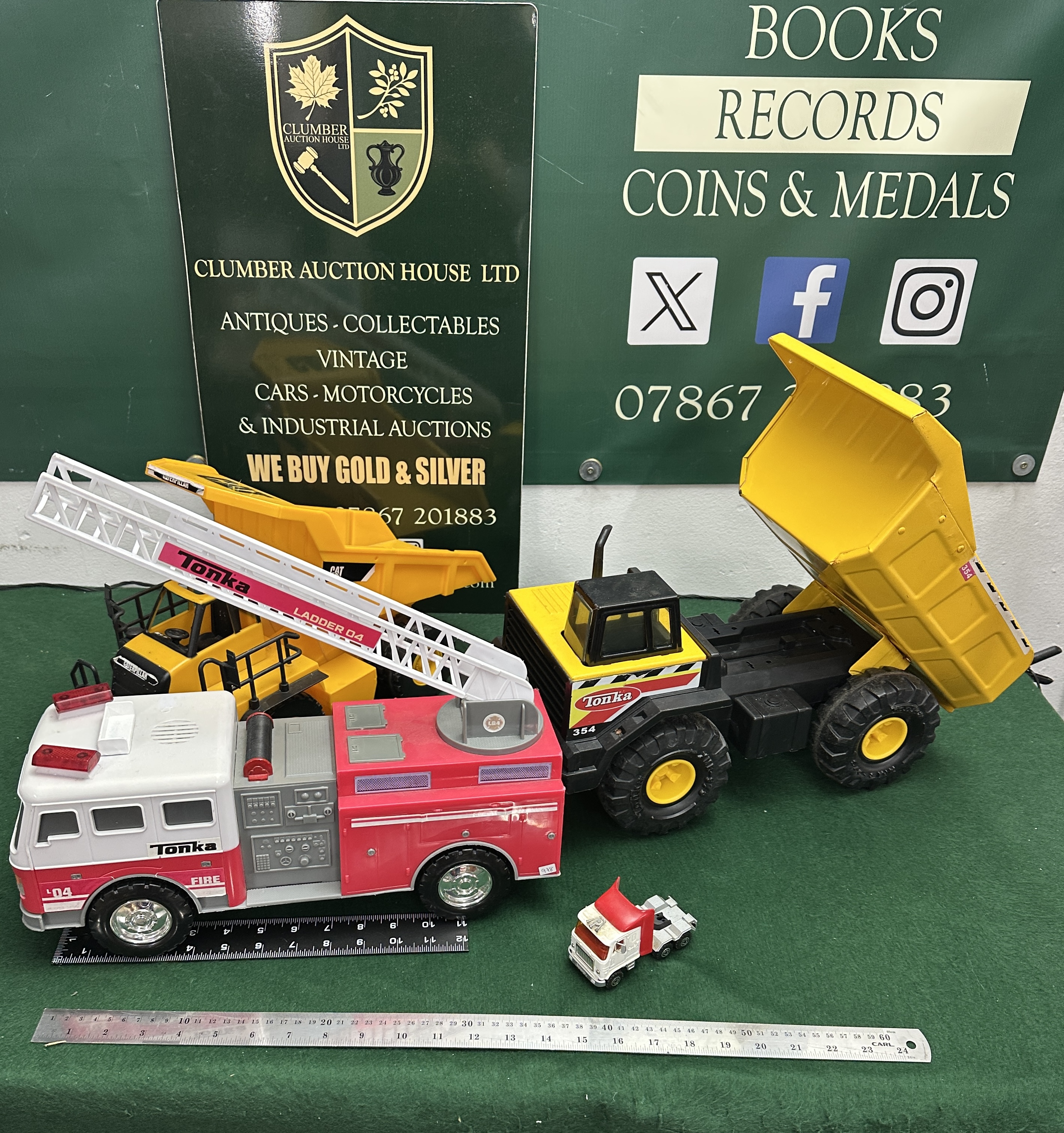 A collection of toy vehicles including several large-scale models and a smaller tractor unit. The lot features a Tonka fire engine with a plastic body, chrome-effect plastic wheel hubs, and rubber-like tyres, equipped with a rotating and extendable white plastic ladder and buttons for light and sound functions. Also included is a Tonka articulated dump truck, model number 354, featuring a pivoting chassis and manual tipping rear bed. A Caterpillar and Tonka branded rigid-frame mining dump truck is included, featuring a manual tipping bed and Caterpillar decals. The collection is completed by a small unattributed semi-truck tractor unit of die-cast metal and plastic construction. Markings include Tonka labels, embossed tyres, and Caterpillar branding.